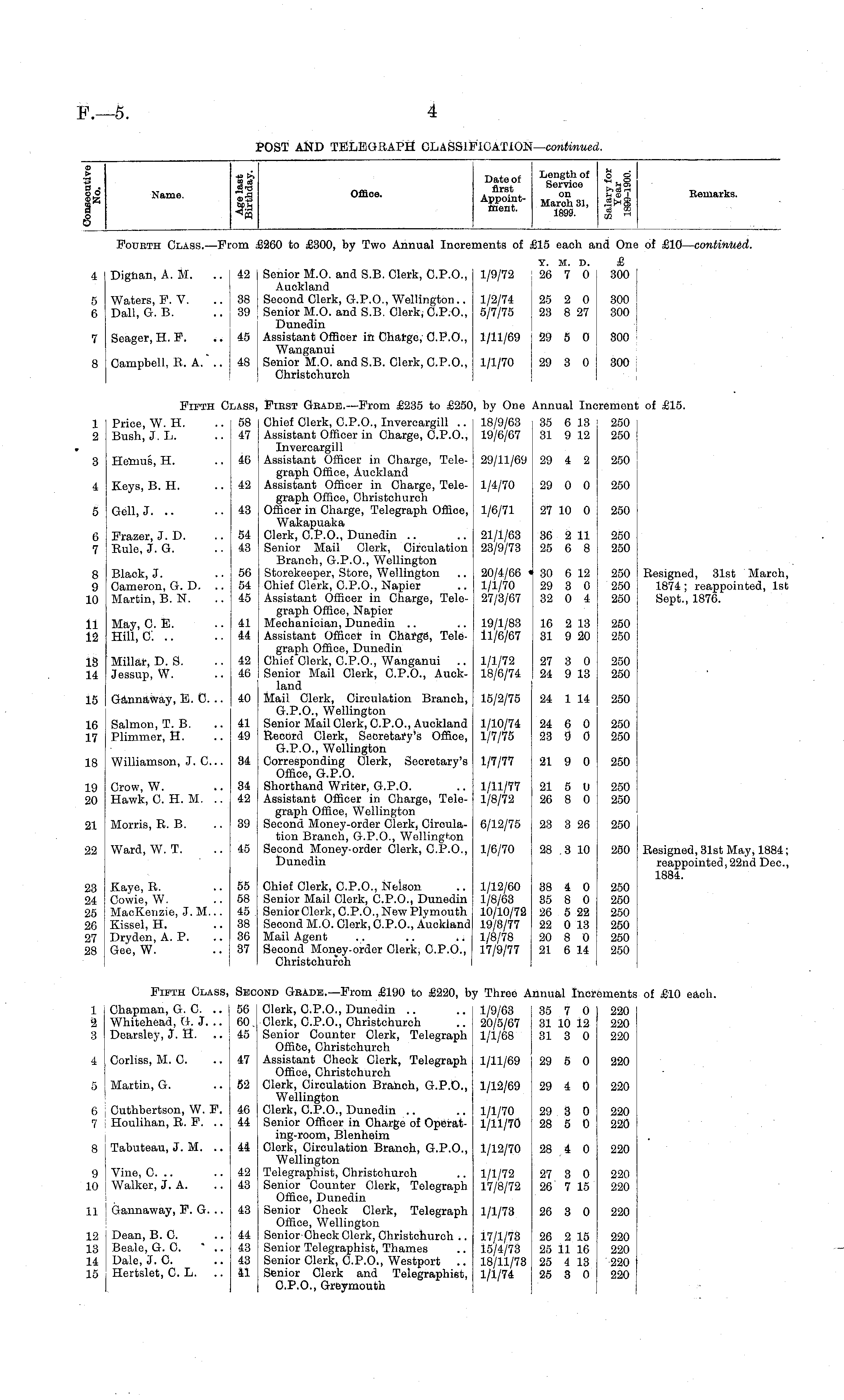 CD > q3 d 6 Name. Office. Date of first Appointment. Length of o o Service V. b m on &oT March 31, ,2 5* Si 1899. $ 3 Kemarks. 4 Foueth Class.—From Dignan, A.M. .. | 42 S260 to £300, by Two Annual Increi Senior M.O. and S.B. Clerk, C.P.O., Auckland Second Clerk, G.P.O., Wellington.. Senior M.O. and S.B. Clerk, C.P.O., Dunedin Assistant Officer in Charge, C.P.O., Wanganui Senior M.O. and S.B. Clerk, C.P.O., Christchurch ments of 1/9/72 £15 each ai Y. M. D. 26 7 0 nd Om £ 300 of £10— continued. 5 6 Waters, F. V. .. 38 Dall, G. B. .. 39 1/2/74 5/7/75 25 2 0 23 8 27 300 300 7 Seager, H. F. .. 45 Campbell, E. A.* .. j 48 1/11/69 29 5 0 300 8 1/1/70 29 3 0 300 Fifth Class Price, W. H. .. 58 Bush, J. L. .. 47 ■ASS, 58 47 Piest Gbadb.—Prom £235 to £250 i Chief Clerk, C.P.O., Invercargill .. i Assistant Officer in Charge, C.P.O., Invercargill Assistant Officer in Charge, Telegraph Office, Auckland Assistant Officer in Charge, Telegraph Office, Christchurch Officer in Charge, Telegraph Office, Wakapuaka Clerk, C.P.O., Dunedin Senior Mail Clerk, Circulation Branch, G.P.O., Wellington i Storekeeper, Store, Wellington J Chief Clerk, C.P.O., Napier Assistant Officer in Charge, Telegraph Office, Napier Mechanician, Dunedin Assistant Officer in Charge, Telegraph Office, Dunedin Chief Clerk, C.P.O., Wanganui .. Senior Mail Clerk, C.P.O., Auckland Mail Clerk, Circulation Branch, G.P.O., Wellington Senior Mail Clerk, C.P.O., Auckland Record Clerk, Secretary's Office, G.P.O., Wellington Corresponding Clerk, Secretary's Office, G.P.O. Shorthand Writer, G.P.O. Assistant Officer in Charge, Telegraph Office, Wellington Second Money-order Clerk, Circulation Branch, G.P.O., Wellington Second Money-order Clerk, C.P.O., Dunedin I, by One 18/9/63 19/6/67 Annual Inc 35 6 13 31 9 12 sremen 250 250 of £15. 1 2 3 Hemus, H. .. 46 46 29/11/69 29 4 2 250 4 Keys, B. H. .. j 42 42 1/4/70 29 0 0 I 250 5 6 7 8 9 10 Gell, J. .. ..43 Frazer, J. D. .. 54 Rule, J. G. .. 43 Black, J. .. j 56 Cameron, G. D. .. 54 Martin, B. N. .. 45 43 54 43 56 54 45 1/6/71 21/1/63 23/9/73 20/4/66 1/1/70 27/3/67 27 10 0 36 2 11 25 6 8 30 6 12 29 3 0 32 0 4 250 250 250 250 250 250 Resigned, 31st March, 1874 ; reappointed, 1st Sept., 1876. 11 12 May, C. E. .. 41 Hill, C: .. . ■ 44 41 44 19/1/83 11/6/67 16 2 13 31 9 20 250 250 13 14 Millar, D. S. .. 42 Jessup, W. ..46 42 46 1/1/72 18/6/74 27 3 0 24 9 13 250 250 15 Gannaway, E. C. .. 40 40 15/2/75 24 1 14 250 16 17 Salmon, T. B. .. 41 Plimmer, H. .. 49 41 49 1/10/74 1/7/75 24 6 0 23 9 0 250 250 18 Williamson, J. C... 34 34 1/7/77 21 9 0 250 Resigned, 31st May, 1884; reappointed,22nd Dec, 1884. 19 20 Crow, W. .. 34 Hawk, C. H. M. .. 42 34 42 1/11/77 1/8/72 21 5 0 26 8 0 250 250 21 Morris, R. B. .. 39 39 6/12/75 23 3 26 250 22 Ward, W. T. .. 45 45 1/6/70 28 .8 10 250 23 24. 25 26 27 28 Kaye, R. .. 55 Cowie, W. .. 58 MacKenzie, J. M... 45 Kissel, H. .. 38 Dryden, A. P. .. 36 Gee, W. .. 37 55 58 45 38 36 37 Chief Clerk, C.P.O., Nelson Senior Mail Clerk, C.P.O., Dunedin Senior Clerk, C.P.O., New Plymouth Second M.O. Clerk, O.P.O., Auckland Mail Agent Second Money-order Clerk, C.P.O., Christchurch 1/12/60 1/8/63 10/10/72 19/3/77 1/8/78 17/9/77 38 4 0 35 8 0 26 5 22 I 22 0 13 20 8 0 21 6 14 250 250 250 250 250 250 Fifth Glass, Sei ond Grade.—From £190 to £220, b; y Three i innual Incr ements of £10 each. Sec i a 3 Chapman, G. C. .. 56 Whitehead, G. J. .. 60 Dearsley, J. H. .. 45 56 60 45 Clerk, G.P.O., Dunedin .. Clerk, C.P.O., Christchurch Senior Counter Clerk, Telegraph Office, Ohristchurch Assistant Check Clerk, Telegraph Office, Christchurch Clerk, Circulation Branch, G.P.O., Wellington Clerk, C.P.O., Dunedin Senior Officer in Charge of Operat-ing-room, Blenheim Clerk, Circulation Branch, G.P.O., Wellington Telegraphist, Christchurch Senior Counter Clerk, Telegraph Office, Dunedin Senior Cheek Clerk, Telegraph Office, Wellington Senior Check Clerk, Ohristchurch .. Senior Telegraphist, Thames Senior Clerk, C.P.O., Westport .. Senior Clerk and Telegraphist, O.P.O., Greymouth 1/9/63 20/5/67 1/1/68 35 7 0 31 10 12 31 3 0 220 220 220 4 Corliss, M. C. .. 47 47 1/11/69 I 29 5 0 220 5 Martin, G. .. 62 52 1/12/69 29 4 0 220 6 7 Cuthbertson, W. F. 46 Houlihan, R. F. .. 44 46 44 1/1/70 1/11/70 29 3 0 28 5 0 220 220 8 Tabuteau, J. M. .. 44 44 1/12/70 28 4 0 220 9 10 Vine, O. .. .. 42 Walker, J. A. .. 43 42 43 1/1/72 17/8/72 27 3 0 26 7 15 220 220 11 Gannaway, F. G. .. 43 43 1/1/73 26 3 0 220 12 13 14 15 Dean, B.C. .. 44 Beale, G. O. .. 43 Dale, J. 0. .. 43 Hertslet, C. L. .. 41 44 43 43 41 17/1/73 15/4/73 18/11/73 1/1/74 26 2 15 25 11 16 25 4 13 25 3 0 220 220 220 220