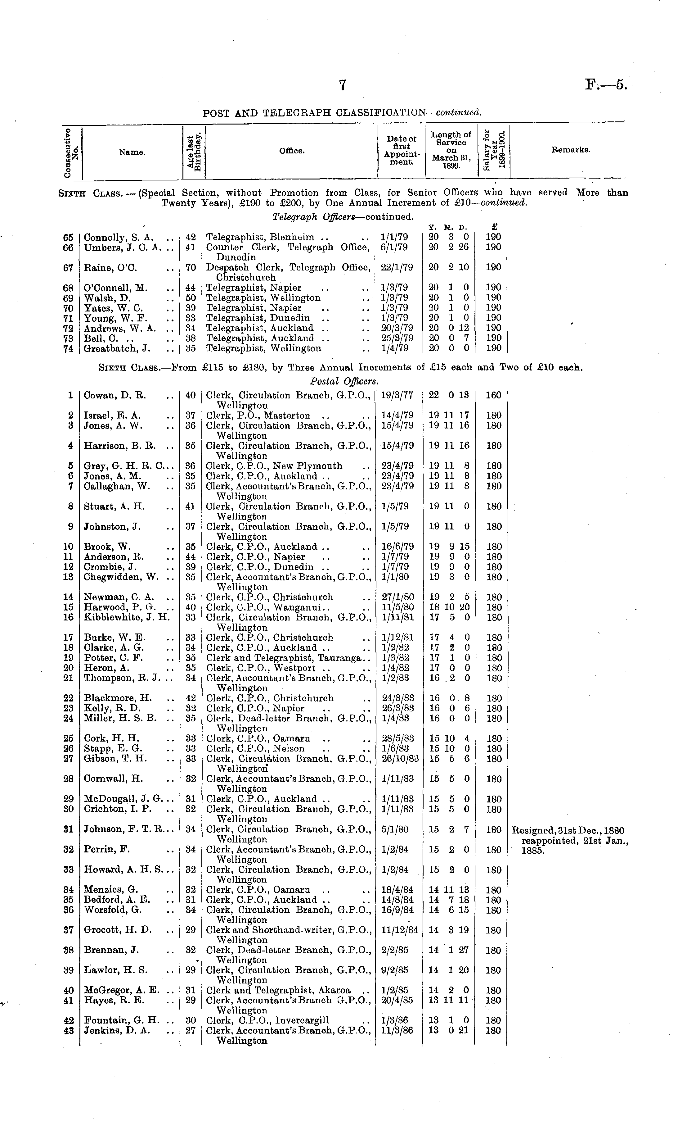 > io § o Name. to u Office. note of Length of o g D flrst° f Service t^S AW , " 1 ?*- March 31, 3,&$ ment - 1899. £ S Bemarks. irxTH Class. — (Special Twe Section, without Promotion from Class, for Sen >nty Years), £190 to £200, by One Annual Incremi Telegraph Officers —continued. dor Officers who jnt of £10 — contin have served More than 'Med, 65 Connolly, S. A. .. 66 Umbers, J. C. A. .. 65 6G 42 Telegraphist, Blenheim .. .. 1/1/79 41 Counter Clerk, Telegraph Ofiiee, 6/1/79 Dunedin 70 Despatch Clerk, Telegraph Office, 22/1/79 Christchurch 44 Telegraphist, Napier .. .. 1/3/79 50 Telegraphist, Wellington .. 1/3/79 39 Telegraphist, Napier .. .. 1/3/79 33 Telegraphist, Dunedin .. .. 1/3/79 34 Telegraphist, Auckland .. .. 20/3/79 38 Telegraphist, Auckland .. .. 25/3/79 35 Telegraphist, Wellington .. 1/4/79 Y. M. d. £ 20 3 0 190 20 2 26 190 67 Eaine, O'C. 67 20 2 10 190 68 69 70 71 72 73 74 68 O'Connell, M. 69 Walsh, D. 70 Yates, W. C. 71 Young, W. P. 72 Andrews, W. A. 73 Bell, C. .. 74 Greatbatch, J. 20 1 0 190 20 1 0 190 20 1 0 190 20 1 0 190 20 0 12 190 20 0 7 190 20 0 0 190 I £15 each and T 'O of £10 each. Sixth Class. —P: rom £115 to £180, by Three Annual Increments o: 1 Cowan, D. R. 1 2 Israel, E. A. 3 Jones, A. W. 2 3 4 Harrison, B. R. 4 5 Grey, G. H. R. C... 6 Jones, A. M. 7 Callaghan, W. 5 6 7 8 8 Stuart, A. H. 9 Johnston, J. 9 10 Brook, W. 11 Anderson, R. 12 Crombie, J. 13 Chegwidden, W. .. 10 11 12 13 14 15 1G 14 Newman, C. A. 15 Harwood, P. ft. .. 16 Kibblewhite, J. H. 17 18 19 20 21 17 Burke, W. E. 18 Clarke, A. G. 19 Potter, C. P. 20 Heron, A. 21 Thompson, R. J. .. 22 Blackmore, H. 23 Kelly, R. D. 24 Miller, H. S. B. 22 23 24 Postal Officers. 40 Clerk, Circulation Branch, G.P.O., 19/3/77 Wellington 37 Clerk, P.O., Masterton .. .. 14/4/79 36 Clerk, Circulation Branch, G.P.O., 15/4/79 Wellington 35 Clerk, Circulation Branch, G.P.O., 15/4/79 Wellington 36 Clerk, C.P.O., New Plymouth .. 23/4/79 35 Clerk, C.P.O., Auckland .. .. 23/4/79 35 Clerk, Accountant's Branch, G. P.O., 23/4/79 Wellington 41 Clerk, Circulation Branch, G.P.O., 1/5/79 Wellington 37 Clerk, Circulation Branch, G.P.O., 1/5/79 Wellington 35 Clerk, C.P.O., Auckland .. .. 16/6/79 44 Clerk, C.P.O., Napier .. .. 1/7/79 39 Clerk, C.P.O., Dunedin .. .. 1/7/79 35 Clerk, Accountant's Branch, G.P.O., 1/1/80 Wellington 35 Clerk, C.P.O., Christchurch .. 27/1/80 40 Clerk, C.P.O., Wanganui.. .. 11/5/80 33 Clerk, Circulation Branch, G.P.O., 1/11/81 Wellington 33 Clerk, C.P.O., Christchurch .. 1/12/81 34 Clerk, C.P.O., Auckland .. .. 1/2/82 35 Clerk and Telegraphist, Tauranga.. 1/3/82 35 Clerk, C.P.O., Westport .. .. 1/4/82 34 Clerk, Accountant's Branch, G.P.O., 1/2/83 Wellington 42 Clerk, C.P.O., Christchurch .. 24/3/83 32 Clerk, C.P.O., Napier .. .. 26/3/83 35 Clerk, Dead-letter Branch, G.P.O., 1/4/83 Wellington 33 Clerk, C.P.O., Oamaru .. .. 28/5/83 33 Clerk, C.P.O., Nelson .. .. 1/6/83 33 Clerk, Circulation Branch, G.P.O., 26/10/83 Wellington 32 Clerk, Accountant's Branch, G.P.O., 1/11/83 Wellington 31 Clerk, C.P.O., Auckland .. .. 1/11/83 32 Clerk, Circulation Branch, G.P.O., 1/11/83 Wellington 34 Clerk, Circulation Branch, G.P.O., 5/1/80 Wellington 34 Clerk, Accountant's Branch, G.P.O., 1/2/84 Wellington 32 Clerk, Circulation Branch, G.P.O., 1/2/84 Wellington 32 Clerk, C.P.O., Oamaru .. .. 18/4/84 31 Clerk, C.P.O., Auckland .. .. 14/8/84 34 Clerk, Circulation Branch, G.P.O., 16/9/84 Wellington 29 Clerk and Shorthand-writer, G.P.O., 11/12/84 Wellington 32 Clerk, Dead-letter Branch, G.P.O., 2/2/85 Wellington 29 Clerk, Circulation Branch, G.P.O., 9/2/85 Wellington 31 Clerk and Telegraphist, Akaroa .. 1/2/85 29 Clerk, Accountant's Branch a.P.O., 20/4/85 Wellington 30 Clerk, C.P.O., Invercargill .. 1/3/86 27 Clerk, Accountant's Branoh, G.P.O., 11/3/86 Wellington 22 0 13 160 19 11 17 180 19 11 16 180 19 11 16 180 19 11 8 180 19 11 8 180 19 11 8 180 19 11 0 180 19 11 0 180 19 9 15 180 19 9 0 180 19 9 0 180 19 3 0 180 19 2 5 180 18 10 20 180 17 5 0 180 17 4 0 180 17 2 0 180 17 1 0 180 17 0 0 180 16 2 0 180 16 0 8 180 16 0 6 180 16 0 0 180 25 26 27 25 Cork, H. H. 26 Stapp, E.G. 27 Gibson, T. H. 15 10 4 180 15 10 0 180 15 5 6 180 28 Cornwall, H. 28 15 5 0 180 29 McDougall, J. G. .. 30 Crichton, I. P. 29 30 15 5 0 180 15 5 0 180 31 31 Johnson, P. T. R... 15 2 7 180 Resigned,31st Dec.,1880 reappointed, 21st Jan., 1885. 32 32 Perrin, P. 15 2 0 180 33 33 Howard, A. H. S... 15 2 0 180 34 35 36 34 Menzies, G. 35 Bedford, A. E. 36 Worsfold, G. 14 11 13 180 14 7 18 180 14 6 15 180 37 37 Grocott, H. D. 14 3 19 180 38 38 Brennan, J. 14 1 27 180 39 39 Lawlor, H. S. 14 1 20 180 40 41 40 McGregor, A. E. 41 Hayes, R. E. 14 2 0 180 13 11 11 180 42 43 42 Fountain, G. H. .. 43 Jenkins, D. A. 13 1 0 180 13 0 21 180