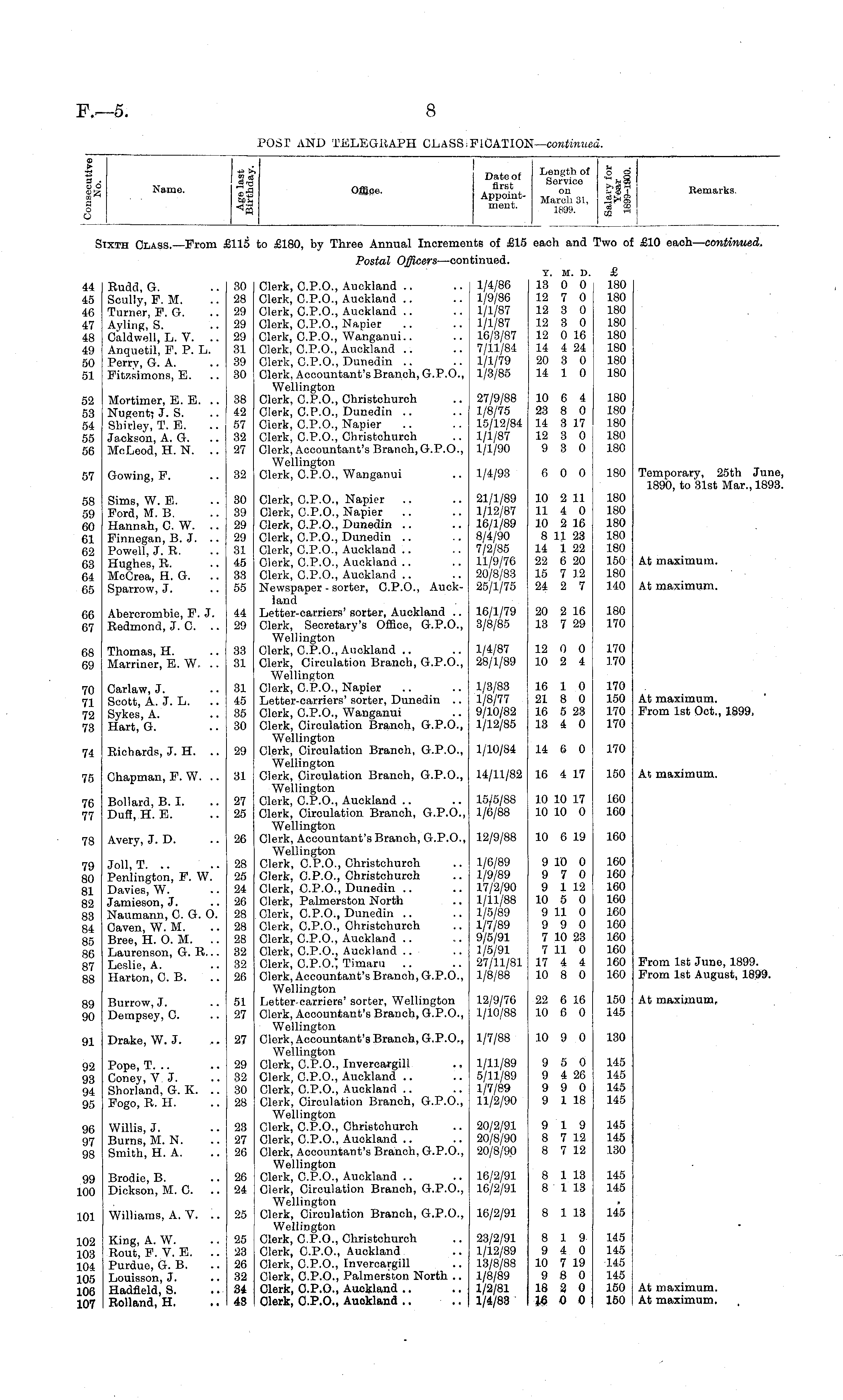 e Id o O Name. II as Office. Dateof Who. So III b L Ps CTj f—i Mar™ 31, *£§ Remarks. Itxth Class. —Prom S115 to £180, by Three Annual Increme: its of £15 each and wo of £10 each— continued. Postal Officers —cor itinued. Y. M. D. 13 0 0 12 7 0 12 3 0 12 3 0 12 0 16 14 4 24 20 3 0 14 1 0 £ 180 180 180 180 180 180 180 180 44 4.5 46 47 48 49 50 51 Rudd, G. Scully, F. M. Turner, F. G. Ayling, S. Oaldwell, L. V. Anquetil, F. P. L. Perry, G. A. Fitzsimons, E. 30 28 29 29 29 31 39 30 Clerk, C.P.O., Auckland Clerk, C.P.O., Auckland Clerk, C.P.O., Auckland Clerk, C.P.O., Napier Clerk, C.P.O., Wanganui.. Clerk, C.P.O., Auckland Clerk, C.P.O., Dunedin Clerk, Accountant's Branch, G.P.O., Wellington Clerk, C.P.O., Christchurch Clerk, C.P.O., Dunedin .. Clerk, C.P.O., Napier Clerk, C.P.O., Christchurch Clerk, Accountant's Branch, G.P.O., Wellington Clerk, C.P.O., Wanganui 1/4/86 1/9/86 1/1/87 1/1/87 16/3/87 7/11/84 1/1/79 1/3/85 52 53 54 55 56 Mortimer, E. E. Nugent; J. S. Shirley, T. E. Jackson, A. G. McLeod, H. N. 38 42 57 32 27 27/9/88 1/8/75 15/12/84 1/1/87 1/1/90 10 6 4 23 8 0 14 3 17 12 3 0 9 3 0 180 180 180 180 180 Temporary, 25th June, 1890, to 31st Mar., 1893! 57 Gowing, F. 32 1/4/93 6 0 0 180 58 .59 60 61 62 63 64 65 Sims, W. E. Ford, M. B. Hannah, C. W. Finnegan, B. J. Powell, J. R. Hughes, R. McCrea, H. G. Sparrow, J. 30 39 29 29 31 45 33 55 Clerk, O.P.O., Napier Clerk, C.P.O., Napier Clerk, C.P.O., Dunedin Clerk, C.P.O., Dunedin Clerk, C.P.O., Auckland Clerk, C.P.O., Auckland Clerk, C.P.O., Auckland .. Newspaper - sorter, O.P.O., Auckland Letter-carriers' sorter, Auckland .. Clerk, Secretary's Office, G.P.O., Wellington Clerk, C.P.O., Auckland Clerk, Circulation Branch, G.P.O., Wellington Clerk, O.P.O., Napier Letter-carriers' sorter, Dunedin .. Clerk, C.P.O., Wanganui Clerk, Circulation Branch, G.P.O., Wellington Clerk, Circulation Branch, G.P.O., Wellington Clerk, Circulation Branch, G.P.O., Wellington Clerk, C.P.O., Auckland Clerk, Circulation Branch, G.P.O., Wellington Clerk, Accountant's Branch, G.P.O., Wellington Clerk, C.P.O., Christchurch Clerk, C.P.O., Christchurch Clerk, O.P.O., Dunedin .. Clerk, Palmerston North Clerk, C.P.O., Dunedin .. Clerk, C.P.O., Christchurch Clerk, C.P.O., Auckland Clerk, C.P.O., Auckland Clerk, C.P.O." Timaru Clerk, Accountant's Branch, G.P.O., Wellington Letter-carriers' sorter, Wellington Clerk, Accountant's Branch, G.P.O., Wellington Clerk, Accountant's Branch, G.P.O., Wellington Clerk, C.P.O., Invercargill Clerk, C.P.O., Auckland Clerk, C.P.O., Auckland Clerk, Circulation Branch, G.P.O., Wellington Clerk, C.P.O., Christchurch Clerk, C.P.O., Auckland Clerk, Accountant's Branch, G.P.O., Wellington Clerk, O.P.O., Auckland Clerk, Circulation Branch, G.P.O., Wellington Clerk, Circulation Branch, G.P.O., Wellington Clerk, C.P.O., Christchurch Clerk, C.P.O., Auckland Clerk, C.P.O., Invercargill Clerk, C.P.O., Palmerston North .. Clerk, C.P.O., Auckland Clerk, O.P.O., Auokland .. .. 21/1/89 1/12/87 16/1/89 8/4/90 7/2/85 11/9/76 20/8/83 25/1/75 10 2 11 11 4 0 10 2 16 8 11 23 14 1 22 22 6 20 15 7 12 24 2 7 180 180 180 180 180 150 180 140 At maximum. G6 67 Abercrombie, F. J. Redmond, J. C. 44 29 16/1/79 3/8/85 20 2 16 13 7 29 180 170 At maximum. 68 69 Thomas, H. Marriner, E. W. 33 31 1/4/87 28/1/89 12 0 0 10 2 4 170 170 At maximum. From 1st Oct., 1899, 70 73. 72 73 Carlaw, J. Scott, A. J. L. Sykes, A. Hart, G. 31 45 35 30 1/3/83 1/8/77 9/10/82 1/12/85 16 1 0 21 8 0 16 5 23 13 4 0 170 150 170 170 74 Richards, J. H. 29 1/10/84 14 6 0 170 At maximum. 75 Chapman, F. W. 31 14/11/82 16 4 17 150 76 77 Bollard, B. I. Duff, H. E. 27 25 15/5/88 1/6/88 10 10 17 10 10 0 160 160 78 Avery, J. D. 26 12/9/88 10 6 19 160 79 80 81 82 83 84 85 86 87 88 Joll, T. .. Penlington, F. W. Davies, W. Jamieson, J. Naumann, 0. G. 0. Caven, W. M. Bree, H. 0. M. Laurenson, G. R... Leslie, A. Harton, C. B. 28 25 24 26 28 28 28 32 32 26 1/6/89 1/9/89 17/2/90 1/11/88 1/5/89 1/7/89 9/5/91 1/5/91 27/11/81 1/8/88 9 10 0 9 7 0 9 1 12 10 5 0 9 11 0 9 9 0 7 10 23 7 11 0 17 4 4 10 8 0 160 160 160 160 160 160 160 160 160 160 From 1st June, 1899. From 1st August, 1899. 89 90 Burrow, J. Dempsey, C. 51 27 12/9/76 1/10/88 22 6 16 10 6 0 150 145 At maximum. 91 Drake, W.J. 27 1/7/88 10 9 0 130 92 93 94 95 Pope, T. .. Coney, V J. Shorland, G. K. Fogo, R. H. 29 32 30 28 1/11/89 5/11/89 1/7/89 11/2/90 9 5 0 9 4 26 9 9 0 9 1 18 145 145 145 145 96 97 98 Willis, J. Burns, M. N. Smith, H. A. 23 27 26 20/2/91 20/8/90 20/8/90 9 19 8 7 12 8 7 12 145 145 130 99 LOO Brodie, B. Dickson, M. 0. 26 24 16/2/91 16/2/91 8 1 13 8 1 13 145 145 L01 Williams, A. V. 25 16/2/91 8 1 13 145 L02 108 L04 L05 L06 L07 King, A. W. Rout, F. V. E. Purdue, G. B. Louisson, J. Hadfield, S. Rollana, H. 25 23 26 32 34 43 23/2/91 1/12/89 13/8/88 1/8/89 1/2/81 1/4/83 8 19 9 4 0 10 7 19 9 8 0 18 2 0 16 0 0 145 145 145 145 150 150 At maximum. At maximum.