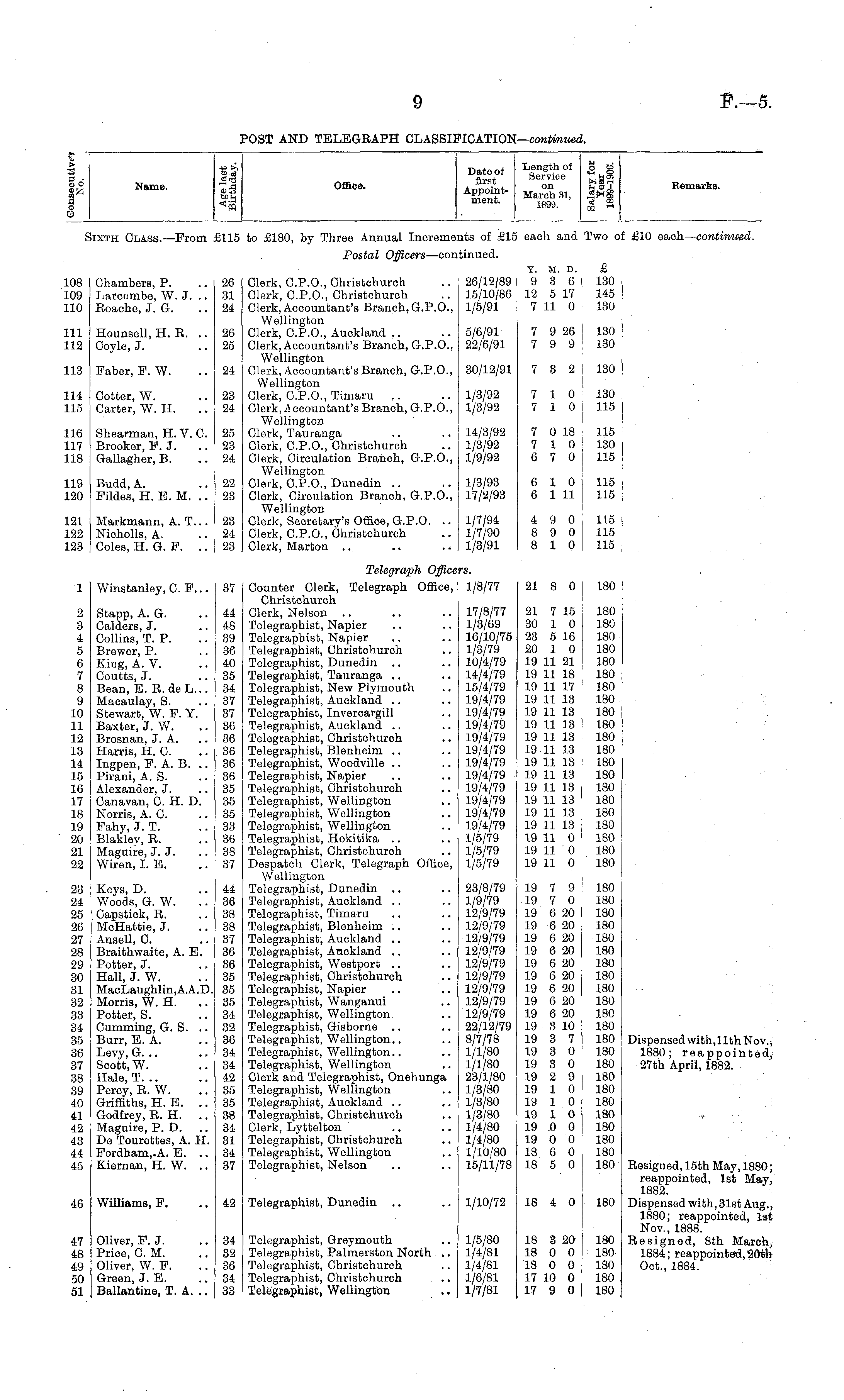 i> go I Name. Office. Date of first Appointment. Length of o=^ Service V%& on tit March 31, 1899. £ S Remarks. Iixth Class.—Prom £115 to £180, by Three Annual Incremei nts of £U each and Two of £10 each— continued. Postal Officers —con itinued. Y. M. D. 9 3 6 12 5 17 7 11 0 £ 130 I 145 130 08 .09 .10 Chambers, P. 26 Larcombe, W. J. .. 31 Roache, J. G. .. 24 Clerk, G.P.O., Christchurch Clerk, C.P.O., Christchurch Clerk, Accountant's Branch, G.P.O., Wellington Clerk, C.P.O., Auckland .. Clerk, Accountant's Branch, G.P.O., j Wellington Clerk, Accountant's Branch, G.P.O., Wellington Clerk, C.P.O., Thnaru .. Clerk, Accountant's Branch, G.P.O., Wellington Clerk, Tauranga .. .. Clerk, C.P.O., Christchurch Clerk, Circulation Branch, G.P.O., j Wellington Clerk, C.P.O., Dunedin .. Clerk, Circulation Branch, G.P.O., Wellington Clerk, Secretary's Office, G.P.O. .. Clerk, O.P.O., Ohristchurch Clerk, Marton .. .. .. I 26/12/89 15/10/86 1/5/91 11 12 Hounsell, H. R. .. 26 Coyle, J. .. 25 : 5/6/91 ' 22/6/91 7 9 26 7 9 9 130 130 .13 Faber, P. W. .. 24 i 30/12/91 7 3 2 130 14 .15 Cotter, W. .. 23 Carter, W. H. .. 24 I 1/3/92 i 1/3/92 7 10 7 10 130 115 .16 .17 18 Shearman, H.V.C. 25 Brooker, F.J. .. 23 Gallagher, B. .. 24 14/3/92 1/3/92 i 1/9/92 7 0 18 7 10 6 7 0 115 130 ; 115 ; .19 .20 Budd, A. .. 22 Fildes, H. B. M. .. 23 1/3/93 17/2/93 6 10 6 1 11 115 115 21 .22 .23 Markmann, A. T... 23 Nicholls, A. .. 24 Coles, H. G. F. .. j 23 1/7/94 1/7/90 1/3/91 4 9 0 8 9 0 8 10 115 115 115 1 2 8 4 5 6 7 8 9 10 11 12 13 id 15 16 17 18 19 20 21 22 Winstanley, C. F... 37 Stapp, A. G. .. 44 Calders, J. .. 48 Collins, T. P. .. 39 Brewer, P. .. 36 King, A. V. .. 40 Coutts, J. .. 35 Bean, E. R. deL... 34 Macaulay, S. .. 37 Stewart, W. F. Y. 37 Baxter, J. W. .. 36 Brosnan, J. A. .. 36 Harris, H. C. .. 36 Ingpen, F. A. B. .. 36 Pirani, A. S. .. 36 Alexander, J. .. 35 Canavan, C. H. D. 35 Norris, A. 0. .. 35 Fahy, J. T. .. 33 Blaklev, R. .. 36 Maguire, J. J. .. 38 Wiren, I. B. .. 37 37 4,1 48 39 36 40 35 34 37 37 36 3G 30 36 36 35 35 35 33 36 38 37 Telegraph Office, Counter Clerk, Telegraph Office, Christchurch Clerk, Nelson Telegraphist, Napier Telegraphist, Napier Telegraphist, Christchurch Telegraphist, Dunedin Telegraphist, Tauranga Telegraphist, New Plymouth Telegraphist, Auckland Telegraphist, Invercargill Telegraphist, Auckland Telegraphist, Ohristchurch Telegraphist, Blenheim Telegraphist, Woodville Telegraphist, Napier Telegraphist, Ohristchurch Telegraphist, Wellington Telegraphist, Wellington Telegraphist, Wellington Telegraphist, Hokitika Telegraphist, Christchurch Despatch Clerk, Telegraph Office, Wellington Telegraphist, Dunedin Telegraphist, Auckland Telegraphist, Timaru Telegraphist, Blenheim Telegraphist, Auckland Telegraphist, Auckland Telegraphist, Westport Telegraphist, Christohurch Telegraphist, Napier Telegraphist, Wanganui Telegraphist, Wellington Telegraphist, Gisborne Telegraphist, Wellington.. Telegraphist, Wellington.. Telegraphist, Wellington Clerk and Telegraphist, Onehunga Telegraphist, Wellington Telegraphist, Auckland Telegraphist, Christchurch Clerk, Lyttelton Telegraphist, Christchurch Telegraphist, Wellington Telegraphist, Nelson rs. 1/8/77 17/8/77 1/3/69 16/10/75 1/3/79 10/4/79 14/4/79 15/4/79 19/4/79 19/4/79 19/4/79 19/4/79 19/4/79 19/4/79 19/4/79 19/4/79 19/4/79 19/4/79 19/4/79 1/5/79 1/5/79 1/5/79 21 8 0 21 7 15 30 1 0 23 5 16 20 1 0 19 11 21 19 11 18 19 11 17 19 11 13 19 11 13 19 11 13 19 11 13 19 11 13 19 11 13 19 11 13 19 11 13 19 11 13 19 11 13 19 11 13 19 11 0 19 11 0 19 11 0 180 180 ! 180 180 180 180 j 180 180 180 180 180 180 180 180 180 ! 180 180 180 180 180 180 180 28 24 25 20 27 28 29 30 31 32 33 34 35 36 37 38 39 40 ■11 i-2 43 44 45 Keys, D. .. 44 Woods, G. W. .. 36 \ Capstick, R. .. 38 McHattie, J. .. 38 Ansell, C. .. 37 Braithwaite, A. B. 36 Potter, J. .. 36 Hall, J. W. .. 35 MacLaughlin.A.A.D. 35 Morris, W. H. .. 35 Potter, S. .. 34 Cumming, G. S. .. 32 Burr, E. A. .. 36 Levy, G. .. .. 34 Scott, W. .. 34 Hale, T. .. .. 42 Percy, R. W. .. 35 Griffiths, H. E. .. 35 Godfrey, R. H. .. 38 Maguire, P. D. .. 34 De Tourettes, A. H. 31 Fordham,.A. E. .. 34 Kiernan, H. W. .. 37 44 36 38 38 37 36 36 35 35 35 3d 32 36 34 34 42 35 35 38 34 31 34 37 23/8/79 1/9/79 12/9/79 12/9/79 12/9/79 12/9/79 12/9/79 12/9/79 12/9/79 12/9/79 12/9/79 22/12/79 8/7/78 1/1/80 1/1/80 23/1/80 1/3/80 1/3/80 1/3/80 1/4/80 1/4/80 1/10/80 15/11/78 19 7 9 19 7 0 19 6 20 19 6 20 19 6 20 19 6 20 19 6 20 19 6 20 19 6 20 19 6 20 19 6 20 19 3 10 19 3 7 19 3 0 19 3 0 19 2 9 19 1 0 19 1 0 19 1 0 19 0 0 19 0 0 18 6 0 18 5 0 180 180 180 180 180 180 180 180 180 180 180 180 180 Dispensed with,11th N< 180 1880; reappointi 180 27th April, 1882. 180 180 180 180 ♦■■■:-1 180 180 180 180 Resigned, loth May, 18 reappointed, 1st M Dispensed with,11th Nov., 1880; reappointed, 27th April, 1882. - ■ 46 Williams, F. .. 42 42 Telegraphist, Dunedin 1/10/72 18 4 0 1882. 180 Dispensed with, 31st Ai 1880; reappointed, Eesigned, loth May, 1880; reappointed, 1st May, 1882. Dispensed with, 31st Aug., 1880; reappointed, 1st Nov., 1888. Resigned, 8th March, 1884; reappointed,20th Oct., 1884. 47 48 49 50 51 Oliver, F.J. .. 34 Price, CM. .. 32 Oliver, W. F. .. 36 Green, J. E. .. 34 Ballantine, T. A. .. 33 34 3:4 36 34 33 Telegraphist, Greymouth Telegraphist, Palmerston North .. Telegraphist, Christchurch Telegraphist, Christchurch . .. Telegraphist, Wellington 1/5/80 1/4/81 1/4/81 1/6/81 1/7/81 18 3 20 18 0 0 18 0 0 17 10 0 17 9 0 Nov., 1888. 180 Resigned, 8th Mar 180 1884; reappointed,21 180 Oct., 1884. 180 180