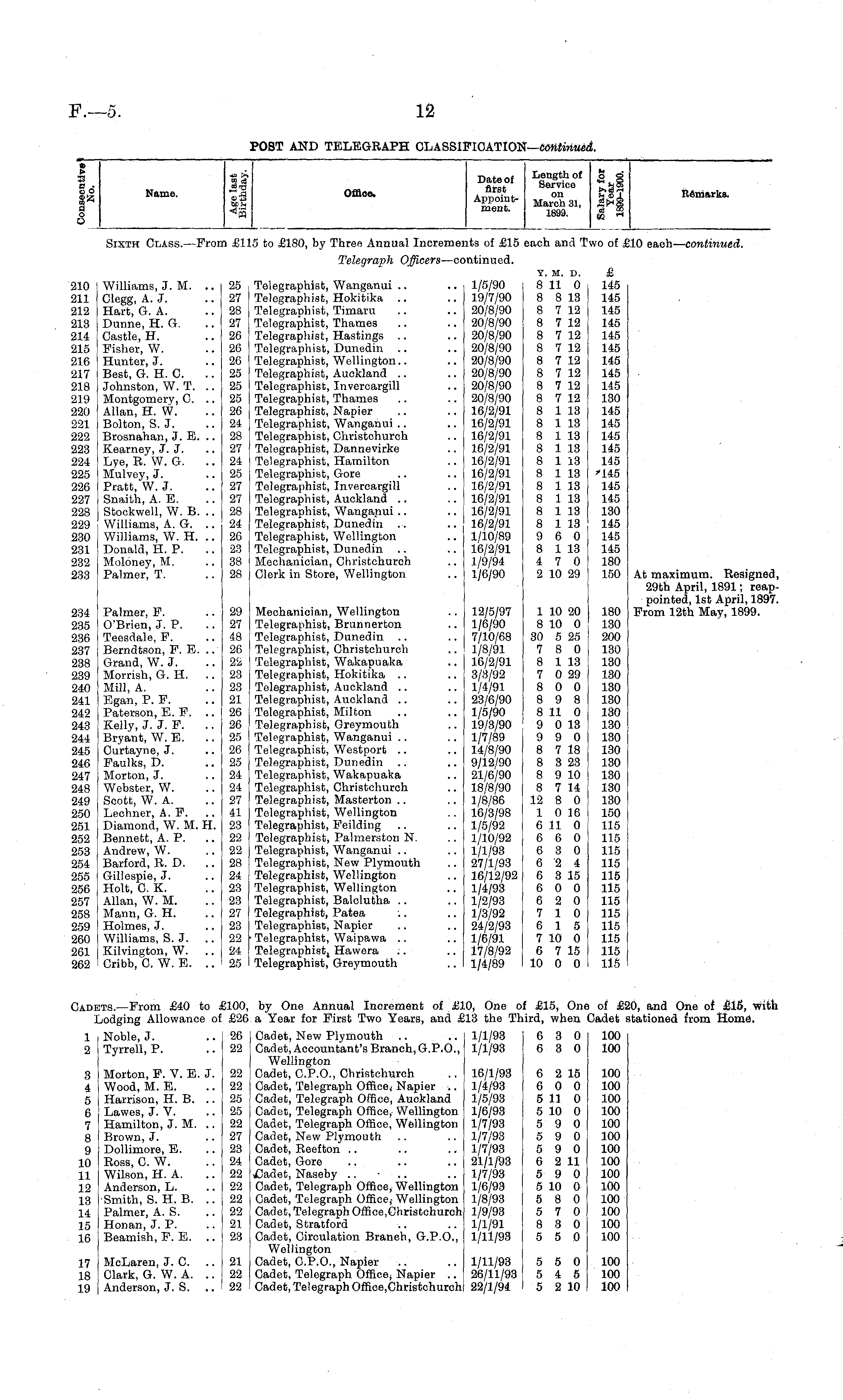 3 go 1 i Name. 3| a>3 Office. Date of length of first Se " loe A ment nt ' March 31, raent. lg99 03 x Remarks. Sixth Class. —Proi l £115 to £180, by Three Annual Ineremei £1 its of £15 each and 1 )wo of i '10 each— continued. Telegraph Officers —cc ratinued. £ 145 145 145 145 145 145 145 145 145 130 145 145 145 145 145 '145 145 145 130 145 145 145 180 150 I 210 211 212 213 214 215 216 217 218 219 220 221 222 223 224 225 226 227 228 229 230 231 232 233 Williams, J. M. .. Clegg, A. J. Hart, G. A. Dunne, H. G. Castle, H. Fisher, W. Hunter, J. Best, G. H. C. Johnston, W. T. Montgomery, C. .. Allan, H. W. Bolton, S. J. Brosnahan, J. B. Kearney, J.J. Lye, R. W. G. Mulvey, J. Pratt, W. J. Snaith, A. E. Stookwell, W. B. .. Williams, A. G. Williams, W. H. Donald, H. P. Moloney, M. Palmer, T. 25 Telegraphist, Wanganui 27 Telegraphist, Hokitika .. 28 Telegraphist, Timaru 27 Telegraphist, Thames 26 Telegraphist, Hastings 26 Telegraphist, Dunedin 26 Telegraphist, Wellington.. 25 Telegraphist, Auckland 25 Telegraphist, Invercargill 25 Telegraphist, Thames 26 Telegraphist, Napier 24 Telegraphist, Wanganui 28 Telegraphist, Christehurch 27 Telegraphist, Dannevirke 24 Telegraphist, Hamilton 25 Telegraphist, Gore 27 Telegraphist, Invercargill 27 Telegraphist, Auckland 28 Telegraphist, Wanganui 24 Telegraphist, Dunedin 26 Telegraphist, Wellington 23 Telegraphist, Dunedin 38 Mechanician, Christehurch 28 Clerk in Store, Wellington 25 27 28 27 2G 26 26 25 25 25 26 24 28 27 24 25 27 27 28 24 20 23 38 28 Y. M. D. 1/5/90 8 11 0 19/7/90 8 8 13 20/8/90 8 7 12 20/8/90 8 7 12 20/8/90 8 7 12 20/8/90 8 7 12 20/8/90 8 7 12 20/8/90 8 7 12 20/8/90 8 7 12 20/8/90 8 7 12 16/2/91 8 1 13 16/2/91 8 1 13 16/2/91 8 1 13 16/2/91 8 1 13 16/2/91 8 1 13 16/2/91 8 1 13 16/2/91 8 1 13 16/2/91 8 1 13 16/2/91 8 1 13 16/2/91 8 1 13 1/10/89 9 6 0 16/2/91 8 1 13 1/9/94 4 7 0 1/6/90 2 10 29 29 Mechanician, Wellington 27 Telegraphist, Brunnerton 48 Telegraphist, Dunedin 26 Telegraphist, Christehurch 22 Telegraphist, Wakapuaka 23 Telegraphist, Hokitika 23 Telegraphist, Auckland 21 Telegraphist, Auckland .. 26 Telegraphist, Milton 26 Telegraphist, Greymouth 25 Telegraphist, Wanganui 26 Telegraphist, Westport 25 Telegraphist, Dunedin 24 Telegraphist, Wakapuaka 24 Telegraphist, Christehurch 27 Telegraphist, Masterton 41 Telegraphist, Wellington 23 Telegraphist, Feilding 22 Telegraphist, Palmerston N. 22 Telegraphist, Wanganui 28 Telegraphist, New Plymouth 24 Telegraphist, Wellington 23 Telegraphist, Wellington 23 Telegraphist, Balelutha 27 Telegraphist, Patea 23 Telegraphist, Napier 22 Telegraphist, Waipawa 24 Telegraphist, Havvera 25 Telegraphist, Greymouth 12/5/97 1 10 20 1/6/90 8 10 0 7/10/68 30 5 25 1/8/91 7 8 0 16/2/91 8 1 13 3/3/92 7 0 29 1/4/91 8 0 0 23/6/90 8 9 8 1/5/90 8 11 0 19/3/90 9 0 13 1/7/89 9 9 0 14/8/90 8 7 18 9/12/90 8 3 23 21/6/90 8 9 10 18/8/90 8 7 14 1/8/86 12 8 0 16/3/98 1 0 16 1/5/92 6 11 0 1/10/92 6 6 0 1/1/93 6 3 0 27/1/93 6 2 4 16/12/92 6 3 15 1/4/93 6 0 0 1/2/93 6 2 0 1/3/92 7 10 24/2/93 6 1 5 1/6/91 7 10 0 17/8/92 6 7 15 1/4/89 10 0 0 180 130 200 130 130 130 130 130 130 130 130 130 130 130 130 130 150 115 115 115 115 115 115 115 115 115 115 115 115 At maximum. Resigned, 29th April, 1891; reappointed, 1st April, 1897. From 12th May, 1899. 234 235 236 237 238 239 240 241 242 243 244 245 246 247 248 249 250 251 252 253 254 255 256 257 258 259 260 261 262 Palmer, F. O'Brien, J. P. Teesdale, F. Berndtson, F. E. .. Grand, W. J. Morrish, G. H. Mill, A. Egan, P. F. Paterson, E. F. Kelly, J. J. F. Bryant, W. E. Curtayne, J. Faulks, D. Morton, J. Webster, W. Scott, W. A. Lechner, A. F. Diamond, W. M. H. Bennett, A. P. Andrew, W. Barford, R. D. Gillespie, J. Holt, C. K. Allan, W. M. Mann, G. H. Holmes, J. Williams, S. J. Kilvington, W. Cribb, C. W. E. .. 29 27 48 20 22 23 23 21 2G 20 25 26 25 24 24 27 4.1 23 22 22 28 24 23 23 27 23 22 24 25 Cad: its. —From £40 to , jodging Allowance oi Noble, J. Tyrrell, P. 5100, by One Annual Increment of £1 £26. a Year for First Two Years, and £ .0, One of £15, On. !13 the Third, when e of £! Cadet !0, and One of £15, with stationed from Home. 1 2 26 Cadet, New Plymouth 22 Cadet, Accountant's Branch, G.P.O., Wellington 22 Cadet, C.P.O., Christehurch 22 Cadet, Telegraph Office, Napier .. 25 Cadet, Telegraph Office, Auckland 25 Cadet, Telegraph Office, Wellington 22 Cadet, Telegraph Office, Wellington 27 Cadet, New Plymouth 23 Cadet, Reefton 24 Cadet, Gore 22 J3adet, Naseby .. • .. 22 Cadet, Telegraph Office, Wellington 22 Cadet, Telegraph Office, Wellington 22 Cadet, Telegraph Office,Ghristchurch 21 Cadet, Stratford 23 Cadet, Circulation Branch, G.P.O., Wellington 21 Cadet, C.P.O., Napier 22 Cadet, Telegraph Office, Napier .. 22 Cadet, Telegraph Offiee.Christchurch 1/1/93 6 3 0 1/1/93 6 3 0 100 100 3 i 5 6 7 8 9 10 11 12 13 14 15 16 Morton, F. V. E. J. Wood, M. E. Harrison, H. B. Lawes, J. V. Hamilton, J. M. Brown, J. Dollimore, E. Ross, C. W. Wilson, H. A. Anderson, L. Smith, S. H. B. Palmer, A. S. Honan, J. P. Beamish, F. E. 16/1/93 6 2 15 1/4/93 6 0 0 1/5/93 5 11 0 1/6/93 5 10 0 1/7/93 5 9 0 1/7/93 5 9 0 1/7/93 5 9 0 21/1/93 6 2 11 1/7/93 5 9 0 1/6/93 5 10 0 1/8/93 5 8 0 1/9/93 5 7 0 1/1/91 8 3 0 1/11/93 5 5 0 100 100 100 100 100 100 100 100 100 100 100 100 100 100 17 18 19 McLaren, J. C. Clark, G. W. A. Anderson, J. S. 1/11/93 5 5 0 26/11/93 5 4 5 22/1/94 5 2 10 100 100 100
