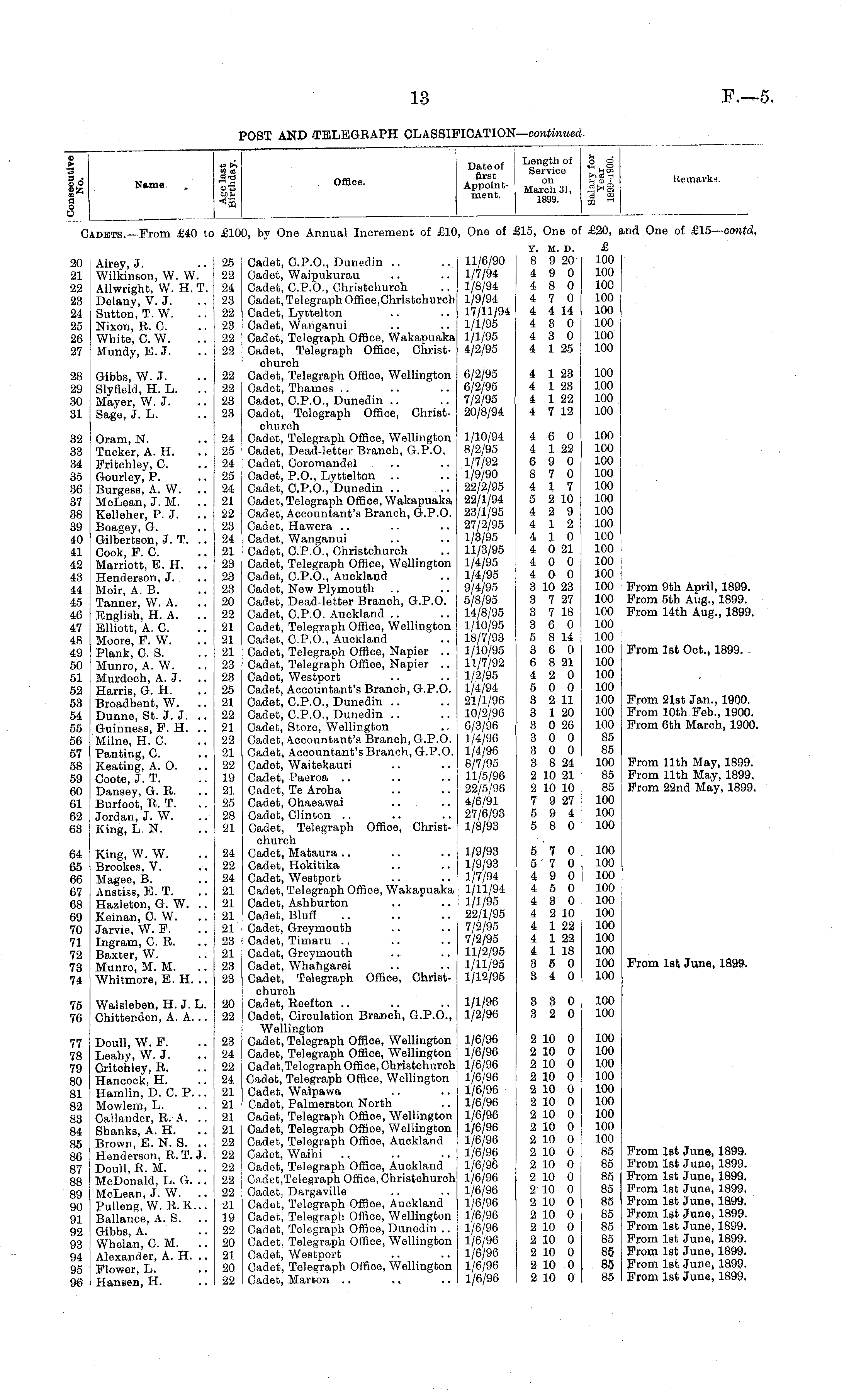 I 1° § Name. 1*_ Office. ltemai'ks. iDets. —Prom £40 t< m ), by One Annual Increment of £10 ; , One of 115, One o: £20, £ 100 100 100 100 100 100 100 100 *nd One of £15 — contd. 20 21 22 23 24 25 26 27 Airey, J. Wilkinson, W. W. Allwright, W. H. T. Delany, V. J. Sutton, T. W. Nixon, R. C. White, C. W. Muudy, B.J. 25 22 24 23 22 23 22 22 Cadet, G.P.O., Dunedin .. .. I Cadet, Waipukurau Cadet, C.P.O., Christehurch Cadet, Telegraph Office.Christchurch Cadet, Lyttelton Cadet, Wanganui Cadet, Telegraph Office, Wakapuaka Cadet, Telegraph Office, Christchurch Cadet, Telegraph Office, Wellington Cadet, Thames Cadet, C.P.O., Dunedin .. Cadet, Telegraph Office, Christchurch Cadet, Telegraph Office, Wellington Cadet, Dead-letter Branch, G.P.O. Cadet, Coromandel Cadet, P.O., Lyttelton Cadet, C.P.O., Dunedin Cadet, Telegraph Office, Wakapuaka Cadet, Accountant's Branch, G.P.O. | Cadet, Hawera Cadet, Wanganui Cadet, C.P.O., Christchurch Cadet, Telegraph Office, Wellington Cadet, C.P.O., Auckland Cadet, New Plymouth Cadet, Dead-letter Branch, G.P.O. Cadet, C.P.O. Auckland Cadet, Telegraph Office, Wellington Cadet, C.P.O., Auckland Cadet, Telegraph Office, Napier .. Cadet, Telegraph Office, Napier .. Cadet, Westport Cadet, Accountant's Branch, G.P.O. Cadet, C.P.O., Dunedin Cadet, C.P.O., Dunedin .. Cadet, Store, Wellington Cadet, Accountant's Branch, G.P.O. Cadet, Accountant's Branch, G.P.O. Cadet, Waitekauri Cadet, Paeroa .. Cadet, Te Aroha Cadet, Ohaeawai Cadet, Clinton Cadet, Telegraph Office, Christchurch Cadet, Mataura Cadet, Hokitika Cadet, Westport Cadet, Telegraph Office, Wakapuaka Cadet, Ashburton Cadet, Bluff Cadet, Greymouth Cadet, Timaru Cadet, Greymouth Cadet, Whahgarei Cadet, Telegraph Office, Christchurch Cadet, Reefton Cadet, Circulation Branch, G.P.O., Wellington Cadet, Telegraph Office, Wellington Cadet, Telegraph Office, Wellington Cadet,Telegraph Office, Christchurch Cadet, Telegraph Office, Wellington Cadet, Waipawa Cadet, Palmerston North Cadet, Telegraph Office, Wellington Cadet, Telegraph Office, Wellington Cadet, Telegraph Office, Auckland Cadet, Waihi Cadet, Telegraph Office, Auckland Cadet,Telegraph Offioe, Christchurch Cadet, Dargaville Cadet, Telegraph Office, Auckland Cadet, Telegraph Office, Wellington Cadet, Telegraph Office, Dunedin .. Cadet, Telegraph Office, Wellington Cadet, Westport Cadet, Telegraph Office, Wellington Cadet, Marton .. 11/6/90 1/7/94 1/8/94 1/9/94 17/11/94 1/1/95 1/1/95 4/2/95 Y. M. D. 8 9 20 4 9 0 4 8 0 4 7 0 4 4 14 4 3 0 4 3 0 4 1 25 28 29 30 31 Gibbs, W.J. Slyfield,H. L. .. Mayer, W.J. Sage, J. L. 22 22 28 23 6/2/95 6/2/95 7/2/95 20/8/94 4 1 23 4 1 23 4 1 22 4 7 12 100 100 100 100 32 33 34 85 36 37 38 39 40 41 42 43 44 45 46 47 48 49 50 51 52 63 54 55 56 57 58 59 60 61 62 63 Oram, N. Tucker, A. H. Fritchley, C. Gourley, P. Burgess, A. W. McLean, J. M. Kelleher, P. J. Boagey, G. Gilbertson, J. T. Cook, F. O. Marriott, B. H. Henderson, J. Moir, A. B. Tanner, W. A. English, H. A. Elliott, A. G. Moore, F. W. Plank, C. S. Munro, A. W. Murdoch, A.J. Harris, G. H. Broadbent, W. Dunne, St. J. J. Guinness, F. H. Milne, H. 0. Panting, G. Keating, A. O. Coote, J. T. Dansey, G. R. Burfoot, E. T. Jordan, J. W. King, L. N. 2 A 25 24 25 24 21 22 23 24 21 23 23 23 20 22 21 21 21 23 23 25 21 22 21 22 21. 22 19 2] 2S 28 21 1/10/94 8/2/95 1/7/92 1/9/90 22/2/95 22/1/94 23/1/95 27/2/95 1/3/95 11/3/95 1/4/95 1/4/95 9/4/95 5/8/95 14/8/95 1/10/95 18/7/93 1/10/95 11/7/92 1/2/95 1/4/94 21/1/96 10/2/96 6/3/96 1/4/96 1/4/96 8/7/95 11/5/96 22/5/96 4/6/91 27/6/93 1/8/93 4 6 0 4 1 22 6 9 0 8 7 0 4 17 5 2 10 4 2 9 4 12 4 10 4 0 21 4 0 0 4 0 0 3 10 23 3 7 27 3 7 18 3 6 0 5 8 14 3 6 0 6 8 21 4 2 0 5 0 0 3 2 11 3 1 20 3 0 26 3 0 0 3 0 0 3 8 24 2 10 21 2 10 10 7 9 27 5 9 4 5 8 0 100 100 100 100 100 100 100 100 100 100 100 100 100 100 100 100 100 100 100 100 100 100 100 100 85 85 100 85 85 100 100 100 From 9th April, 1899. From 5th Aug., 1899. From 14th Aug., 1899. From 1st Oct., 1899. From 21st Jan., 1900. From 10th Feb., 1900. From 6th March, 1900. From 11th May, 1899. From 11th May, 1899. From 22nd May, 1899. 64 65 66 67 68 69 70 71 72 73 74 King, W. W. Brookes, V. Magee, B. Anstiss, B. T. Hazleton, G. W. .. Keinan, C. W. Jarvie, W. F. Ingram, C. R. Baxter, W. Munro, M. M. Whitmore, E. H. .. 24 22 24 21 21 21 21 28 21. 23 23 1/9/93 1/9/93 1/7/94 1/11/94 1/1/95 22/1/95 7/2/95 7/2/95 11/2/95 1/11/95 1/12/95 5 7 0 5 7 0 4 9 0 4 5 0 4 3 0 4 2 10 4 1 22 4 1 22 4 1 18 3 5 0 3 4 0 100 100 100 100 100 100 100 100 100 100 100 From 1st June, 1899. 75 76 Walsleben, H. J. L. Chittenden, A. A. .. 20 22 1/1/96 1/2/96 3 3 0 3 2 0 100 100 77 78 79 80 81 82 83 84 85 86 87 88 89 90 91 92 93 94 95 96 Doull, W. F. Leahy, W. J. Critchley, R. Hancock, H. Hamlin, D. C. P... Mowlern, L. Callauder, R. A. .. Shanks, A. H. Brown, E. N. S. .. Henderson, R.T.J. Doull, R. M. McDonald, L. G. .. McLean, J. W. Pulleng, W. R.K... Ballance, A. S. Gibbs, A. Whelan, CM. Alexander, A. H. Flower, L. Hansen, H. 23 24 22 24 21 21 21 21 22 22 22 22 22 21 19 22 20 21 20 22 1/6/96 1/6/96 1/6/96 1/6/96 1/6/96 1/6/96 1/6/96 1/6/96 1/6/96 1/6/96 1/6/96 1/6/96 1/6/96 1/6/96 1/6/96 1/6/96 1/6/96 1/6/96 1/6/96 1/6/96 2 10 0 2 10 O 2 10 0 2 10 0 2 10 0 2 10 0 2 10 0 2 10 0 2 10 0 2 10 0 2 10 0 2 10 0 2 10 0 2 10 0 2 10 0 2 10 0 2 10 0 2 10 0 2 10 0 2 10 0 100 100 100 100 100 100 100 100 100 85 85 85 85 85 85 85 85 85 85 85 From 1st June, 1899. From 1st June, 1899. From 1st June, 1899. From 1st June, 1899. From 1st June, 1899. From 1st June, 1899. From 1st June, 1899. From 1st June, 1899. From 1st June, 1899. From 1st June, 1899. From 1st June, 1899.
