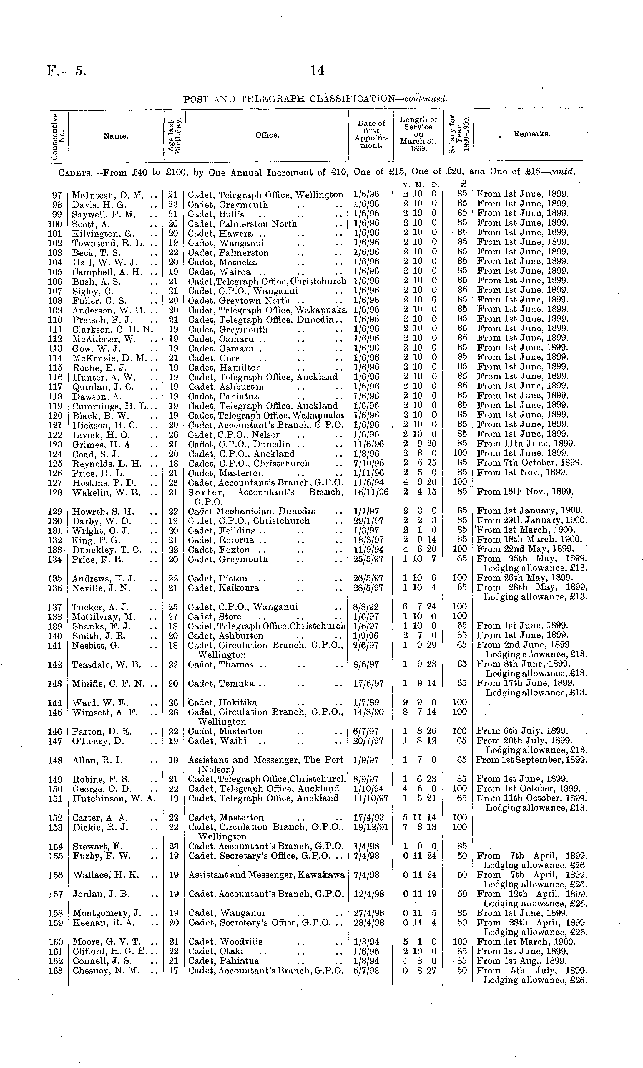 Id o o Name. Si Office. Date of first Appointment. Length of o g Service "T Js o> on ut~f March 31, ,2i*§ 1899. * 3 Remarks. 0; lDets. —Prom £40 to £10 I, by One Annual Increment of £10, One of i 115, One of £20, £ 85 85 85 85 85 85 85 85 85 85 85 85 85 85 85 85 85 85 85 85 85 85 85 85 85 85 85 100 85 85 100 85 md One of £15— contd. 97 98 99 100 101 102 103 104 105 106 107 108 109 110 111 112 113 114 115 116 117 118 119 120 121 122 123 124 125 126 127 128 Mclntosh, D. M. Davis, H. G. Saywell, P. M. Scott, A. Kilvington, G. Townsend, R. L. Beck, T. S. Hall, W. W. J. .. Campbell, A. H. Bush, A. S. Sigley, C. Fuller, G. S. Anderson, W. H. .. Pretsch, P. J. Clarkson, C. H. N. McAllister, W. Gow, W. J. McKenzie, D. M. .. Roche, E. J. Hunter, A. W. Quinlan, J. C. Dawson, A. Cummings, H. L... Black, B. W. Hickson, H. C. .. Livick, H. O. Grimes, H. A. Coad, S. J. Reynolds, L. H. Price, H. L. Hoskins, P. D. Wakelin, W. R. 21 23 21 20 20 19 22 20 19 21 21 20 20 21 19 19 19 21 19 19 19 19 19 19 20 26 21 20 18 21 23 21 Cadet, Telegraph Office, Wellington Cadet, Greymouth Cadet, Bull's Cadet, Palmerston North Cadet, Hawera Cadet, Wanganui Cadet, Palmerston Cadet, Motueka Cadet, Wairoa Cadet,Telegraph Office, Christchurch Cadet, C.P.O., Wanganui Cadet, Greytown North Cadet, Telegraph Office, Wakapuaka Cadet, Telegraph Office, Dunedin.. Cadet, Greymouth Cadet, Oamaru Cadet, Oamaru Cadet, Gore Cadet, Hamilton Cadet, Telegraph Office, Auckland Cadet, Ashburton Cadet, Pahiatua Cadet, Telegraph Office, Auckland Cadet, Telegraph Office, Wakapuaka Cadet, Accountant's Branch, G.P.O. Cadet, C.P.O., Nelson Cadet, C.P.O., Dunedin .. Cadet, C.PO., Auckland Cadet, C.P.O., Christchurch Cadet, Masterton Cadet, Accountant's Branch, G.P.O. Sorter, iccountan t's Branch, G.P.O. Cadet Mechanician, Dunedin Cadet, C.P.O., Christchurch Cadet, Feilding .. Cadet, Rotorua Cadet, Poxton Cadet, Greymouth 1/6/96 1/6/96 1/6/96 1/6/96 J/6/96 1/6/96 1/6/96 1/6/96 1/6/96 1/6/96 1/6/96 1/6/96 1/6/96 1/6/96 1/6/96 1/6/96 1/6/96 1/6/96 1/6/96 1/6/96 1/6/96 1/6/96 1/6/96 1/6/96 1/6/96 1/6/96 11/6/96 1/8/96 7/10/96 1/11/96 11/6/94 16/11/96 Y. M. D. 2 10 0 2 10 0 2 10 0 2 10 0 2 10 0 2 10 0 2 10 0 2 10 0 2 10 0 2 10 0 2 10 0 2 10 0 2 10 0 2 10 0 2 10 0 2 10 0 2 10 0 2 10 0 2 10 0 2 10 0 2 10 0 2 10 0 2 10 0 2 10 0 2 10 0 2 10 0 2 9 20 2 8 0 2 5 25 2 5 0 4 9 20 2 4 15 From 1st June, 1899. Prom 1st June, 1899. From 1st June, 1899. Prom 1st June, 1899. From 1st June, 1899. Prom 1st June, 1899. Prom 1st June, 1899. Prom 1st June, 1899. Prom 1st June, 1899. Prom 1st June, 1899. Prom 1st June, 1899. Prom 1st June, 1899. Prom 1st June, 1899. Prom 1st June, 1899. From 1st June, 1899. Prom 1st June, 1899. Prom 1st June, 1899. Prom 1st June, 1899. Prom 1st June, 1899. Prom 1st June, 1899. From 1st June, 1899. Prom 1st June, 1899. Prom 1st June, 1899. Prom 1st June, 1899. Prom 1st June, 1899. Prom 1st June, 1899. From 11th June, 1899. Prom 1st June, 1899. From 7th October, 1899. Prom 1st Nov., 1899. Prom 16th Nov., 1899. 129 130 131 132 133 134 Howrth, S. H. Darby, W. D. Wright, O. J. King, F. G. Dunckley, T. C. Price, F. R. 22 19 20 21 22 20 1/1/97 29/1/97 1/3/97 18/3/97 11/9/94 25/5/97 2 3 0 2 2 3 2 10 2 0 14 4 6 20 1 10 7 85 85 85 85 100 65 Prom 1st January, 1900. From 29th January, 1900. 'From 1st March, 1900. From 18th March, 1900. From 22nd May, 1899. From 25th May, 1899. Lodging allowance, £13. Prom 2Gth May, 1899. Prom 28th May, 1899 : Lodging allowance, £13. 135 136 Andrews, F. J. Neville, J. N. 22 21 Cadet, Picton Cadet, Kaikoura 26/5/97 28/5/97 1 10 6 1 10 4 100 65 137 138 139 140 141 Tucker, A. J. McGilvray, M. Shanks, F. J. Smith, J. R. Nesbitt, G. 25 27 18 20 18 Cadet, C.P.O., Wanganui Cadet, Store Cadet, Telegraph Omco.Christchurch Cadet, Ashburton Cadet, Circulation Branch, G.P.O., Wellington Cadet, Thames 8/8/92 1/6/97 1/6/97 1/9/96 2/6/97 6 7 24 1 10 0 1 10 0 2 7 0 1 9 29 100 100 85 85 65 Prom 1st June, 1899. Prom 1st June, 1899. From 2nd June, 1899. Lodging allowance, £13, Prom 8th June, 1899. Lodging allowance, £13. Prom 17th June, 1899. Lodging allowance, £13, 142 Teasdale, W. B. 22 8/6/97 1 9 23 65 143 Minifle, C. F. N. 20 Cadet, Temuka 17/6/97 1 9 14 65 144 145 146 147 Ward, W. E. Wimsett, A. P. 26 28 22 19 Cadet, Hokitika Cadet, Circulation Branch, G.P.O., Wellington Cadet, Masterton Cadet, Waihi 1/7/89 14/8/90 9 9 0 8 7 14 1 8 26 1 8 12 100 100 100 65 Prom 6th July, 1899. From 20th July, 1899. Lodging allowance, £13, From 1st September, 1899, Parton, D. E. O'Leary, D. 6/7/97 20/7/97 148 149 150 151 Allan, R. I. Robins, F. S. George, O. D. Hutchinson, W. A. 19 21 22 19 Assistant and Messenger, The Port (Nelson) Gadet, Telegraph Office,Christchurch Cadet, Telegraph Office, Auckland Cadet, Telegraph Office, Auckland 1/9/97 8/9/97 1/10/94 11/10/97 17 0 1 6 23 4 6 0 1 5 21 65 85 100 65 From 1st June, 1899. Prom 1st October, 1899. Prom 11th October, 1899. Lodging allowance, £18, 152 153 Carter, A. A. Dickie, R. J. 22 22 Cadet, Masterton Cadet, Circulation Branch, G.P.O., Wellington Cadet, Accountant's Branch, G.P.O. Cadet, Secretary's Office, G.P.O. .. 17/4/93 19/12/91 5 11 14 7 3 13 100 100 From 7th April, 1899, Lodging allowance, £26, Prom 7th April, 1899, Lodging allowance, £26, Prom 12th April, 1899, Lodging allowance, £26 From 1st June, 1899. Prom 28th April, 1899, Lodging allowance, £26 Prom 1st March, 1900. Prom 1st June, 1899. Prom 1st Aug., 1899. Prom 5th July, 1899. Lodging allowance, £26. 154 155 Stewart, F. Furby, F. W. 23 19 1/4/98 7/4/98 10 0! 0 11 24 85 50 156 Wallace, H. K. 19 Assistant and Messenger, Kawakawa 7/4/98 0 11 24 50 157 Jordan, J. B. 19 Cadet, Accountant's Branch, G.P.O. 12/4/98 0 11 19 50 158 159 Montgomery, J. .. Keenan, R. A. 19 20 Cadet, Wanganui Cadet, Secretary's Office, G.P.O. .. 27/4/98 28/4/98 0 11 5 0 11 4 85 50 160 161 162 163 Moore, G. V. T. Clifford, H. G. E. .. Connell, J. S. Chesney, N. M. .. 21 22 21 17 Cadet, Woodville Cadet, Otaki Cadet, Pahiatua Cadet, Accountant