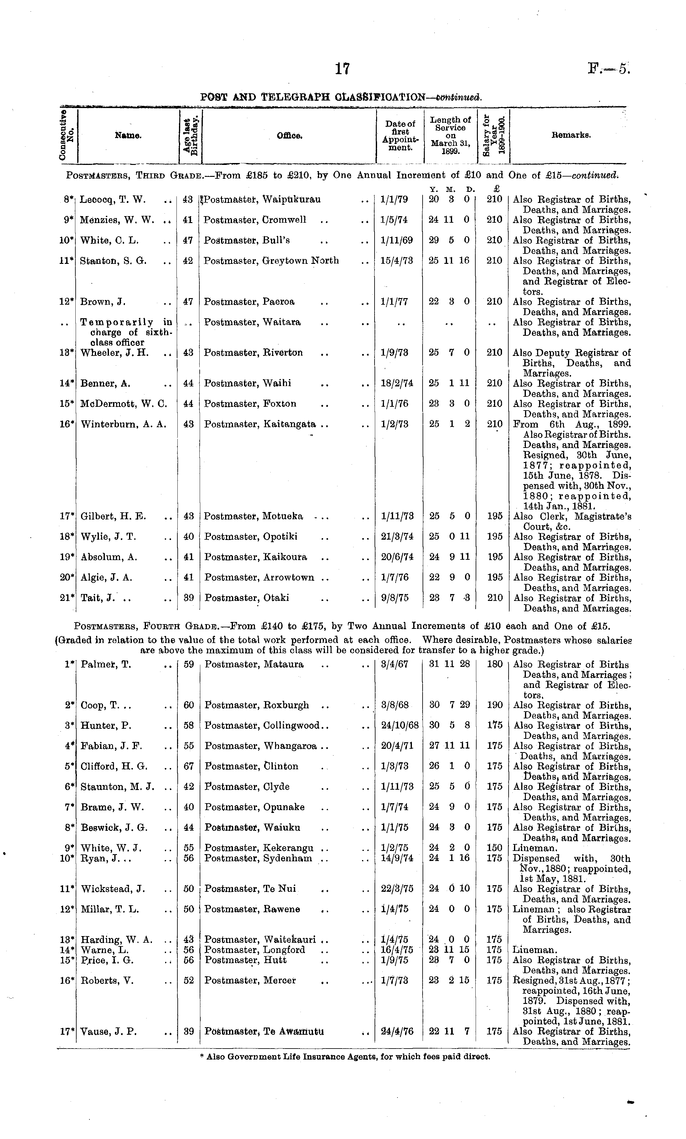 I II a a Name. ■a >> 4 Office. APP" 1 ?'- March 31, £$& ment. 1G0Q t≤ eg Remarks. istMastbks, Third G rRAD s.—Prom £185 to £210, by One Ann >ual Increment of £10 and One i One of £15 — continued. of £15 — cont , : 8* Leoocq, T. W. 43 Waipukurau Y. M. D. £ 1/1/79 20 3 0 210 ( Also D, I Also Registrar of Births, Deaths, and Marriages. Also Registrar of Births, Deaths, and Marriages. Also Registrar of Births, Deaths, and Marriages. Also Registrar of Births, Deaths, and Marriages, and Registrar of Electors. Also Registrar of Births, Deaths, and Marriages. Also Registrar of Births, Deaths, and Marriages. 3 Registrar oi >en,fchs. n.nd M 9* Menzies, W. W. .. 41 Postmaster, Cromwell 1/5/74 24 11 0 210 Also D< 'eatns, ana ivx; 3 Registrar oi ►efl.t.hs. n.nd M 10* White, C. L. 47 Postmaster, Bull's 1/11/69 29 5 0 210 Also D< 'eatns, ana ivi 3 Registrar of Ifis.ths. n.nrl M 11* Stanton, S. G. 42 Postmaster, Greytown North u< 15/4/73 25 11 16 210 Also Di an leatns, ana ivi 3 Registrar oi leaths, and M; nd Registrar Brown, J. Postmaster, Paeroa an to 1/1/77 22 3 0 210 Also D< na itegistrar 3rs. 3 Registrar ol >eaths, and M 12* 47 210 Temporarily in charge of sixtholass officer Wheeler, J. H. Postmaster, Waitara Also D< d Registrar oi leaths, and M 13* 43 Postmaster, Riverton 1/9/73 25 7 0 210 Also 210 Also Deputy Registrar of Births, Deaths, and Marriages. Also Registrar of Births, Deaths, and Marriages. Also Registrar of Births, Deaths, and Marriages. From 6th Aug., 1899. Also Registrar of Births. Deaths, and Marriages. Resigned, 30th June, 1877; reappointed, 15th June, 1878. Dispensed with, 30th Nov., 1880; reappointed, 14th Jan., 1881. Also Clerk, Magistrate's Court, &o. Also Registrar of Births, Deaths, and Marriages. Also Registrar of Births, Deaths, and Marriages. Also Registrar of Births, Deaths, and Marriages. Also Registrar of Births, Deaths, and Marriages. 3 Deputy Reg lirHis Tlno.t.V Benner, A. Postmaster, Waihi 210 iirtns, JJeatr rarrifl.pffis. 14* 44 ivi 18/2/74 25 1 11 210 Also D< larriages. 3 Registrar o] leaths. and M 15* MoDermott, W. C. 44 Postmaster, Poxton 1/1/76 23 3 0 210 Also D, 210 >eatns, ana m 3 Registrar o] )<mt,Vis. 9.nd M 16* Winterburn, A. A. 43 Postmaster, Kaifcangata L>i 1/2/73 25 1 2 210 Proi 210 'eatns, ana ivi m 6th Aug Gilbert, H. E. Postmaster, Motueka 17* 43 1/11/73 25 5 0 195 18* Wylie, J. T. 40 Postmaster, Opotiki 21/3/74 25 0 11 195 19* Absolum, A. 41 Postmaster, Kaikoura 20/6/74 24 9 11 195 20* Algie, J. A. 41 Postmaster, Arrowtown 1/7/76 22 9 0 195 21* Tait, J. .. 39 Postmaster, Otaki 9/8/75 23 7 3 210 Postmasters, Poubti ,ade.—Prom £140 to £175, by Two 1 e of the total work performed at eacl e maximum of this class will be consii junual In;rements o E £10 each and One of £15. i Gβ. ;Gra< 1* 2* 3* 4* 5* 6* led in relation to the are aboi Palmer, T. Coop, T. .. Hunter, P. Pabian, J. F. Clifford, H. G. Staunton, M. J. valui re th( 59 GO 58 55 67 ■12 Postmaster, Mataura Postmaster, Roxburgh Postmaster, Gollingwood.. Postmaster, Whangaroa Postmaster, Clinton Postmaster, Clyde i office. ' lered for t: 3/4/67 3/8/68 24/10/68 20/4/71 1/3/73 1/11/73 Where desii •ansfer to a 31 11 28 30 7 29 30 5 8 27 11 11 26 1 0 25 5 0 •able, 1 highe: 180 190 175 175 175 175 Postmasters whose salaries c grade.) Also Registrar of Births Deaths, and Marriages ; and Registrar of Electors. Also Registrar of Births, Deaths, and Marriages. Also Registrar of Births, Deaths, and Marriages. Also Registrar of Births, Deaths, and Marriages. Also Registrar of Births, Deaths, and Marriages. Also Registrar of Births, Deaths, and Marriages. Also Registrar of Births, Deaths, and Marriages. Also Registrar of Births, Deaths, and Marriages. Lineman. Dispensed with, 30th Nov., 1880; reappointed, 1st May, 1881. Also Registrar of Births, Deaths, and Marriages. Lineman ; also Registrar of Births, Deaths, and Marriages. 7* Brame, J. W. 40 Postmaster, Opunake 1/7/74 24 9 0 175 8* Beswick, J. G. 44 Postmaster, Waiuku 1/1/75 24 3 0 175 9* 10* White, W. J. Ryan, J. .. 55 56 Postmaster, Kekerangu Postmaster, Sydenham .. 1/2/75 14/9/74 24 2 0 24 1 16 150 175 11* Wickstead, J. 50 I Postmaster, Te Nui 22/3/75 24 0 10 175 12* Millar, T. L. 50 j Postmaster, Rawene 1/4/75 24 0 0 175 13* 14* 15* Harding, W. A. .. Warne, L. Price, I. G. 43 5G 56 Postmaster, Waitekauri Postmaster, Longford Postmaster, Hutt 1/4/75 16/4/75 1/9/75 24 0 0 23 11 15 23 7 0 175 175 175 Lineman. Also Registrar of Births, Deaths, and Marriages. Resigned, 31st Aug., 1877 ; reappointed, 16th June, 1879. Dispensed with, 31st Aug., 1880; reappointed, 1st June, 1881. Also Registrar of Births, Deaths, and Marriages. 16* Roberts, V. 52 Postmaster, Mercer 1/7/73 23 2 15 175 Vause, J. P. Postmaster, Te Awamutu 24/4/76 22 11 7 17* 39 175 * Also Government Life Insurance Agents, for which fees paid direct.