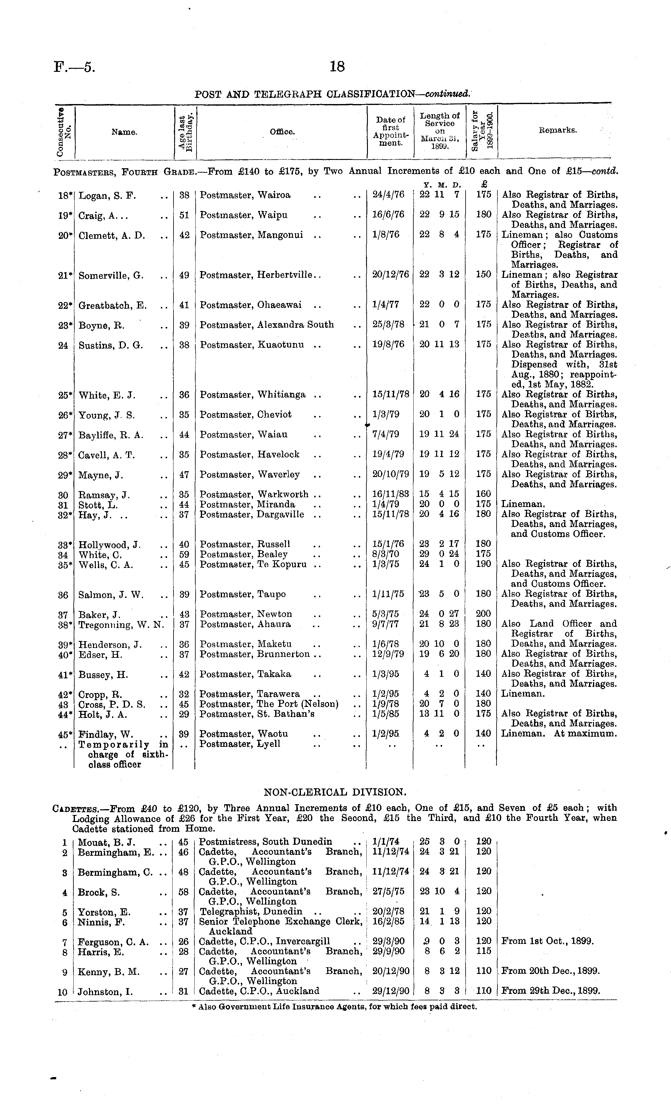 I 1 o i o Name. +3 t>1 Office. Date of first Appointment. Length of o g Service t* j< a> on PS? MaroiiSl, ,2W§ 1899. I 3 Bemarks. ?OS1 [MASTERS, FOURTH GRADE. ;ADE, .—From £140 to £175, by Two Ann iual Increments of £ lents of Si. L0 each and One of £15 — contd. .0 eac! 18* Logan, S. F. .. 38 38 Postmaster, Wairoa y. m. v>. 24/4/76 22 11 7 y. m. t>. 22 11 7 £ 175 Also Registrar of Births, Deaths, and Marriages. 180 Also Registrar of Births, Deaths, and Marriages. 175 Lineman; also Customs Officer; Registrar of Births, Deaths, and Marriages. 150 Lineman ; also Registrar of Births, Deaths, and Marriages. 175 Also Registrar of Births, Deaths, and Marriages. 175 Also Registrar of Births, Deaths, and Marriages. 175 Also Registrar of Births, Deaths, and Marriages. Dispensed with, 31st Aug., 1880; reappointed, 1st May, 1882. 175 Also Registrar of Births, Deaths, and Marriages. 175 Also Registrar of Births, Deaths, and Marriages. 175 Also Registrar of Births, Deaths, and Marriages. 175 Also Registrar of Births, Deaths, and Marriages. 175 Also Registrar of Births, Deaths, and Marriages. 160 £ 175 19* Craig, A. .. .. 51 51 Postmaster, Waipu 16/6/76 22 9 15 22 9 15 180 20* Clemett, A. D. .. 42 42 Postmaster, Mangonui 1/8/76 22 8 4 22 8 4 175 Somerville, 6. .. 49 Postmaster, Herbertville.. 20/12/76 22 3 12 22 3 12 150 21* 49 22* Greatbatoh, E. .. 41 41 Postmaster, Ohaeawai 1/4/77 22 0 0 22 0 0 175 23* Boyne, R. .. 39 89 Postmaster, Alexandra South 25/3/78 21 0 7 21 0 7 175 24 Sustins, D. G. .. 38 38 Postmaster, Kuaotunu 19/8/76 20 11 13 20 11 13 175 White, E. J. .. 36 Postmaster, Whitianga 15/11/78 20 4 16 20 4 16 25* 36 175 26* Young, J. S. .. 35 35 Postmaster, Cheviot 1/3/79 20 1 0 20 1 0 175 27* Bayliffe, R. A. .. 44 44 Postmaster, Waiau 7/4/79 19 11 24 19 11 24 175 28* Cavell, A. T. .. 35 35 Postmaster, Havelock 19/4/79 19 11 12 19 11 12 175 29* Mayne, J. .. 47 47 Postmaster, Waverley 20/10/79 19 5 12 19 5 12 175 30 31 32* Ramsay. J. 35 Stott, L.' .. 44 Hay, J. .. .. 37 35 44 37 Postmaster, Warkworth Postmaster, Miranda Postmaster, Dargaville 16/11/83 15 4 15 1/4/79 20 0 0 15/11/78 20 4 16 15 4 15 20 0 0 20 4 16 175 Lineman. 180 Also Registrar of Births, Deaths, and Marriages, and Customs Officer. 180 160 175 180 33* 34 35* Hollywood, J. .. 40 White, C. .. 59 Wells, C. A. .. 45 40 59 45 Postmaster, Russell Postmaster, Bealey Postmaster, Tβ Kopuru 15/1/76 23 2 17 8/3/70 29 0 24 1/3/75 24 1 0 23 2 17 29 0 24 24 1 0 175 190 Also Registrar of Births, Deaths, and Marriages, and Customs Officer. 180 Also Registrar of Births, Deaths, and Marriages. 200 180 175 190 36 Salmon, J. W. .. 39 39 Postmaster, Taupo 1/11/75 23 5 0 j 23 5 0 j 180 37 38* Baker, J. .. 43 Tregonning, W. N. 37 43 37 Postmaster, Newton Postmaster, Ahaura 5/3/75 24 0 27 9/7/77 21 8 23 24 0 27 j 21 8 23 180 Also Land Officer and Registrar of Births, 180 Deaths, and Marriages. 180 Also Registrar of Births, Deaths, and Marriages. 140 Also Registrar of Births, Deaths, and Marriages. 140 Lineman. 200 180 39* 40' Henderson, J. 36 Edser, H. .. 37 36 37 Postmaster, Maketu Postmaster, Brunnerton 1/6/78 20 10 0 12/9/79 19 6 20 20 10 0 19 6 20 180 180 41* Bussey, H. .. 42 42 Postmaster, Takaka 1/3/95 4 10 4 10 140 42* 43 44* Cropp, R. .. 32 Cross, P. D. S. .. 45 Holt, J. A. .. 29 32 45 29 Postmaster, Tarawera Postmaster, The Port (Nelson) Postmaster, St. Bathan's 1/2/95 4 2 0 1/9/78 20 7 0 1/5/85 13 11 0 4 2 0 20 7 0 13 11 0 180 175 Also Registrar of Births, Deaths, and Marriages. 140 Lineman. At maximum. 140 180 175 45* Findlay, W. .. 39 Temporarily in .. charge of sixthclass officer 89 Postmaster, Waotu Postmaster, Lyell 1/2/95 4 2 0 4 2 0 140 NON-CLERICAL DI VISION. !ad: ittbs.—From £40 to £12( Lodging Allowance of £26 Oadette stationed from He ), by Three Annual Increments of ; for the First Year, £20 the Seoor jme. £10 each, One of £1: id, £15 the Third, i i, and Seven of £5 eaoh ; with tnd £10 the Fourth Year, when 1 2 Mouat, B. J. .. 45 Bermingham, E. .. 46 Postmistress, South Dunedin Cadette, Accountant's Branch, G.P.O., Wellington Cadette, Accountant's Branch, G.P.O., Wellington Cadette, Accountant's Branch, G.P.O., Wellington Telegraphist, Dunedin Senior Telephone Exchange Clerk, Auckland Cadette, C.P.O., Invercargill Cadette, Accountant's Branch, G.P.O., Wellington Cadette, Accountant's Branoh, G.P.O., Wellington Cadette, C.P.O., Auckland 1/1/74 25 3 0 11/12/74 24 3 21 120 120 3 Bermingham, C. .. 48 11/12/74 24 3 21 120 4 Brock, S. .. 58 1 27/5/75 23 10 4 120 5 6 Yorston, E. .. 37 Ninnis, F. .. 37 20/2/78 21 1 9 16/2/85 14. 1 13 120 120 7 8 Ferguson, C. A. .. j 26 Harris, E. .. 28 29/3/90 5 0 3 29/9/90 8 6 2 120 From 1st Oct., 1899. 115 9 Kenny, B. M. .. 27 20/12/90 8 3 12 110 From 20th Dec, 1899. 10 Johnston, I. .. 31 I 29/12/90 8 3 3 110 From 29th Dec, 1899. * Also Government Life Insurance Agents, for which fees paid direct.