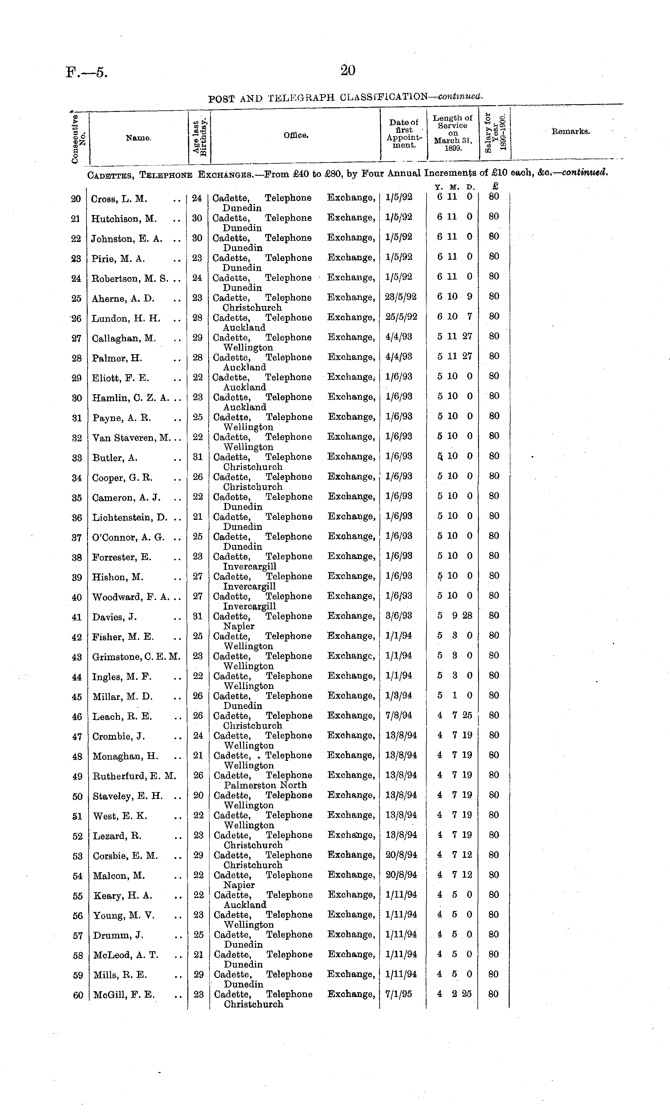 © |o Name. I 43 f>! MM "■a Office. t, , , Length ot o 2 Dateo „ l^1 Appoint- Haroll31 a|wg ment - 1899. 3 3 Remarks. Cadettes, Telephoi ; E xhanges.—From £40 to £80, by Fov ir Annual increments of £10 each, &o. — continued. 20 Cross, L. M. 24 Cadette, Telephone Exchange, Dunedin Cadette, Telephone Exchange, Dunedin Cadette, Telephone Exchange, Dunedin Cadette, Telephone Exchange, Dunedin Cadette, Telephone Exchange, Dunedin Cadette, Telephone Exchange, Chris tchurch Cadette, Telephone Exchange, Auckland Cadette, Telephone Exchange, Wellington Cadette, Telephone Exchange, Auckland Cadette, Telephone Exchange, Auckland Cadette, Telephone Exchange, Auckland Cadette, Telephone Exchange, Wellington Cadette, Telephone Exchange, Wellington Oadette, Telephone Exchange, Christchurch Cadette, Telephone Exchange, Christchurch Cadette, Telephone Exchange, Dunedin Cadette, Telephone Exchange, Dunedin Cadette, Telephone Exchange, Dunedin Cadette, Telephone Exchange, Invercargill Cadette, Telephone Exchange, Invercargill Cadette, Telephone Exchange, Invercargill Cadette, Telephone Exchange, Napier Cadette, Telephone Exchange, Wellington Cadette, Telephone Exchange, Wellington Cadette, Telephone Exchange, Wellington Cadette, Telephone Exchange, Dunedin Cadette, Telephone Exchange, Christchurch Cadette, Telephone Exchange, Wellington Cadette, . Telephone Exchange, Wellington Cadette, Telephone Exchange, Palmerston North Cadette, Telephone Exchange, Wellington Cadette, Telephone Exchange, Wellington Cadette, Telephone Exchange, Christchurch Cadette, Telephone Exchange, Christchurch Cadette, Telephone Exchange, Napier Cadette, Telephone Exchange, Auckland Cadette, Telephone Exchange, Wellington Cadette, Telephone Exchange, Dunedin Cadette, Telephone Exchange, Dunedin Cadette, Telephone Exchange, Dunedin Cadette, Telephone Exchange, Christchurch 1/5/92 Y. M. D. 6 11 0 80 20 2] Hutchison, M. 2] 30 1/5/92 6 11 0 80 22 Johnston, E. A. 22 30 1/5/92 6 11 0 80 23 Pirie, M. A. 23 23 1/5/92 6 11 0 80 24 Robertson, M. S. 24 24 1/5/92 6 11 0 80 25 Aherne, A. D. 25 23 23/5/92 6 10 9 80 26 Lundon, H. H. 26 28 25/5/92 6 10 7 80 27 Callaghan, M. 27 29 4/4/93 5 11 27 80 28 Palmer, H. 28 28 4/4/93 5 11 27 80 29 Eliott, F. E. 29 22 1/6/93 5 10 0 80 30 Hamlin, 0. Z. A. .. 30 23 1/6/93 5 10 0 80 81 Payne, A. B. 81 25 1/6/93 5 10 0 80 32 Van Staveren, M... 32 22 1/6/93 5 10 0 80 33 Butler, A. 33 81 1/6/93 5 10 0 80 34 Cooper, G. E. 34 26 1/6/93 5 10 0 80 35 Cameron, A. J. 35 22 1/6/93 5 10 0 80 36 Liohtenstein, D. .. 30 21 1/6/93 5 10 0 80 37 O'Connor, A. G. 37 25 1/6/93 5 10 0 80 38 Forrester, E. 38 23 1/6/93 5 10 0 80 39 Hishon, M. 39 27 1/6/93 5 10 0 80 40 Woodward, F. A. .. 40 27 1/6/93 5 10 0 80 41 41 Da vies, J. 81 3/6/93 5 9 28 80 42 Fisher, M. E. 42 25 1/1/94 5 3 0 80 43 Grimstone, C. E. M. 43 23 1/1/94 5 3 0 80 44 Ingles, M. F. 44 22 1/1/94 5 3 0 80 45 Millar, M. D. 45 20 1/3/94 5 10 80 4G 46 Leach, E. E. 26 7/8/94 4 7 25 80 47 47 Crombie, J. 24 13/8/94 4 7 19 80 43 Monaghan, H. 48 21 13/8/94 4 7 19 80 49 Eutherfurd, E. M. 49 20 13/8/94 4 7 19 80 50 Staveley, E. H. 50 20 13/8/94 4 7 19 80 51 West, E. K. 51 22 13/8/94 4 7 19 80 52 Lezard, E. 52 23 13/8/94 4 7 19 80 53 53 Corsbie, E. M. 29 20/8/94 4 7 12 80 54 Malcon, M. 54 22 20/8/94 4 7 12 80 55 55 Keary, H. A. 22 1/11/94 4 5 0 80 56 Young, M. V. 50 23 1/11/94 4 5 0 80 57 57 Drnmm, J. 25 1/11/94 4 5 0 80 58 McLeod, A. T. 58 21 1/11/94 4 5 0 80 59 59 Mills, E. E. 29 1/11/94 4 5 0 80 60 McGill, F. E. 60 23 7/1/95 4 2 25 80