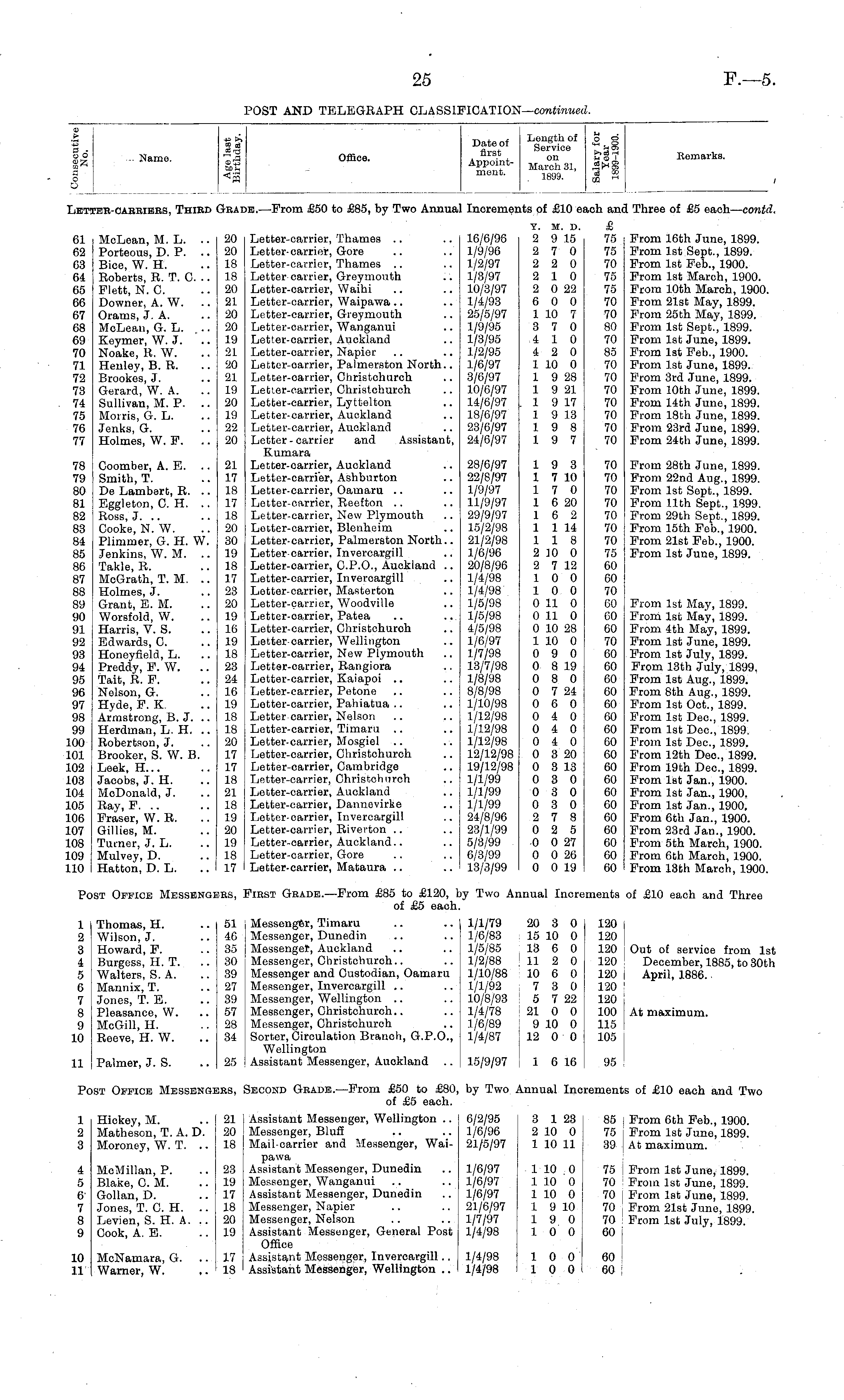 > id o o . Name. Office. Date of first Appointment. Length of o g Service "T y S on CgT March 31, S.^'S. . 1899. $ S llemarks. / ta CER-CABEIBBS, THIRD Gra: iE. —From £50 to £85, by Two Annual Inorements of £10 ei ach and Three of £5 each— contd. 61 62 63 64 65 66 67 68 69 70 71 72 73 74 75 76 77 78 79 80 81 82 83 84 85 86 87 88 89 90 91 92 93 94 95 96 97 98 99 LOO L01 L02 103 L04 105 106 -07 :os ,09 .10 McLean, M. L. .. Porteous, D. P. Bice, W. H. Eoberts, B. T. C. .. Flett, N. C. Downer, A. W. Orams, J. A. McLean, G. L. Keymer, W. J. Noake, R. W. Henley, B. R. Brookes, J. Gerard, W. A. Sullivan, M. P. Morris, G. L. Jenks, G. Holmes, W. F. Coomber, A. B. Smith, T. De Lambart, R. .. Eggleton, C. H. Ross, J. .. Cooke, N. W. Plimmer, G. H. W. Jenkins, W. M. Takle, R. McGrath, T. M. Holmes, J. Grant, E. M. Worefold, W. Harris, V. S. Edwards, C. Honeyfield, L. Preddy, F. W. .. Tait, R. F. Nelson, G. Hyde, F. K. Armstrong, B. J. Herdman, L. H. Robertson, J. Brooker, S. W. B. Leek, H... Jacobs, J. H. McDonald, J. Ray, F. .. Eraser, W. R. Gillies, M. Turner, J. L. Mulvey, D. Hatton, D. L. 20 20 18 18 20 21 20 20 19 21 20 21 19 20 19 22 20 21 17 18 17 18 20 30 19 18 17 23 20 19 16 19 18 23 24 16 19 18 18 20 17 17 18 21 18 19 20 19 18 17 Y. M. D. Letter-carrier, Thames .. .. 16/6/98 2 9 15 Letter-carrior, Gore .. .. 1/9/96 2 7 0 Letter-carrier, Thames .. .. 1/2/97 2 2 0 Letter carrier, Grey month .. 1/3/97 2 10 Letter-carrier, VVaihi .. .. 10/3/97 2 0 22 Letter-carrier, Waipawa .. .. 1/4/93 6 0 0 Letter-carrier, Greymouth .. 25/5/97 1 10 7 Letter-carrier, Wanganui .. 1/9/95 3 7 0 Letter-carrier, Auckland .. 1/3/95 4 10 Letter-carrier, Napier .. .. 1/2/95 4 2 0 Lettor-oarrier, Palmerston North.. 1/6/97 1 10 0 Letter-carrier, Christchurch .. 3/6/97 1 9 28 Letter-carrier, Christchurch .. 10/6/97 1 9 21 Letter-carrier, Lyttelton .. 14/6/97 . 1 9 17 Letter-carrier, Auckland .. 18/6/97 1 9 13 Letter-carrier, Auckland .. 23/6/97 19 8 Letter-carrier and Assistant, 24/6/97 19 7 K-umara Letter-carrier, Auckland .. 28/6/97 19 3 Letter-carrier, Ashburton .. 22/8/97 1 7 10 Letter-carrier, Oamaru .. .. 1/9/97 17 0 Letter-carrier, Reefton .. .. 11/9/97 1 6 20 Letter-carrier, New Plymouth .. 29/9/97 16 2 Letter-carrier, Blenheim .. 15/2/98 1 1 14 Letter-carrier, Palmerston North.. 21/2/98 118 Letter-carrier, Invercargill .. 1/6/96 2 10 0 Letter-carrier, C.P.O., Auckland .. 20/8/96 2 7 12 Letter-carrier, Invercargill .. 1/4/98 10 0 Letter-carrier, Masterton .. 1/4/98 10 0 Letter-carrier, Woodville .. 1/5/98 0 11 0 Letter-carrier, Patea .. .. 1/5/98 0 11 0 Letter-carrier, Christchurch .. 4/5/98 0 10 28 Letter-carrier, Wellington .. 1/6/97 1 10 0 Letter-carrier, New Plymouth .. 1/7/98 0 9 0 Letter-carrier, Rangiora .. 13/7/98 0 8 19 Letter-carrier, Kaiapoi .. .. 1/8/98 0 8 0 Letter-carrier, Petone .. .. 8/8/98 0 7 24 Letter-carrier, Pahiatua .. .. 1/10/98 0 6 0 Letter carrier, Nelson .. .. 1/12/98 0 4 0 Letter-carrier, Timaru .. .. 1/12/98 0 4 0 Letter-carrier, Mosgiel .. .. 1/12/98 0 4 0 Letter-carrier, Christchurch .. 12/12/98 0 3 20 Letter-carrier, Cambridge .. 19/12/98 0 3 13 Letter-carrier, Christchurch .. 1/1/99 0 3 0 Letter-carrier, Auckland .. 1/1/99 0 3 0 Letter-carrier, Dannevirke .. 1/1/99 0 3 0 Letter-carrier, Invercargill .. 24/8/96 2 7 8 Letter-carrier, Riverton .. .. 23/1/99 0 2 5 Letter-carrier, Auckland.. .. 5/3/99 0 0 27 Letter-carrier, Gore .. .. 6/3/99 0 0 26 Letter-carrier, Mataura .. .. 13/3/99 0 0 19 £ 75 From 16th June, 1899. 75 From 1st Sept., 1899. 70 From 1st Feb., 1900. 75 From 1st March, 1900. 75 From 10th March, 1900. 70 From 21st May, 1899. 70 From 25th May, 1899. 80 From 1st Sept., 1899. 70 From 1st June, 1899. 85 From 1st Feb., 1900. 70 From 1st June, 1899. 70 From 3rd June, 1899. 70 From 10th June, 1899. 70 From 14th June, 1899. 70 From 18th June, 1899. 70 From 23rd June, 1899. 70 From 24th June, 1899. 70 From 28th June, 1899. 70 From 22nd Aug., 1899. 70 From 1st Sept., 1899. 70 From 11th Sept., 1899. 70 From 29th Sept., 1899. 70 From 15th Feb., 1900. 70 From 21st Feb., 1900. 75 From 1st June, 1899. 60 60 70 60 From 1st May, 1899. CO From 1st May, 1899. 60 From 4th May, 1899. 70 From 1st June, 1899. 60 From 1st July, 1899. 60 From 13th July, 1899. 60 From 1st Aug., 1899. 60 From 8th Aug., 1899. 60 From 1st Oct., 1899. 60 From 1st Dec, 1899. 60 From 1st Doc, 1899. 60 From 1st Dec, 1899. 60 From 12th Dec, 1899. 60 From 19th Dec, 1899. 60 From 1st Jan., 1900. 60 From 1st Jan., 1900. 60 From 1st Jan., 1900. 60 From 6th Jan., 1900. 60 From 23rd Jan., 1900. 60 From 5th March, 1900. 60 From 6th March, 1900. 60 From 13th March, 1900. Pi ist Office Messbng: IBS, Fibst Gkade. —From £85 to £120, by Two Annual Incre of £5 each. iments of £10 each and Three 1 2 3 i 5 0 7 8 9 10 Thomas, H. Wilson, J. Howard, F. Burgess, H. T. Walters, S. A. Mannix, T. Jones, T. E. Pleasance, W. McGill, H. Reeve, H. W. 51 46 35 30 39 27 39 57 28 34 Messenger, Timaru .. .. 1/1/79 20 3 0 Messenger, Dunedin .. .. 1/6/83 15 10 0 Messenger, Auckland .. .. 1/5/85 13 6 0 Messenger, Christchurch.. .. 1/2/88 11 2 0 Messenger and Custodian, Oamaru ; 1/10/88 10 6 0 Messenger, Invercargill .. .. 1/1/92 7 3 0 Messenger, Wellington .. .. 10/8/93 5 7 22 Messenger, Christchurch.. .. 1/4/78 21 0 0 Messenger, Christchurch .. 1/6/89 9 10 0 Sorter, Circulation Branch, G.P.O., 1/4/87 12 0 0 Wellington Assistant Messenger, Auckland .. 15/9/97 1 6 16 I 120 i I 120 i I 120 : Out of service from 1st j 120 December, 1885, to 30th 120 April, 1886. 120 120 100 At maximum. 115 105 95 11 Palmer, J. S. 25 Pi ist Office Messeng: IBS, Second Grade. —From £50 to £80, by Two Annual Inc: of £5 each. rements of £10 each and Two 1 2 3 Hickey, M. Matheson, T. A. D. Moroney, W. T. .. 21 20 18 Assistant Messenger, Wellington .. 6/2/95 3 1 23 Messenger, Bluff .. .. 1/6/96 2 10 0 Mail-carrier and Messenger, Wai- 21/5/97 1 10 11 pawa Assistant Messenger, Dunedin .. 1/6/97 1 10 0 Messenger, Wanganui .. .. 1/6/97 1 10 0 Assistant Messeng