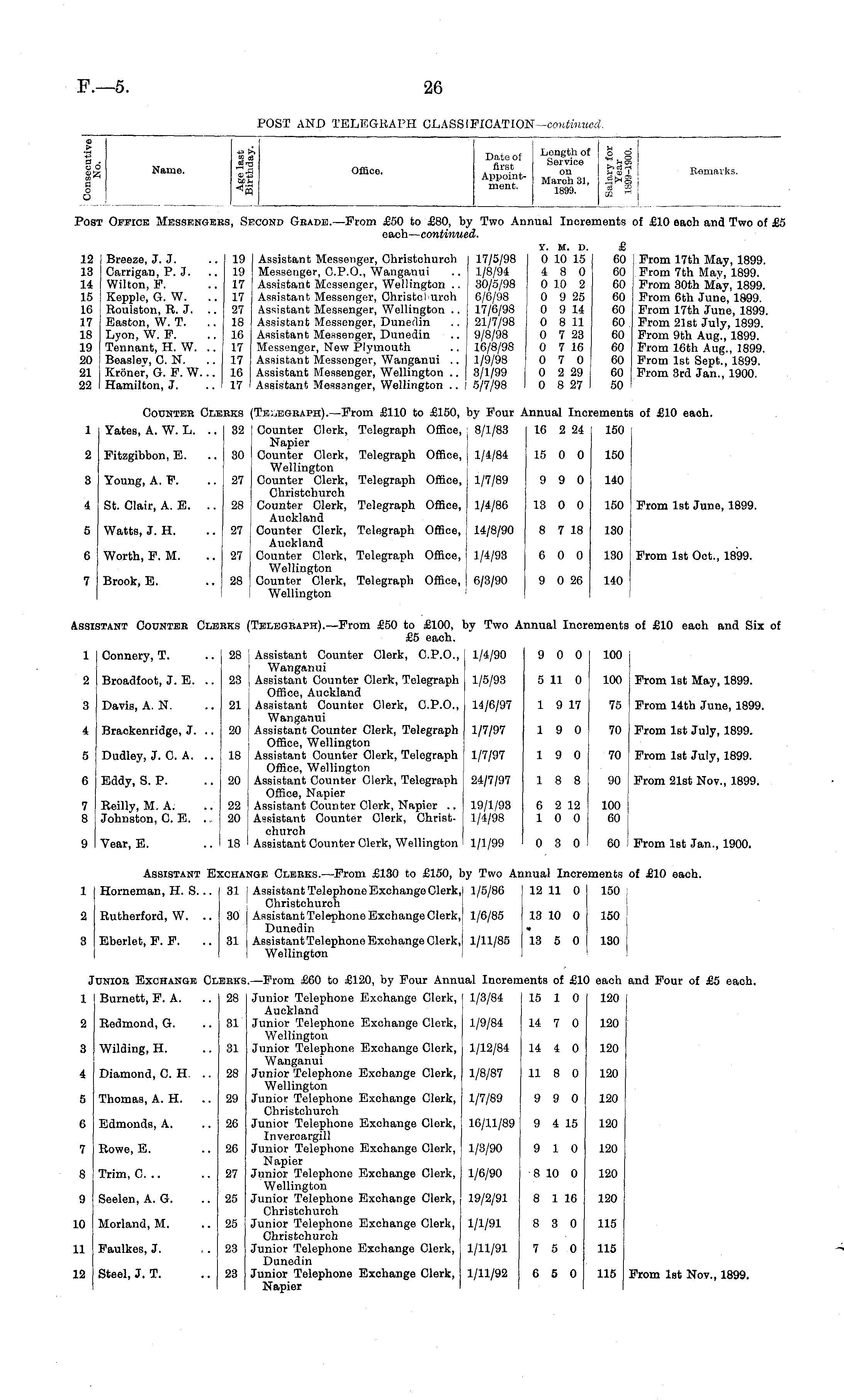 u Name. Office. I j Remarks. Post Office Messenger: Pos , i, S: Second Grade.—From £50 to £80, b; each — continue >y Two An: ed. anual Incre: ements of £10 each and Two of SI ments 12 Breeze, J. J. 13 Carrigan, P. J. 14 Wilton, F. 15 Kepple, G. W. 16 Roulston, R. J. 17 Easton, W. T. 18 Lyon, W. P. 19 Tennant, H. W. .. 20 Beasley, 0. N. 21 Kroner, G. F. W... 22 Hamilton, J. 12 18 14 15 1C 17 Iβ 19 20 21 22 19 19 17 17 27 18 16 17 17 16 17 Assistant Messenger, Christchurch Messenger, C.P.O., Wanganui Assistant Messenger, Wellington .. Assistant Messenger, Ohristel urch Assistant Messenger, Wellington .. Assistant Messenger, Dunedin Assistant Mensenger, Dunedin Messenger, New Plymouth Assistant Messenger, Wanganui .. Assistant Messenger, Wellington .. Assistant Messenger, Wellington .. ! I 17/5/98 i 1/8/94 ! 30/5/98 6/6/98 17/6/98 21/7/98 9/8/98 16/8/9S 1/9/98 3/1/99 5/7/98 ! Y. M. D. 0 10 15 4 8 0 0 10 2 0 9 25 0 9 14 0 8 11 0 7 23 0 7 16 0 7 0 0 2 29 ' 0 8 27 £ 60 From 17th May, 1899. 60 From 7th May, 1899. 60 From 30th May, 1899. 60 From 6th June, 1899. 60 From 17th June, 1899. 60 From 21st July, 1899. 60 From 9th Aug., 1899. 60 From 16th Aug., 1899. 60 From 1st Sept., 1899. 60 From 3cd Jan., 1900. 50 £ 60 60 60 60 60 60 60 60 60 60 50 Counter Clei 1 Yates, A. W. L. .. 1 IKS 32 (Telegraph).—From £110 to £150, Counter Clerk, Telegraph Office, Napier Counter Clerk, Telegraph Office, Wellington Counter Clerk, Telegraph Office, Christchurch Counter Clerk, Telegraph Office, Auckland Counter Clerk, Telegraph Office, Auckland Counter Clerk, Telegraph Office, j Wellington Counter Clerk, Telegraph Office, Wellington by Four A I 8/1/83 Annual Incr 16 2 24 irements of £10 eaoh. 150 150 rementi 150 2 Fitzgibbon, E. 2 80 I 1/1/84 15 0 0 150 3 Young, A. F. 4 St. Clair, A. E. 3 4 27 28 I 1/7/89 1/4/86 9 9 0 13 0 0 140 150 From 1st June, 1899. 1 QA 140 150 5 Watts, J. H. 5 27 14/8/90 8 7 18 130 130 From 1st Oct., 1899. 140 130 6 Worth, F. M. 6 27 1/4/93 6 0 0 130 7 Brook, E. 7 28 6/3/90 9 0 26 140 Assistant Counter Cler (Telegraph).—From £50 to £100, b £5 each. by Two Ar nnual Incre rements of £10 each and Six of .SSI! SKS 1 Connery, T. 1 28 Assistant Counter Clerk, C.P.O., Wanganui Assistant Counter Clerk, Telegraph Office, Auckland Assistant Counter Clerk, C.P.O., Wanganui I Assistant Counter Clerk, Telegraph Office, Wellington Assistant Counter Clerk, Telegraph Office, Wellington Assistant Counter Clerk, Telegraph Office, Napier Assistant Counter Clerk, Napier .. Assistant Counter Clerk, Christchurch ' Assistant Counter Clerk, Wellington 1/4/90 9 0 0 100 I 2 Broadfoot, J. E. 2 23 1/5/93 5 11 0 100 [ From 1st May, 1899. 3 Davis, A. N. s 21 14/6/97 1 9 17 75 From 14th June, 1899. 4 Brackenridge, J. .. 4 20 1/7/97 19 0 70 J From 1st July, 1899. 5 Dudley, J. C. A. .. 6 18 1/7/97 19 0 70 From 1st July, 1899. 6 Eddy, S. P. 6 20 24/7/97 18 8 90 From 21st Nov., 1899. 7 Reilly, M. A. 8 Johnston, C. E. ., 7 3 22 20 19/1/93 1/4/98 6 2 12 10 0 100 60 9 Year, E. 9 18 1/1/99 0 3 0 60 I From 1st Jan., 1900. Assistant Exi :cha: nge Clerks. —From £130 to £150, b; Assistant Telephone Exchange Clerk,! Christchurch Assistant Telephone Exchange Clerk, j Dunedin Assistant Telephone Exchange Clerk, j Wellington >y Two Am mual Increr iments of £10 each. 1 Horneman, H. S... 2 Rutherford, W. .. 3 Eberlet, F. F. 31 30 1/5/86 1/6/85 12 11 0 13 10 0 13 5 0 150 i 150 31 1/11/85 130 Junior Exchange Cle I.—From £60 to £120, by Four Annui Junior Telephone Exchange Clerk, Auckland Junior Telephone Exchange Clerk, Wellington Junior Telephone Exchange Clerk, Wanganui Junior Telephone Exchange Clerk, Wellington Junior Telephone Exchange Clerk, Christchurch Junior Telephone Exchange Clerk, Invercargill Junior Telephone Exchange Clerk, Napier Junior Telephone Exchange Clerk, Wellington Junior Telephone Exchange Clerk, Christchurch Junior Telephone Exchange Clerk, Christchurch Junior Telephone Exchange Clerk, Dunedin Junior Telephone Exchange Clerk, Napier ial Increme tents of £10 D each and Four of £5 each. srk: 1 Burnett, F. A. 28 1/3/84 15 1 0 120 2 Redmond, G. 81 1/9/84 14 7 0 120 3 Wilding, H. 31 1/12/84 14 4 0 120 4 Diamond, C. H. as 1/8/87 11 8 0 120 5 Thomas, A. H. 29 1/7/89 9 9 0 120 6 Edmonds, A. 26 16/11/89 9 4 15 120 7 Rowe, E. 26 1/3/90 9 10 120 8 Trim, C. .. 27 1/6/90 8 10 0 120 9 Seelen, A. G. .. : 25 19/2/91 8 1 16 120 10 Morland, M. 25 1/1/91 8 3 0 115 11 Faulkes, J. ,.. : 23 1/11/91 7 5 0 115 12 Steel, J. T. .. : 23 1/11/92 6 5 0 115 From 1st Nov., 1899. From 1st Nov., 1899.