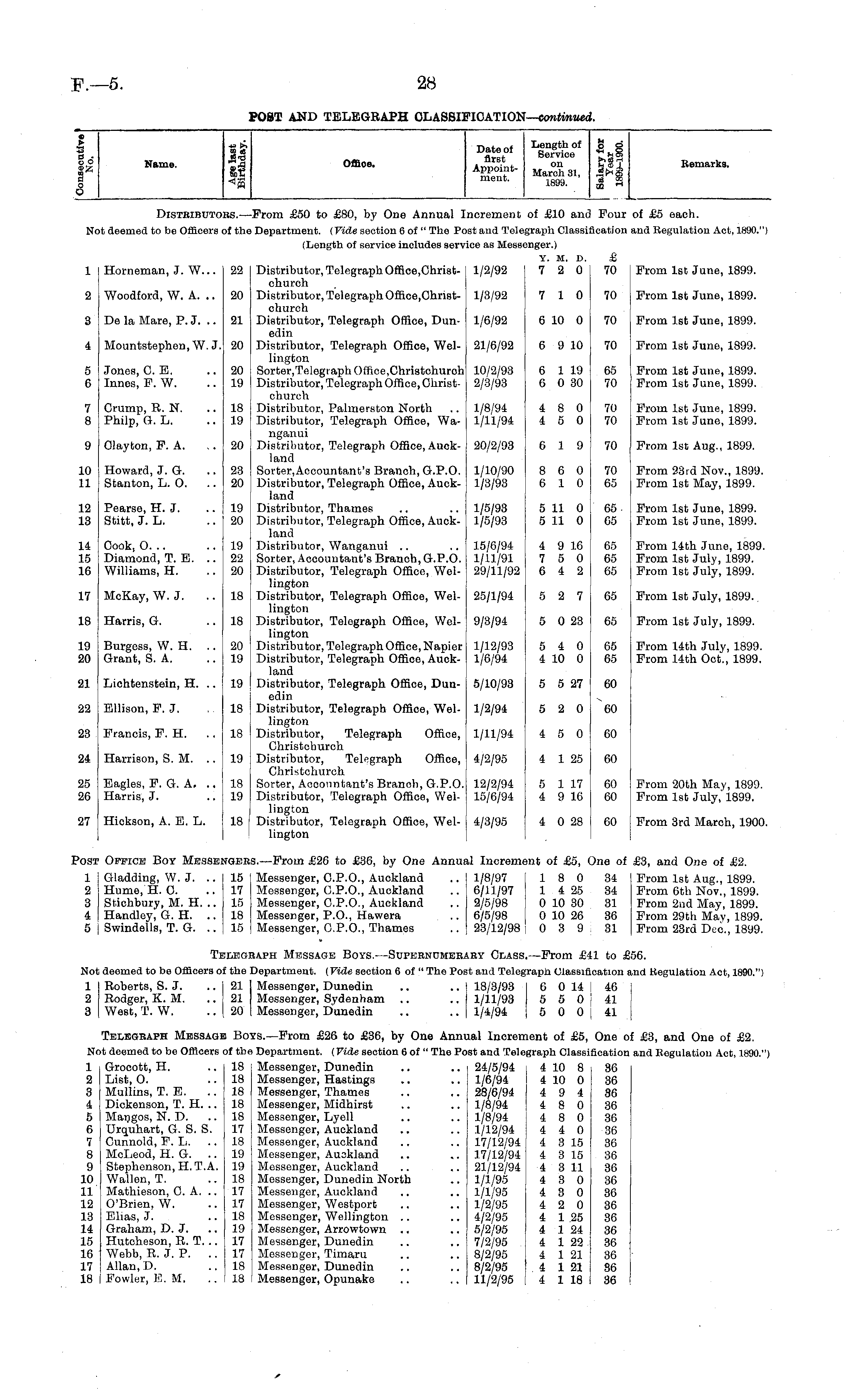 u I Name. 8,1 Office. Date of first Appointment. Length of Service on March 31, 1899. JStSg Remarks. Distbibuto: is.— -Prom £50 to £80, by One Annual I [ncrement of £10 and ) Pour of £5 each. >t deemed to be Officers < if th. 3 Department. (Vide section 6 of " The Pc (Length of service includes sew ust and Teleg graph Classif fication and Begulation Act, 1890.") Horneman, J. W... Distributor, Telegraph Office,Christchurch Distributor, Telegraph Office,Ghristchurch Distributor, Telegraph Office, Dunedin Distributor, Telegraph Office, Wellington Sorter,Telegraph Office,Christchuroh Distributor, Telegraph Office, Ohristchurch Distributor, Palmerston North Distributor, Telegraph Office, Wanganui Distributor, Telegraph Office, Auckland Sorter,Accountanfc's Branch, G.P.O. Distributor, Telegraph Office, Auckland Distributor, Thames Distributor, Telegraph Office, Auckland Distributor, Wanganui Sorter, Accountant's Branoh, G.P.O. Distributor, Telegraph Office, Wellington Distributor, Telegraph Office, Wellington Distributor, Telegraph Office, Wellington Distributor, Telegraph Office, Napier Distributor, Telegraph Office, Auckland Distributor, Telegraph Office, Dunedin Distributor, Telegraph Office, Wellington Distributor, Telegraph Office, Christcburch Distributor, Telegraph Office, Christchurch Sorter, Accountant's Branch, G.P.O. Distributor, Telegraph Office, Wellington Distributor, Telegraph Office, Wellington dee as Messe 1/2/92 jnger.) Y. M. D. 7 2 0 £ 70 Prom 1st June, 1899. 1 22 2 Woodford, W. A. .. 20 1/3/92 7 10 70 Prom 1st June, 1899. 3 De la Mare, P. J. 21 1/6/92 6 10 0 70 Prom 1st June, 1899. 4 Mountstephen, W. J. 20 21/6/92 6 9 10 70 Prom 1st June, 1899. 5 6 Jones, C. Fj. Innes, P. W. 20 19 10/2/93 2/3/93 6 1 19 6 0 30 65 Prom 1st June, 1899. 70 Prom 1st June, 1899. 7 8 Crump, B. N. Philp, G. L. 18 19 1/8/94 1/11/94 4 8 0 4 5 0 70 Prom 1st June, 1899. 70 Prom 1st June, 1899. 9 Glayton, P. A. 20 20/2/93 6 19 70 Prom 1st Aug., 1899. 10 11 Howard, J. G. Stanton, L. O. 23 20 1/10/90 1/3/93 8 6 0 6 10 70 Prom 23rd Nov., 1899. 65 Prom 1st May, 1899. 12 13 Pearse, H. J. Stitt, J. L. 19 20 1/5/93 1/5/93 5 11 0 5 11 0 65 ■ From 1st June, 1899. 65 Prom 1st June, 1899. 14 15 16 Cook,O. .. Diamond, T. E. Williams, H. 19 22 20 15/6/94 1/11/91 29/11/92 4 9 16 7 5 0 6 4 2 65 Prom 14th June, 1899. 65 From 1st July, 1899. 65 Prom 1st July, 1899. 17 McKay, W. J. 18 25/1/94 5 2 7 65 Prom 1st July, 1899. 18 Harris, G. 18 9/3/94 5 0 23 65 From 1st July, 1899. 19 20 Burgess, W. H. Grant, S. A. 20 19 1/12/93 1/6/94 5 4 0 4 10 0 65 Prom 14th July, 1899. 65 Prom 14th Oct., 1899. 21 Lichtenstein, H. .. 19 5/10/93 5 5 27 60 22 Ellison, P. J. 18 1/2/94 5 2 0 60 23 Francis, P. H. 18 1/11/94 4 5 0 60 24 Harrison, S. M. 19 4/2/95 4 1 25 60 25 26 Eagles, F. G. A. .. Harris, J. 18 19 12/2/94 15/6/94 5 1 17 4 9 16 60 Prom 20th May, 1899. 60 From 1st July,' 1899. 27 Hiokson, A. E. L. 18 4/3/95 4 0 28 60 From 3rd March, 1900. Office Boy Mbssbi is.—Prom £26 to £36, by One Annus Messenger, O.P.O., Auckland Messenger, G.P.O., Auckland Messenger, C.P.O., Auckland Messenger, P.O., Hawera Messenger, 0.P.O., Thames al Increme snfc of £5, C 18 0 1 4 25 0 10 30 0 10 26 0 3 9 One of £3, and One of £2. 34 From 1st Aug., 1899. 34 Prom 6th Nov., 1899. 31 Prom 2nd May, 1899. 36 From 29th May, 1899. 31 Prom 23rd Dec., 1899. 'os . TGEB 1 2 3 4 5 Gladding, W.J. .. I Hume, H. C. Sfciehbury, M. H. .. Handley, G. H. Swindells, T. G. .. 15 17 15 18 15 1/8/97 6/11/97 2/5/98 6/5/98 23/12/98 i Te 1LHG] eaph Message Boys.—Supeenumerj AEY Class. .—From £4 11 to £56. No 1 ■2 3 i deemed to be Officers ol Roberts, S. J. Eodger, K. M. West, T. W. tthe: 21 21 20 Department. {Vide section 6 of " The Pos Messenger, Dunedin Messenger, Sydenham Messenger, Dunedin st and Teleg: 18/3/93 1/11/93 I 1/4/94 ;raph (Jlassifii 6 0 14 5 5 0 5 0 0 ication and Kegulation Act, 1890.") 46 41 i ±1 Telegraph Message ] Bo' ys.—From £26 to £36, by One Amu b Department. ( Vide section 6 of " The Pc Messenger, Dunedin Messenger, Hastings Messenger, Thames Messenger, Midhirst Messenger, Lyell Messenger, Auckland I Messenger, Auckland Messenger, Auckland Messenger, Auckland Messenger, Dunedin North Messenger, Auckland Messenger, Westport Messenger, Wellington Messenger, Arrowtown Messenger, Dunedin Messenger, Timaru Messenger, Dunedin : Messenger, Opunake ual Increm lent of £5, graph Classil i 10 8 4 10 0 4 9 4 4 8 0 4 8 0 4 4 0 ! 4 3 15 4 3 15 4 3 11 4 3 0 4 3 0 4 2 0 4 1 25 4 1 24 4 1 22 4 1 21 4 1 21 4 1 18 One of £3, and One of £2. ification and Regulation Act, 1890.") 36 36 36 36 36 ! 36 36 36 36 36 36 36 36 36 36 36 36 36 Nc 1 2 3 4 5 6 7 8 9 10 11 12 18 14 15 16 17 18 >t deemed to be Officers i Grooott, H. List, O. Mullins, T. E. Dickenson, T. H. .. Mangos, N. D. Urquhart, G. S. S. Cunnold, F. L. McLeod, H. G. Stephenson, H. T.A. Wallen, T. Mathieson, C. A. O'Brien. W. Elias, J. Graham, D. J. Hutcheson, E. T. .. Webb, It. J. P. Allan, D. I Fowler, B. M. 3f tbt 18 18 18 18 18 17 18 19 19 18 17 17 18 19 17 17 18 i 18 ost and Telei 24/5/94 1/6/94 28/6/94 1/8/94 1/8/94 1/12/94 17/12/94 17/12/94 21/12/94 1/1/95 1/1/95 1/2/95 4/2/95 5/2/95 7/2/95 8/2/95 8/2/95 11/2/95 !
