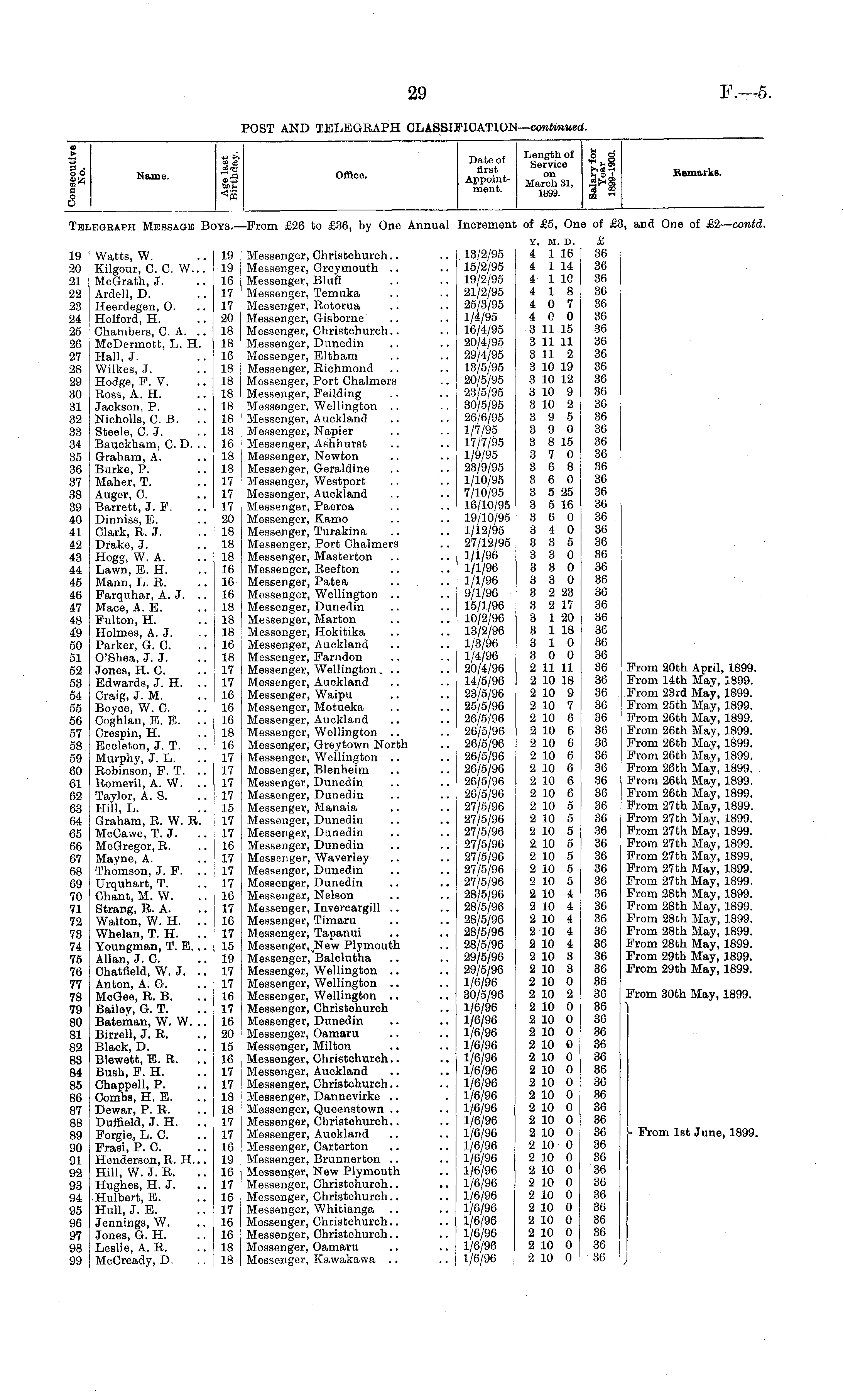 &_ Name. 4J >* Office. Date of first Appointment. Length of Service on March 31, 1899. Jt QJ I Bemarke. Te: LEGEAPH Message Bi )YS.--Prom £26 to £36, by One Annual Incremen of £5, On. of £: i, and One of £2— contd. 19 20 21 22 ■23 24 25 26 27 28 29 30 81 32 33 34 35 86 37 38 39 40 41 42 43 44 45 46 47 48 49 50 51 52 53 54 55 56 57 58 59 60 61 62 63 64 65 66 (57 68 69 70 71. 72 73 74 75 76 77 78 79 80 81 82 83 84 85 86 87 88 89 90 91 92 93 94 95 96 97 98 99 Watts, W. Kilgour, C. C. W... McGrath, J. Ardell, D. Heerdegen, O. Holford, H. Chambers, C. A. McDermott, L. H. Hall, J. Wilkes, J. Hodge, P. V. Ross, A. H. Jackson, P. Nicholls, C. B. .. Steele, C. J. Bauckham, CD... Graham, A. Burke, P. Maher, T. Auger, C. Barrett, J. P. Dinniss, E. Clark, R. J. Drake, J. Hogg, W. A. Lawn, B. H. Mann, L. R. Parquhar, A. J. Mace, A. E. Pulton, H. Holmes, A. J. Parker, G. C. O'Shea, J. J. Jones, H. C. Edwards, J. H. Craig, J. M. Boyce, W. C. Coghlan, E. E. Crespin, H. Eccleton, J. T. Murphy, J. L. Robinson, F. T. .. Romeril, A. W. Taylor, A. S. Hill, L. Graham, R. W. R. McCawe, T. J. McGregor, R. Mayne, A. Thomson, J. P. Urquhart, T. Chant, M. W. Strang, R. A. Walton, W. H. Whelan, T. H. Youngman, T. E. .. Allan, J. C. Chatfield, W. J. Anton, A. G. McGee, R. B. Bailey, G. T. Bateman, W. W. .. Birrell, J. R. Black, D. Blewett, E. R. .. Bush, P. H. Chappell, P. Combs, H. E. Dewar, P. R. Duffield, J. H. Porgie, L. C. Prasi, P. C. Henderson,R. H... Hill, W. J. R. Hughes, H. J. Hulbert, E. Hull, J. E. Jennings, W. Jones, G. H. Leslie, A. R. McCready, D. 19 19 16 17 17 20 18 18 16 18 18 18 18 18 18 16 18 18 17 17 17 20 18 18 18 16 16 16 18 18 18 16 18 17 17 16 16 16 18 16 17 17 17 17 15 17 17 16 17 17 17 16 17 16 17 15 19 17 17 16 17 16 20 15 16 17 17 18 18 17 17 16 19 16 17 16 17 16 16 18 18 Messenger, Christchureh.. Messenger, Greymouth Messenger, Bluff Messenger, Temuka Messenger, Rotorua Messenger, Gisborne Messenger, Ghristchurch Messenger, Dunedin Messenger, Eltham Messenger, Richmond Messenger, Port Chalmers Messenger, Feilding Messenger, Wellington .. Messenger, Auckland Messenger, Napier Messenger, Ashhurst Messenger, Newton Messenger, Geraldine Messenger, Westport Messenger, Auckland Messenger, Paeroa Messenger, Kamo Messenger, Turakina Messenger, Port Chalmers Messenger, Masterton Messenger, Reefton Messenger, Patea Messenger, Wellington Messenger, Dunedin Messenger, Marton Messenger, Hokitika Messenger, Auckland Messenger, Farndon Messenger, Wellington... Messenger, Auckland Messenger, Waipu Messenger, Motueka Messenger, Auckland Messenger, Wellington .. Messenger, Greytown North Messenger, Wellington Messenger, Blenheim Messenger, Dunedin Messenger, Dunedin Messenger, Manaia Messenger, Dunedin Messenger, Dunedin Messenger, Dunedin Messenger, Waverley Messenger, Dunedin Messenger, Dunedin Messenger, Nelson Messenger, Invercargill Messenger, Timaru Messenger, Tapanui Messenger,,New Plymouth Messenger, Balclutha Messenger, Wellington Messenger, Wellington Messenger, Wellington Messenger, Christchureh Messenger, Dunedin Messenger, Oamaru Messenger, Milton Messenger, Christchureh.. Messenger, Auckland Messenger, Christchureh.. Messenger, Dannevirke .. Messenger, Queenstown Messenger, Christchureh.. Messenger, Auckland Messenger, Oarterton Messenger, Brunnerton Messenger, New Plymouth Messenger, Christchureh.. Messenger, Christchureh Messenger, Whitianga Messenger, Christchureh.. Messenger, Christchureh.. Messenger, Oamaru Messenger, Kawakawa .. 13/2/95 1 15/2/95 19/2/95 21/2/95 25/3/95 1/4/95 16/4/95 20/4/95 29/4/95 13/5/95 20/5/95 23/5/95 30/5/95 26/6/95 1/7/95 17/7/95 1/9/95 23/9/95 1/10/95 7/10/95 16/10/95 19/10/95 1/12/95 27/12/95 1/1/96 1/1/96 1/1/96 9/1/96 15/1/96 10/2/96 13/2/96 1/3/96 1/4/96 20/4/96 14/5/96 23/5/96 25/5/96 26/5/96 26/5/96 26/5/96 26/5/96 26/5/96 26/5/96 26/5/96 27/5/96 27/5/96 27/5/96 27/5/96 27/5/96 27/5/96 27/5/96 28/5/96 28/5/96 28/5/96 28/5/96 28/5/96 29/5/96 29/5/96 1/6/96 30/5/96 1/6/96 1/6/96 1/6/96 1/6/96 1/6/96 1/6/96 1/6/96 1/6/96 1/6/96 1/6/96 1/6/96 1/6/96 1/6/96 1/6/96 1/6/96 1/6/96 1/6/96 1/6/96 1/6/96 1/6/96 1/6/96 Y. M. D. 4 1 16 4 1 14 4 1 10 4 18 4 0 7 4 0 0 3 11 15 3 11 11 3 11 2 3 10 19 3 10 12 3 10 9 3 10 2 3 9 5 3 9 0 3 8 15 3 7 0 3 6 8 3 6 0 3 5 25 3 5 16 3 6 0 3 4 0 3 3 5 3 3 0 3 3 0 3 3 0 3 2 23 3 2 17 3 1 20 3 1 18 3 10 3 0 0 2 11 11 2 10 18 2 10 9 2 10 7 2 10 6 2 10 6 2 10 6 2 10 6 2 10 6 2 10 6 2 10 6 2 10 5 2 10 5 2 10 5 2 10 5 2 10 5 2 10 5 2 10 5 2 10 4 2 10 4 2 10 4 2 10 4 2 10 i 2 10 3 2 10 3 2 10 0 2 10 2 2 10 0 2 10 0 2 10 0 2 10 0 2 10 0 2 10 0 2 10 0 2 10 0 2 10 0 2 10 0 2 10 0 2 10 0 2 10 0 2 10 0 2 10 0 2 10 0 2 10 0 2 10 0 2 10 0 2 10 0 2 10 0 £ 36 36 36 36 36 36 36 36 36 36 36 36 36 36 36 36 36 36 36 36 36 36 36 36 36 36 36 36 36 36 36 36 36 36 36 36 36 36 36 36 36 36 36 36 36 36 36 36 36 36 36 36 36 36 36 36 36 36 36 36 36 36 36 36 36 36 36 36 36 36 36 36 36 36 36 36 36 36 36 36 36 Prom 20th April, 1899. Prom 14th May, 1899. Prom 23rd May, 1899. Prom 25th May, 1899. Prom 26th May, 1899. Prom 26th May, 1899. Prom 26th May, 1899. Prom 26th May, 1899. Prom 26th May, 1899. Prom 26th May, 1899. From 26th May, 1899. Prom 27th May, 1899. Prom 27th May, 1899. Prom 27th May, 1899. Prom 27th May, 1899. Prom 27th May, 1899. Prom 27th May, 1899. Prom 27th May, 1899. From 28th May, 1899. From 28th May, 1899. From 28th May, 1899. Prom 28th May, 1899. From 28th May, 1899. Prom 29th May, 1899. Prom 29th May, 1899. From 30th May, 1899. 1 j- Prom 1st June, 1899.