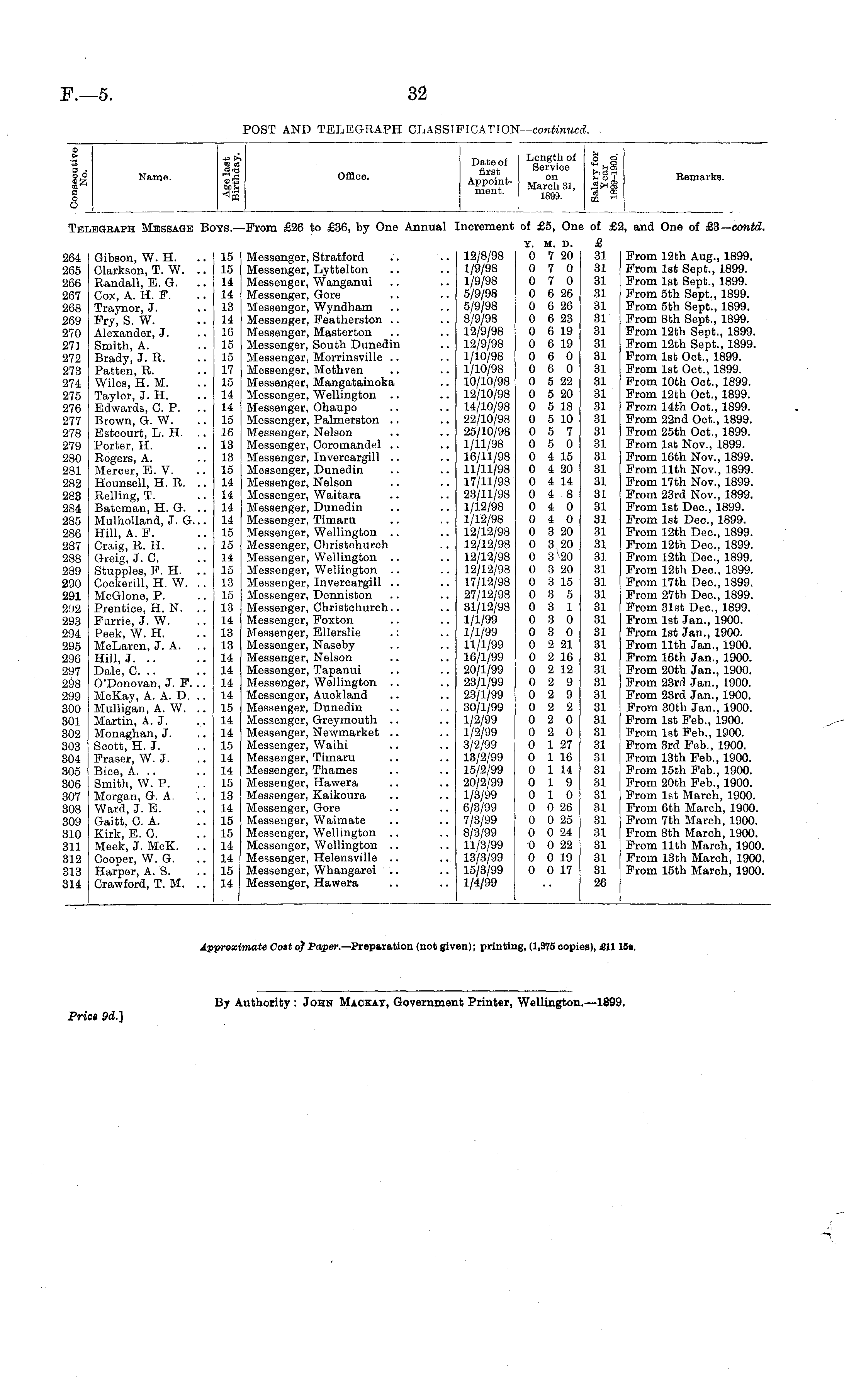% go § 8 Name. +3 >. MS* Office. Da to of Length of first Service ment. lm 32 rt Bemarks. Te: .egraph Message Bi )YS.•Prom £26 to £36, by One Annual increment of £5, Oni of £! !, and One of £3— contd. 264 265 266 267 268 269 270 271 272 273 274 275 276 277 278 279 280 281 282 283 284 285 286 287 288 289 290 291 292 293 294 295 296 297 298 299 300 301 302 303 304 305 306 307 308 309 310 311 312 313 314 Gibson, W. H. Glarkson, T. W. Randall, E.G. Cox, A. H. P. Traynor, J. Pry, S. W. Alexander, J. Smith, A. Brady, J. R. Patten, R. Wiles, H. M. Taylor, J. H. Edwards, C. P. Brown, G. W. Estcourt, L. H. Porter, H. Rogers, A. Mercer, E. V. Hounsell, H. R. Railing, T. Bateman, H. G. Mulholland, J. G... Hill, A. F. Craig, R. H. Greig, J. C. Stupples, F. H. Coekerill, H. W. McGlone, P. Prentice, H. N. Furrie, J. W. Peek, W. H. McLaren, J. A. Hill, J. .. Dale, C. .. O'Donovan, J. P. .. McKay, A. A. D. .. Mulligan, A. W. Martin, A. J. Monaghan, J. Scott, H. J. Praser, W. J. Bice, A. .. Smith, W. P. Morgan, G. A. Ward, J. E. Gaitt, C. A. Kirk, E. G. Meek, J. McK. .. Cooper, W. G. Harper, A. S. Crawford, T. M. .. 15 15 14 14 13 14 16 15 15 17 15 14 14 15 16 13 13 15 14 14 14 14 15 15 14 15 13 15 13 14 13 13 14 14 14 14 15 14 14 15 14 14 15 13 14 15 15 14 14 15 14 Messenger, Stratford Messenger, Lyttelton Messenger, Wanganui Messenger, Gore Messenger, Wyndham Messenger, Featherston Messenger, Masterton Messenger, South Dunedin Messenger, Morrinsville Messenger, Methven Messenger, Mangatainoka Messenger, Wellington Messenger, Ohaupo Messenger, Palmerston Messenger, Nelson Messenger, Coromandel Messenger, Inveroargill Messenger, Dunedin Messenger, Nelson Messenger, Waitara Messenger, Dunedin Messenger, Timaru Messenger, Wellington Messenger, Christchureh Messenger, Wellington Messenger, Wellington Messenger, Invercargill Messenger, Denniston Messenger, Christchurch Messenger, Poxton Messenger, BUerslie .: Messenger, Naseby Messenger, Nelson Messenger, Tapanui Messenger, Wellington Messenger, Auckland Messenger, Dunedin Messenger, Greymouth Messenger, Newmarket Messenger, Waihi Messenger, Timaru Messenger, Thames Messenger, Hawera Messenger, Kaikoura Messenger, Gore Messenger, Waimate Messenger, Wellington Messenger, Wellington Messenger, Helensville Messenger, Whangarei Messenger, Hawera 12/8/98 1/9/98 1/9/98 5/9/98 5/9/98 8/9/98 12/9/98 12/9/98 1/10/98 1/10/98 10/10/98 12/10/98 14/10/98 22/10/98 25/10/98 1/11/98 16/11/98 11/11/98 17/11/98 23/11/98 1/12/98 1/12/98 12/12/98 12/12/98 12/12/98 12/12/98 17/12/98 27/12/98 31/12/98 1/1/99 1/1/99 11/1/99 16/1/99 20/1/99 23/1/99 23/1/99 30/1/99 1/2/99 1/2/99 3/2/99 13/2/99 15/2/99 20/2/99 1/3/99 6/3/99 7/3/99 8/3/99 11/3/99 13/3/99 15/3/99 1/4/99 Y. M. D. 0 7 20 0 7 0 0 7 0 0 6 26 0 6 26 0 6 23 0 6 19 0 6 19 0 6 0 0 6 0 0 5 22 0 5 20 0 5 18 0 5 10 0 5 7 0 5 0 0 4 15 0 4 20 0 4 14 0 4 8 0 4 0 0 4 0 0 3 20 0 3 20 0 3 v 20 0 3 20 0 3 15 0 3 5 0 3 1 0 3 0 0 3 0 0 2 21 0 2 16 0 2 12 0 2 9 0 2 9 0 2 2 0 2 0 0 2 0 0 1 27 0 1 16 0 1 14 0 19 0 10 0 0 26 0 0 25 0 0 24 0 0 22 0 0 19 0 0 17 £ 31 31 31 31 31 31 31 31 31 31 31 31 31 31 31 31 31 31 31 31 31 31 31 31 81 31 31 31 31 31 31 31 31 31 31 31 31 31 31 31 31 31 31 31 31 31 31 31 31 31 26 Prom 12th Aug., 1899. Prom 1st Sept., 1899. From 1st Sept., 1899. Prom 5th Sept., 1899. From 5th Sept., 1899. Prom 8th Sept., 1899. From 12th Sept., 1899. Prom 12th Sept., 1899. From 1st Oct., 1899. Prom 1st Oct., 1899. From 10th Oct., 1899. From 12th Oct., 1899. From 14th Oct., 1899. Prom 22nd Oct., 1899. Prom 25th Oct., 1899. From 1st Nov., 1899. From 16th Nov., 1899. From 11th Nov., 1899. From 17th Nov., 1899. From 23rd Nov., 1899. From 1st Dec, 1899. From 1st Dec, 1899. From 12th Dec, 1899. From 12th Dec, 1899. From 12th Dec, 1899. Prom 12th Dec, 1899. From 17th Dec, 1899. From 27th Dec, 1899. From 31st Dec, 1899. From 1st Jan., 1900. Prom 1st Jan., 1900. From 11th Jan., 1900. Prom 16th Jan., 1900. Prom 20th Jan., 1900. Prom 23rd Jan., 1900. From 23rd Jan., 1900. From 30th Jan., 1900. From 1st Feb., 1900. Prom 1st Feb., 1900. From 3rd Feb., 1900. From 13th Feb., 1900. From 15th Feb., 1900. Prom 20th Feb., 1900. From 1st March, 1900. Prom 6th March, 1900. Prom 7th March, 1900. From 8th March, 1900. From 11th March, 1900. Prom 13th March, 1900. From 15th March, 1900.