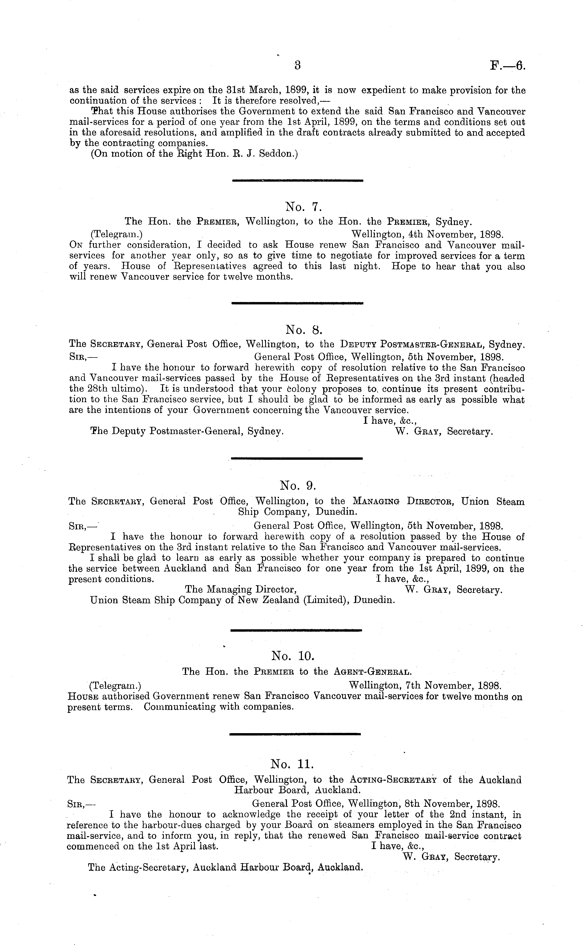 No. 7. The Hon. the Peemieb, Wellington, to the Hon. the Peemiee, Sydney. (Telegram.) Wellington, 4th November, 1898. On further consideration, I decided to ask House renew San Francisco and Vancouver mailservices for another year only, so as to give time to negotiate for improved services for a term of years. House of Eepresentatives agreed to this last night. Hope to hear that you also will renew Vancouver service for twelve months.