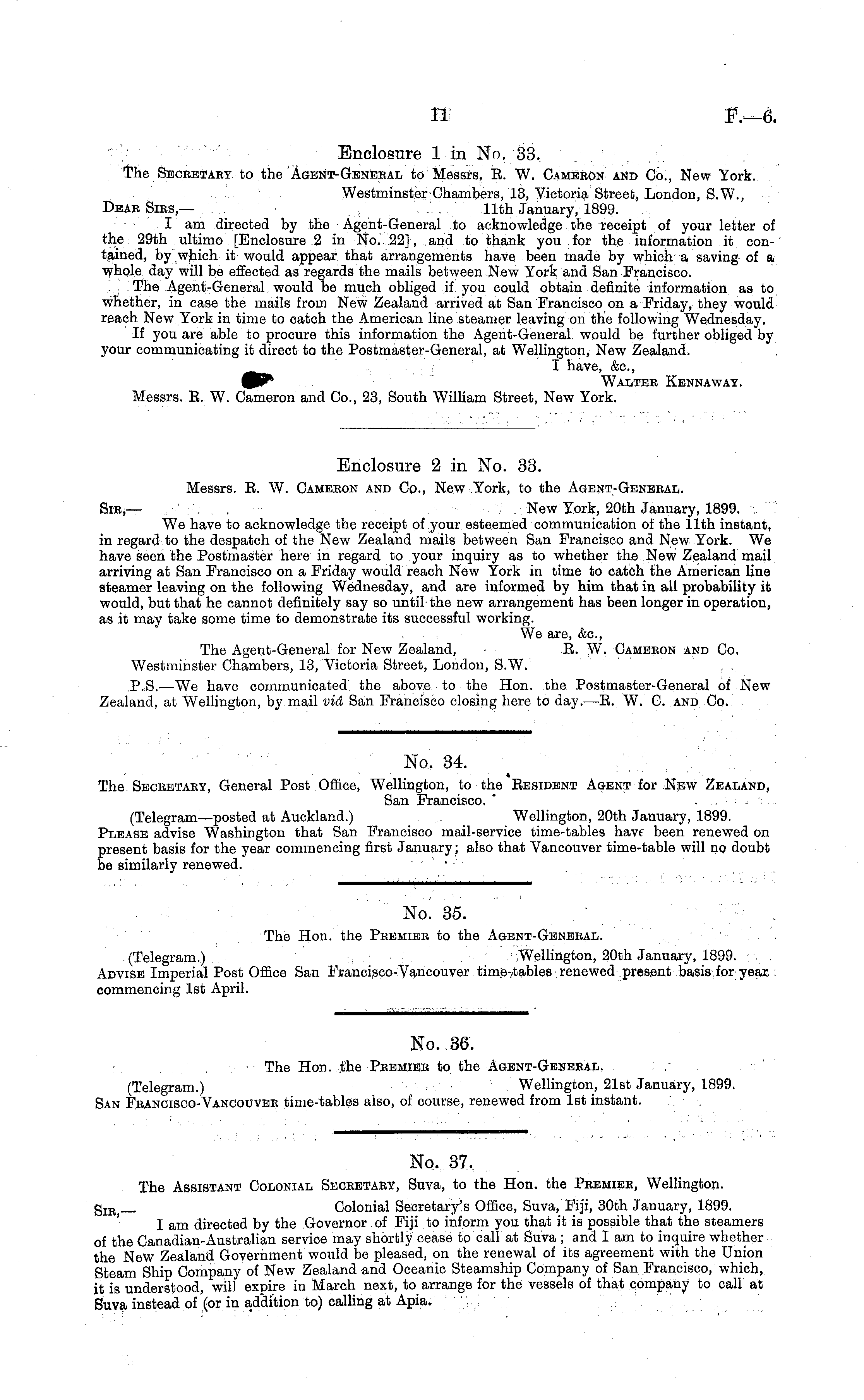 Enclosure 1 in No. 33. The Seceetaey to the Agent-GenEbal to Messrs. B. W. Came Eon and Co., New York. Westminster Chambers, 13, Victoria Street, London, S.W., Deab Sies,— 11th January, 1899. I am directed by the Agent-General to acknowledge the receipt of your letter of the 29th ultimo [Enclosure 2 in No. 22], and to thank you for the information it contained, by which it would appear that arrangements have been made by which a saving of a whole day will be effected as regards the mails between New York and San Francisco. The Agent-General would be much obliged if you could obtain definite information as to whether, in case the mails from New Zealand arrived at San Francisco on a Friday, they would reach New York in time to catch the American line steamer leaving on the following Wednesday. If you are able to procure this information the Agent-General would be further obliged by your communicating it direct to the Postmaster-General, at Wellington, New Zealand. I have, &c, 0/fr Waltee Kennaway. Messrs. B. W. Cameron and Co., 23, South William Street, New York.