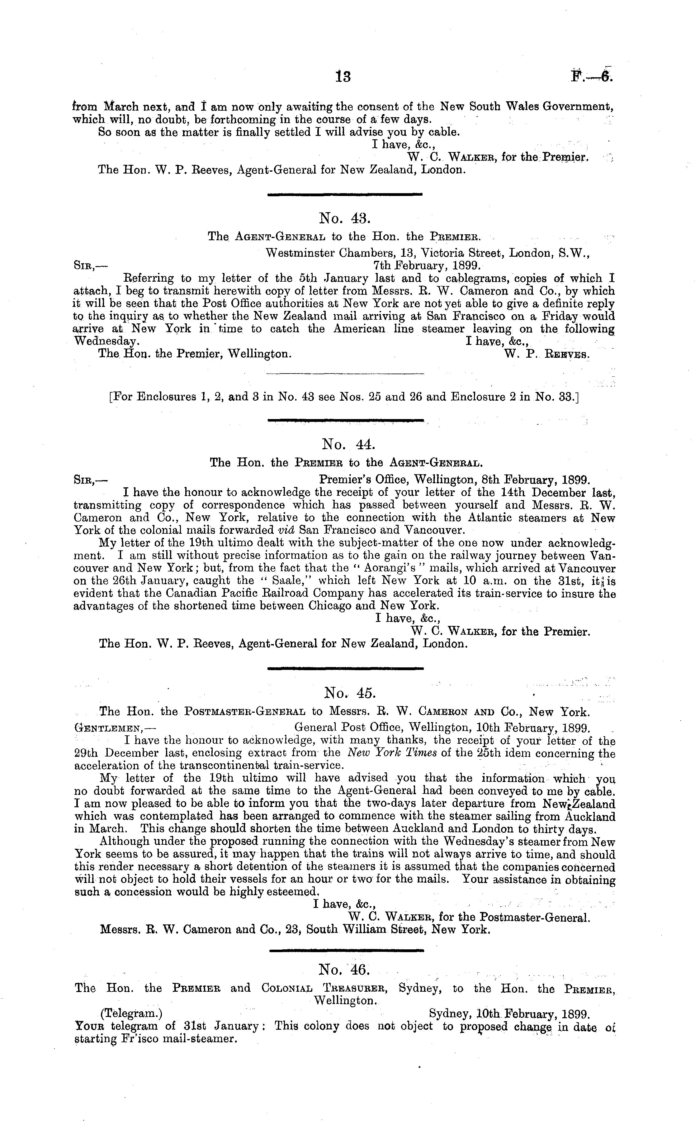 No. 44. The Hon. the Peemiee to the Agent-Genebal. Sib,— Premier's Office, Wellington, Bth February, 1899. I have the honour to acknowledge the receipt of your letter of the 14th December last, transmitting copy of correspondence which has passed between yourself and Messrs. B. W. Cameron and Co., New York, relative to the connection with the Atlantic steamers at New York of the colonial mails forwarded via San Francisco and Vancouver. My letter of the 19th ultimo dealt with the subject-matter of the one now under acknowledgment. I am still without precise information as to the gain on the railway journey between Vancouver and New York; but, from the fact that the " Aorangi's " mails, which arrived at Vancouver on the 26th January, caught the " Saale," which left New York at 10 a.m. on the 31st, itj'i'g evident that the Canadian Pacific Bailroad Company has accelerated its train-service to insure the advantages of the shortened time between Chicago and New York. I have, &c, W. C. Walkee, for the Premier. The Hon. W. P. Beeves, Agent-General for New Zealand, London.