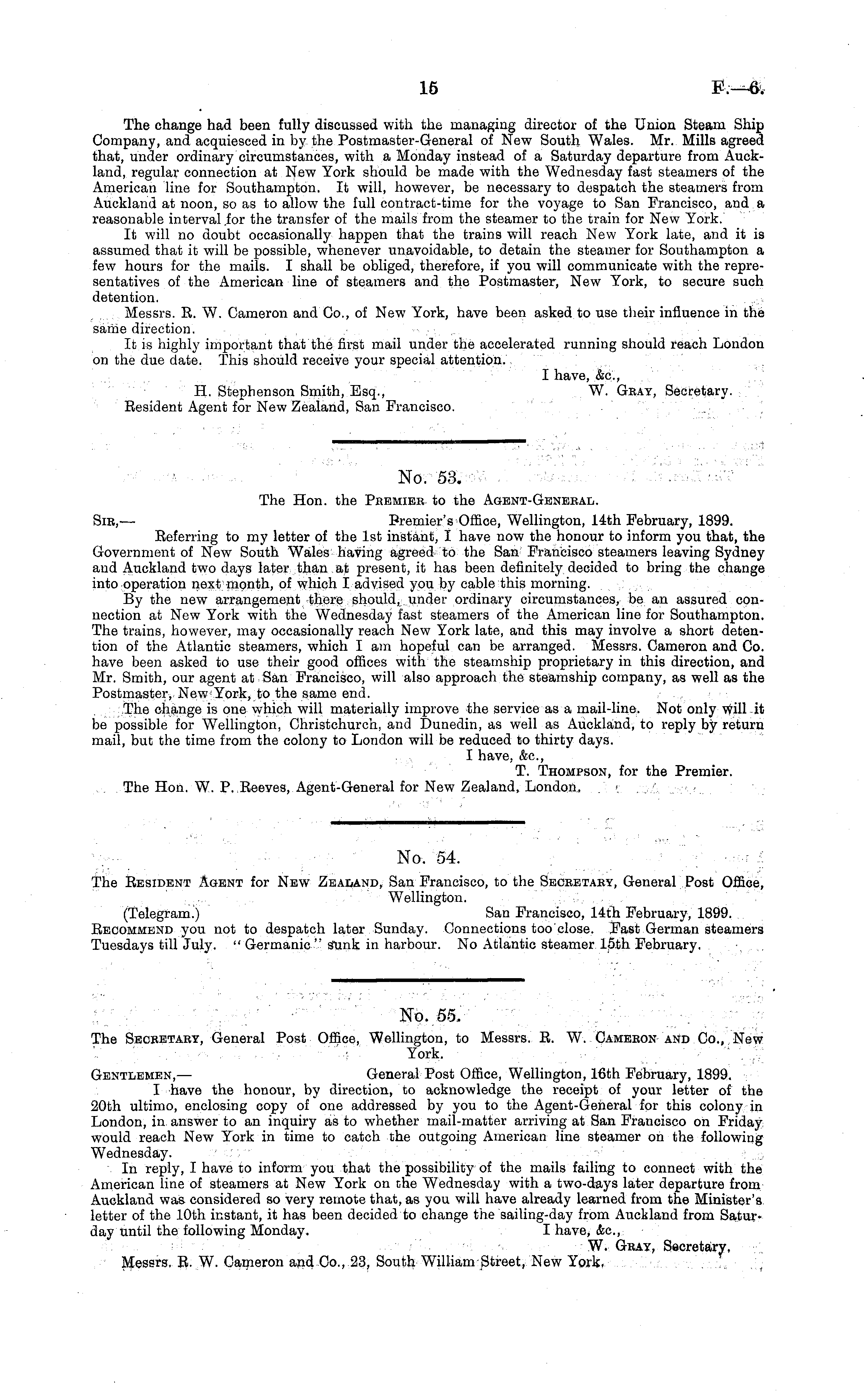 N0.'53. ■ ■ '. ■■ The Hon. the Peemiee to the Agent-Geneeal. Sib, — Premier's Office, Wellington, 14th February, 1899. Referring to my letter of the Ist instant, I have now the honour to inform you that, the Government of New South Wales having agreed to the San Francisco steamers leaving Sydney and Auckland two days later than at present, it has been definitely decided to bring the change into operation next month, of which I advised you by cable this morning. By the new arrangement there should,.under ordinary circumstances, be an assured connection at New York with the Wednesday fast steamers of the American line for Southampton. The trains, however, may occasionally reach New York late, and this may involve a short detention of the Atlantic steamers, which I am hopeful can be arranged. Messrs. Cameron and Co. have been asked to use their good offices with the steamship proprietary in this direction, and Mr. Smith, our agent at San Francisco, will also approach the steamship company, as well as the Postmaster, New York, to the same end. The change is one which will materially improve the service as a mail-line. Not only it be possible for Wellington, Christchurch, and Dunedin, as well as Auckland, to reply by return mail, but the time from the colony to London will be reduced to thirty days. I have, &c, T. Thompson, for the Premier. . The Hon. W. P. Beeves, Agent-General for New Zealand, London, >.