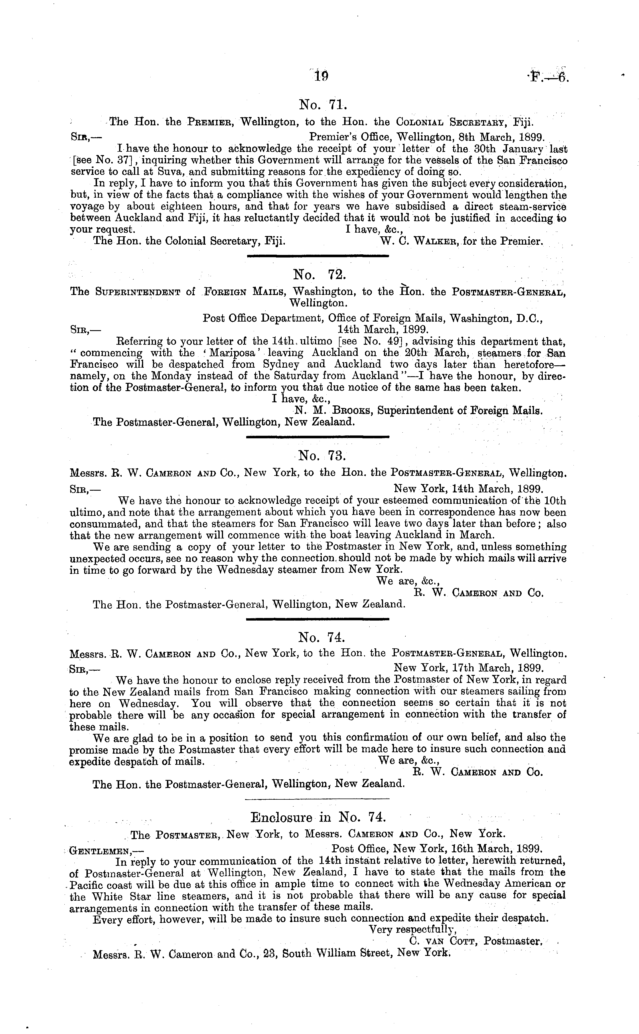 Enclosure in No. 74. The Postmasteb, New York, to Messrs. Cameeon and Co., New York. Gentlemen, Post Office, New York, 16th March, 1899. In reply to your communication of the 14th instant relative to letter, herewith returned, of Postmaster-General at Wellington, New Zealand, I have to state that the mails from the Pacific coast will be due at this office in ample time to connect with the Wednesday American or the White Star line steamers, and it is not probable that there will be any cause for special arrangements in connection with the transfer of these mails. Every effort, however, will be made to insure such connection and expedite their despatch. Very respectfully, C. van Cott, Postmaster. . Messrs. B. W. Cameron and Co., 23, South William Street, New York.