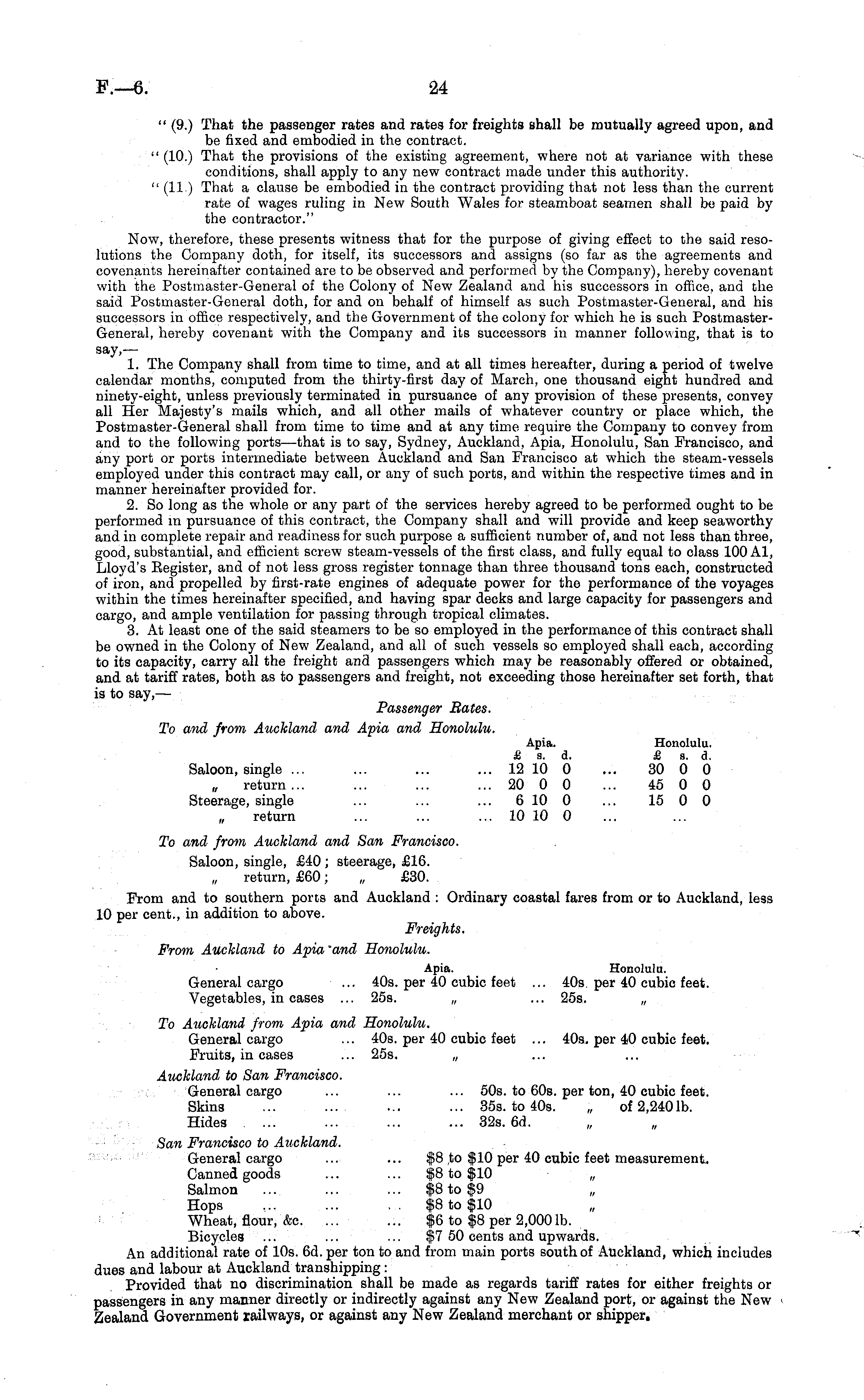 " (9.) That the passenger rates and rates for freights shall be mutually agreed upon, and be fixed and embodied in the contract. " (10.) That the provisions of the existing agreement, where not at variance with these conditions, shall apply to any new contract made under this authority. " (11.) That a clause be embodied in the contract providing that not less than the current rate of wages ruling in New South Wales for steamboat seamen shall be paid by the contractor." Now, therefore, these presents witness that for the purpose of giving effect to the said resolutions the Company doth, for itself, its successors and assigns (so far as the agreements and covenants hereinafter contained are to be observed and performed by the Company), hereby covenant with the Postmaster-General of the Colony of New Zealand and his successors in office, and the said Postmaster-General doth, for and on behalf of himself as such Postmaster-General, and his successors in office respectively, and the Government of the colony for which he is such PostmasterGeneral, hereby covenant with the Company and its successors in manner following, that is to say,— 1. The Company shall from time to time, and at all times hereafter, during a period of twelve calendar months, computed from the thirty-first day of March, one thousand eight hundred and ninety-eight, unless previously terminated in pursuance of any provision of these presents, convey all Her Majesty's mails which, and all other mails of whatever country or place which, the Postmaster-General shall from time to time and at any time require the Company to convey from and to the following ports—that is to say, Sydney, Auckland, Apia, Honolulu, San Francisco, and any port or ports intermediate between Auckland and San Francisco at which the steam-vessels employed under this contract may call, or any of such ports, and within the respective times and in manner hereinafter provided for. 2. So long as the whole or any part of the services hereby agreed to be performed ought to be performed m pursuance of this contract, the Company shall and will provide and keep seaworthy and in complete repair and readiness for such purpose a sufficient number of, and not less than three, good, substantial, and efficient screw steam-vessels of the first class, and fuily equal to class 100 Al, Lloyd's Register, and of not less gross register tonnage than three thousand tons each, constructed of iron, and propelled by first-rate engines of adequate power for the performance of the voyages within the times hereinafter specified, and having spar decks and large capacity for passengers and cargo, and ample ventilation for passing through tropical climates. 3. At least one of the said steamers to be so employed in the performance of this contract shall be owned in the Colony of New Zealand, and all of such vessels so employed shall each, according to its capacity, carry all the freight and passengers which may be reasonably offered or obtained, and at tariff rates, both as to passengers and freight, not exceeding those hereinafter set forth, that is to say,— Passenger Rates. To and from Auckland and Apia and Honolulu. Apia. Honolulu. £ s. d. £ a. d. Saloon, single ... ... ... ... 12 10 0 ... 30 0 0 return... ... ... ... 20 0 0 ... 45 0 0 Steerage, single ... ... ... 610 0 ... 15 0 0 return ... ... ... 10 10 0 To and from Auckland and San Francisco. Saloon, single, £40 ; steerage, £16. return, £60; „ £30. From and to southern ports and Auckland : Ordinary coastal fares from or to Auckland, less 10 per cent., in addition to above. Freights. From Auckland to Apia'and Honolulu. Apia. Honolulu. General cargo ... 40s. per 40 cubic feet ... 40s per 40 cubic feet. Vegetables, in cases ... 255. „ ... 255. „ To Auckland, from Apia and Honolulu. General cargo ... 40s. per 40 cubic feet ... 40s. per 40 cubic feet. Fruits, in cases ... 255. „ Auckland to San Francisco. General cargo ... ... ... 50s. to 60s. per ton, 40 cubic feet. Skins ... 355. to 40s. „ of 2,2401b. Hides ... ... ... 325. 6d. : San Francisco to Auckland. General cargo ... ... $8 to $10 per 40 cubic feet measurement. Canned goods ... ... $8 to $10 Salmon ... ... ... $8 to $9 Hops ... ... ... $8 to $10 Wheat, flour, &c. ... ... $6 to $8 per 2,0001b. Bicycles ... ... ... $7 50 cents and upwards. An additional rate of 10s. 6d. per ton to and from main ports south of Auckland, which includes dues and labour at Auckland transhipping: Provided that no discrimination shall be made as regards tariff rates for either freights or passengers in any manner directly or indirectly against any New Zealand port, or against the New > Zealand Government railways, or against any New Zealand merchant or shipper.
