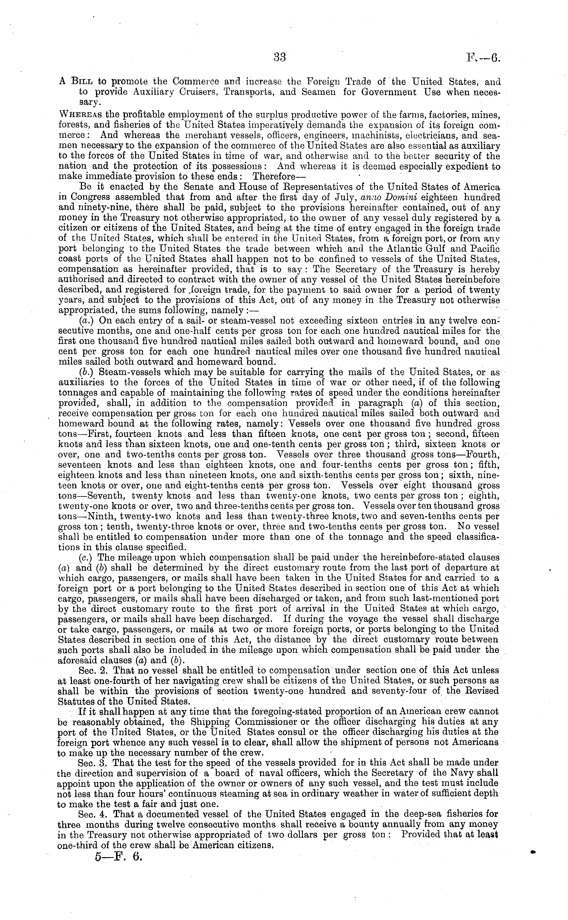 A Bill to promote the Commerce and increase the Foreign Trade of the United States, and to provide Auxiliary Cruisers, Transports, and Seamen for Government Use when necessary. Wheeeas the profitable employment of the surplus productive power of the farms, factories, mines, forests, and fisheries of the United States imperatively demands the expansion of its foreign commerce : And whereas the merchant vessels, officers, engineers, machinists, electricians, and seamen necessary to the expansion of the commerce of the United States are also essential as auxiliary to the forces of the United States in time of war, and otherwise and to the better security of the nation and the protection of its possessions: And whereas it is deemed especially expedient to make immediate provision to these ends: Therefore— Be it enacted by the Senate and House of Eepresentatives of the United States of America in Congress assembled that from and after the first day of July, anno Domini eighteen hundred and ninety-nine, there shall be paid, subject to the provisions hereinafter contained, out of any money in the Treasury not otherwise appropriated, to the owner of any vessel duly registered by a citizen or citizens of the United States, and being at the time of entry engaged in the foreign trade of the United States, which shall be entered in the United States, from a foreign port, or from any port belonging to the United States the trade between which and the Atlantic Gulf and Pacific coast ports of the United States shall happen not to be confined to vessels of the United States, compensation as hereinafter provided, that is to say : The Secretary of the Treasury is hereby authorised and directed to contract with the owner of any vessel of the United States hereinbefore described, and registered for .foreign trade, for the payment to said owner for a period of twenty years, and subject to the provisions of this Act, out of any money in the Treasury not otherwise appropriated, the sums following, namely : — (a.) On each entry of a sail- or steam-vessel not exceeding sixteen entries in any twelve consecutive months, one and one-half cents per gross ton for each one hundred nautical miles for the first one thousand five hundred nautical miles sailed both outward and homeward bound, and one cent per gross ton for each one hundred nautical miles over one thousand five hundred nautical miles sailed both outward and homeward bound. (b.) Steam-vessels which may be suitable for carrying the mails of the United States, or as auxiliaries to the forces of the United States in time of war or other need, if of the following tonnages and capable of maintaining the following rates of speed under the conditions hereinafter provided, shall, in addition to the compensation provided in paragraph (a) of this section, receive compensation per gross ton for each one hundred nautical miles sailed both outward and homeward bound at the following rates, namely: Vessels over one thousand five hundred gross tons—First, fourteen knots and less than fifteen knots, one cent per gross ton; second, fifteen knots and less than sixteen knots, one and one-tenth cents per gross ton ; third, sixteen knots or over, one and two-tenths cents per gross ton. Vessels over three thousand gross tons —Fourth, seventeen knots and less than eighteen knots, one and four-tenths cents per gross ton; fifth, eighteen knots and less than nineteen knots, one and sixth-tenths cents per gross ton; sixth, nineteen knots or over, one and eight-tenths cents per gross ton. Vessels over eight thousand gross tons —Seventh, twenty knots and less than twenty-one knots, two cents per gross ton ; eighth, twenty-one knots or over, two and three-tenths cents per gross ton. Vessels over ten thousand gross tons —Ninth, twenty-two knots and less than twenty-three knots, two and seven-tenths cents per gross ton; tenth, twenty-three knots or over, three and two-tenths cents per gross ton. No vessel shall be entitled to compensation under more than one of the tonnage and the speed classifications in this clause specified. (c.) The mileage upon which compensation shall be paid under the hereinbefore-stated clauses (a) and (b) shall be determined by the direct customary route from the last port of departure at which cargo, passengers, or mails shall have been taken in the United States for and carried to a foreign port or a port belonging to the United States described in section one of this Act at which cargo, passengers, or mails shall have been discharged or taken, and from such last-mentioned port by the direct customary route to the first port of arrival in the United States at which cargo, passengers, or mails shall have been discharged. If during the voyage the vessel shall discharge or take cargo, passengers, or mails at two or more foreign ports, or ports belonging to the United States described in section one of this Act, the distance by the direct customary route between such ports shall also be included in the mileage upon which compensation shall be paid under the aforesaid clauses (a) and (b). Sec. 2. That no vessel shall be entitled to compensation under section one of this Act unless at least one-fourth of her navigating crew shall be citizens of the United States, or such persons as shall be within the provisions of section twenty-one hundred and seventy-four of the Bevised Statutes of the United States. If it shall happen at any time that the foregoing-stated proportion of an American crew cannot be reasonably obtained, the Shipping Commissioner or the officer discharging his duties at any port of the United States, or the United States consul or the officer discharging his duties at the foreign port whence any such vessel is to clear, shall allow the shipment of persons not Americans to make up the necessary number of the crew. See. 3. That the test for the speed of the vessels provided for in this Act shall be made under the direction and supervision of