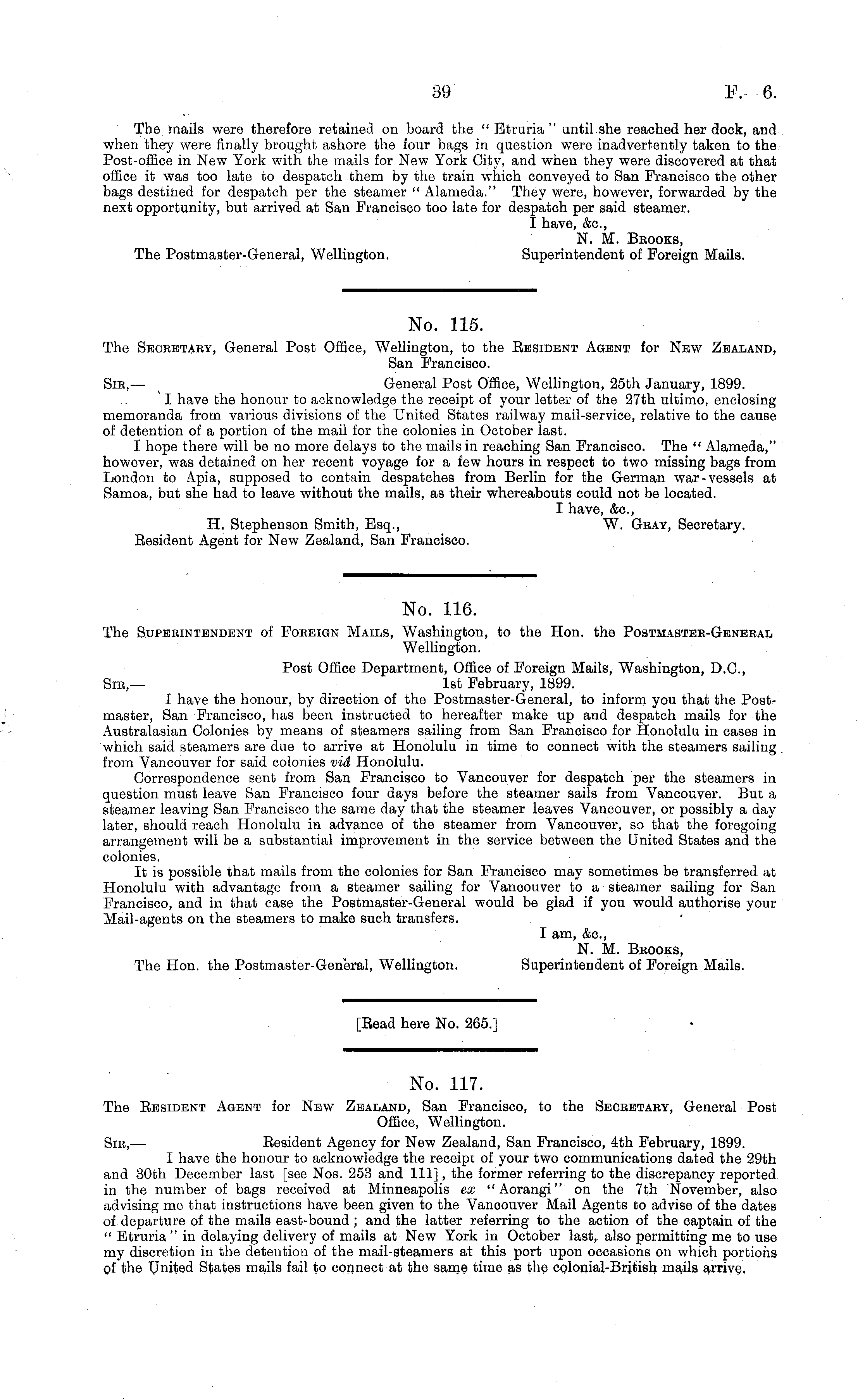 No. 115. The Seceetaey, General Post Office, Wellington, to the Besident Agent for New Zealand, San Francisco. Sic, — General Post Office, Wellington, 25th January, 1899. I have the honour to acknowledge the receipt of your letter of the 27th ultimo, enclosing memoranda from various divisions of the United States railway mail-service, relative to the cause of detention of a portion of the mail for the colonies in October last. I hope there will be no more delays to the mails in reaching San Francisco. The " Alameda," however, was detained on her recent voyage for a few hours in respect to two missing bags from London to Apia, supposed to contain despatches from Berlin for the German war-vessels at Samoa, but she had to leave without the mails, as their whereabouts could not be located. I have, &c, H. Stephenson Smith, Esq., W. Geay, Secretary. Besident Agent for New Zealand, San Francisco.