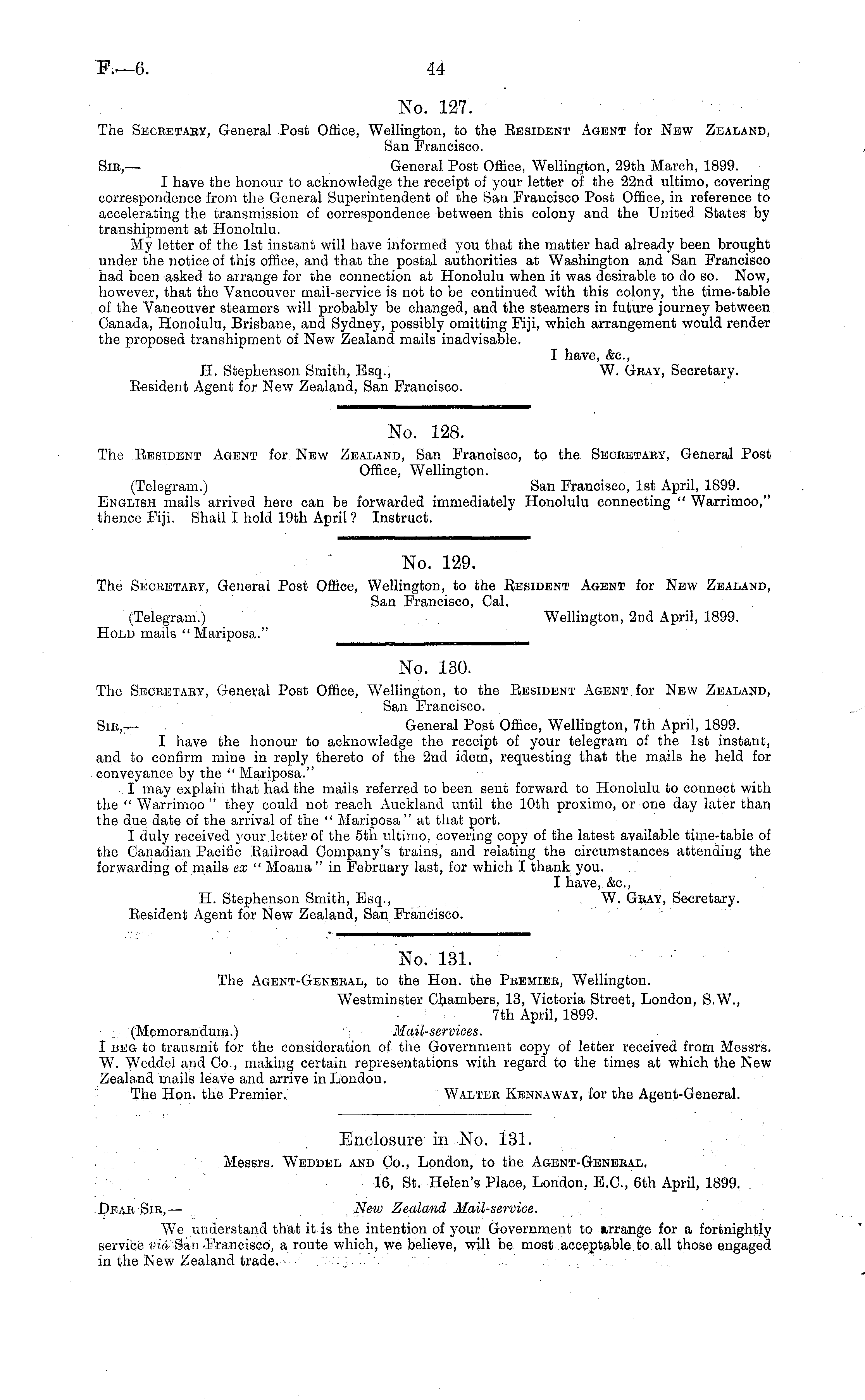 No. 130. The Seceetaey, General Post Office, Wellington, to the Besident Agent for New Zealand, San Francisco. Sic,— General Post Office, Wellington, 7th April, 1899. I have the honour to acknowledge the receipt of your telegram of the Ist instant, and to confirm mine in reply thereto of the 2nd idem, requesting that the mails he held for conveyance by the " Mariposa." I may explain that had the mails referred to been sent forward to Honolulu to connect with the " Warrimoo " they could not reach Auckland until the 10th proximo, or one day later than the due date of the arrival of the " Mariposa " at that port. I duly received your letter of the sth ultimo, covering copy of the latest available time-table of the Canadian Pacific Bailroad Company's trains, and relating the circumstances attending the forwarding of mails ex " Moana " in February last, for which I thank you. I have,. &c, H. Stephenson Smith, Esq., W. Geay, Secretary. Besident Agent for New Zealand, San Francisco.