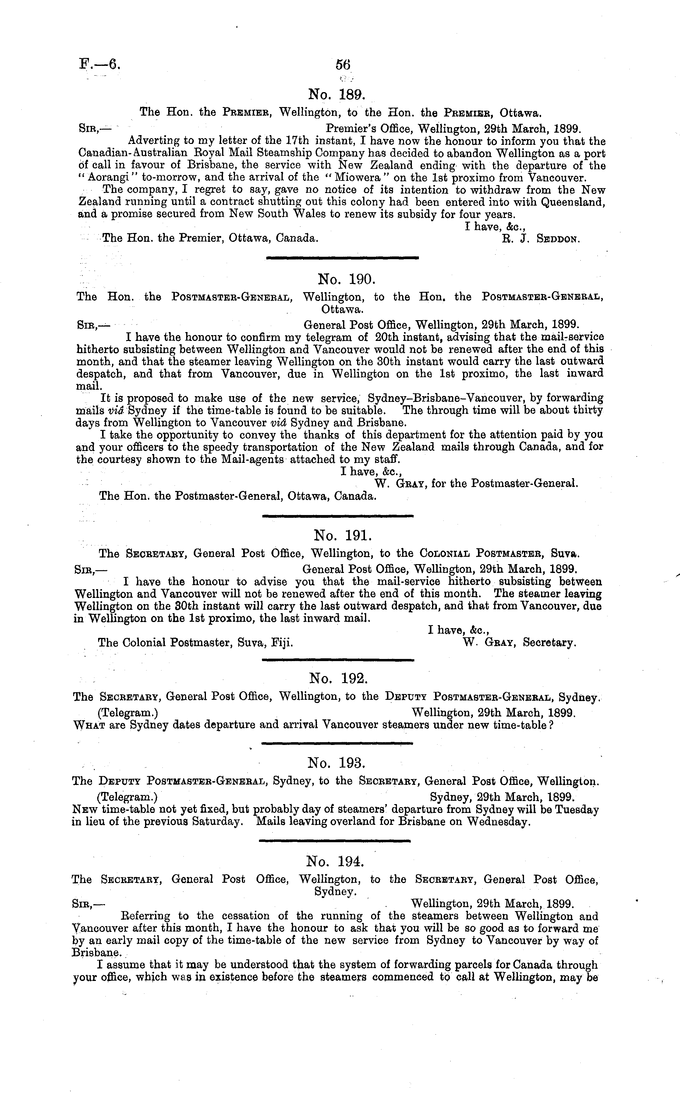 No. 190. The Hon. the Postmastee-Geneeal, Wellington, to the Hon. the Postmastee-Geneeal, Ottawa. Sic,— General Post Office, Wellington, 29th March, 1899. I have the honour to confirm my telegram of 20th instant, advising that the mailrservice hitherto subsisting between Wellington and Vancouver would not be renewed after the end of this month, and that the steamer leaving Wellington on the 30th instant would carry the last outward despatch, and that from Vancouver, due in Wellington on the Ist proximo, the last inward mail. It is proposed to make use of the new service, Sydney-Brisbane-Vancouver, by forwarding mails vid Sydney if the time-table is found to be suitable. The through time will be about thirty days from Wellington to Vancouver vid Sydney and Brisbane. I take the opportunity to convey the thanks of this department for the attention paid by you and your officers to the speedy transportation of the New Zealand mails through Canada, and for the courtesy shown to the Mail-agents attached to my staff. I have, &c, W. Geay, for the Postmaster-General. The Hon. the Postmaster-General, Ottawa, Canada.