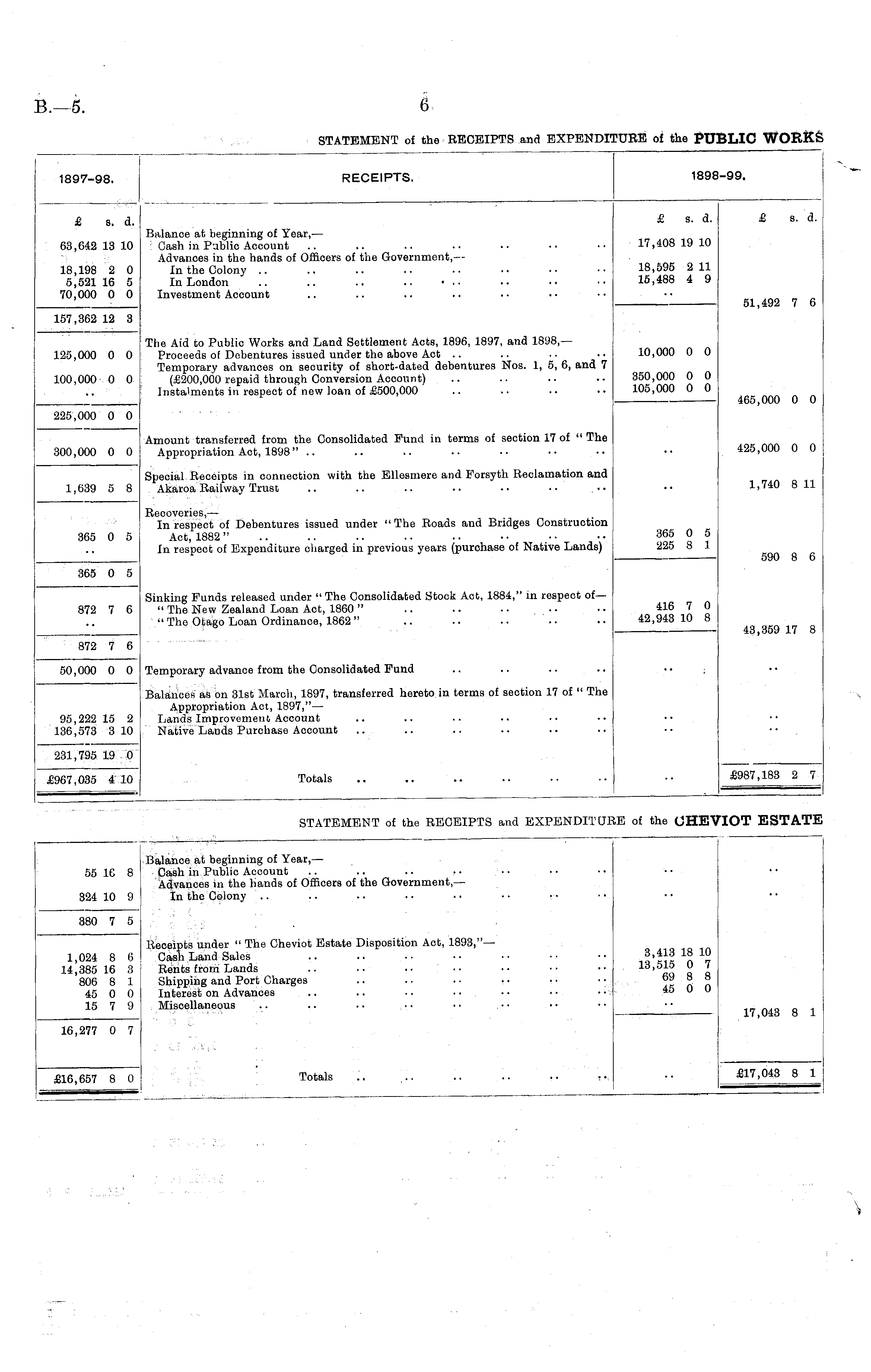 1897-98. RECEIPTS. 189 1-99. £ s. d. Balance at beginning of Year, — Cash in Public Account Advances in the hands of Oificers of the Government, — In the Colony In London .. .. .. .. ■ .■ Investment Account £ s. d. £ s. d. 63,642 13 10 17,408 19 10 18,198 2 0 5,521 16 5 70,000 0 0 18,595 2 11 15,488 4 9 51,492 7 6 157,362 12 3 125,000 0 0 The Aid to Public Works and Land Settlement Acts, 1896, 1897, and 1898,— Proceeds of Debentures issued under the above Act Temporary advances on security of short-dated debentures Nos. 1, 5, 6, and 7 (£200,000 repaid through Conversion Account) Instalments in respect of new loan of £500,000 10,000 0 0 465,000 0 0 100,000 0 0 350,000 0 0 105,000 0 0 225,000 0 0 Amount transferred from the Consolidated Fund in terms of section 17 of " The Appropriation Act, 1898" .. 425,000 0 0 300,000 0 0 Special Keceipts in connection with the Ellesmere and Forsyth Reclamation and Akaroa Railway Trust .. .. .. • • • • • • 1,740 8 11 1,639 5 8 365 0 5 Recoveries, — In respect of Debentures issued under " The Roads and Bridges Construction Act, 1882" In respect of Expenditure charged in previous years (purchase of Native Lands) 365 0 5 225 8 1 590 8 6 365 0 5 Sinking Funds released under "The Consolidated Stock Act, 1884," in respect of— " The New Zealand Loan Act, 1860 " " The Otago Loan Ordinance, 1862 " 872 7 6 416 7 0 42,943 10 8 43,359 17 8 872 7 6 50,000 0 0 Temporary advance from the Consolidated Fund 95,222 15 2 136,573 3 10 Balances as on 31st March, 1897, transferred hereto in terms of section 17 of " The Appropriation Act, 1897," — Lands Improvement Account Native Lands Purchase Account 231,795 19 0 Totals £967,035 4 10 £987,183 2 7 STATEMENT of the RECEIPTS and EXPENDITU: ,E of the CHE' tot estat: 55 16 8 Balance at beginning of Year, — Cash in Public Account Advances in the Hands of Officers of the Government, — In the Colony .. 324 10 9 380 7 5 1,024 8 6 14,385 16 3 806 8 1 45 0 0 15 7 9 Receipts under " The Cheviot Estate Disposition Act, 1893," — Cash Land Sales Rents from Lands Shipping and Port Charges Interest on Advances Miscellaneous 3,413 18 10 13,515 0 7 69 8 8 45 0 0 17,043 8 1 16,277 0 7 £16,657 8 0 Totals £17,043 8 1