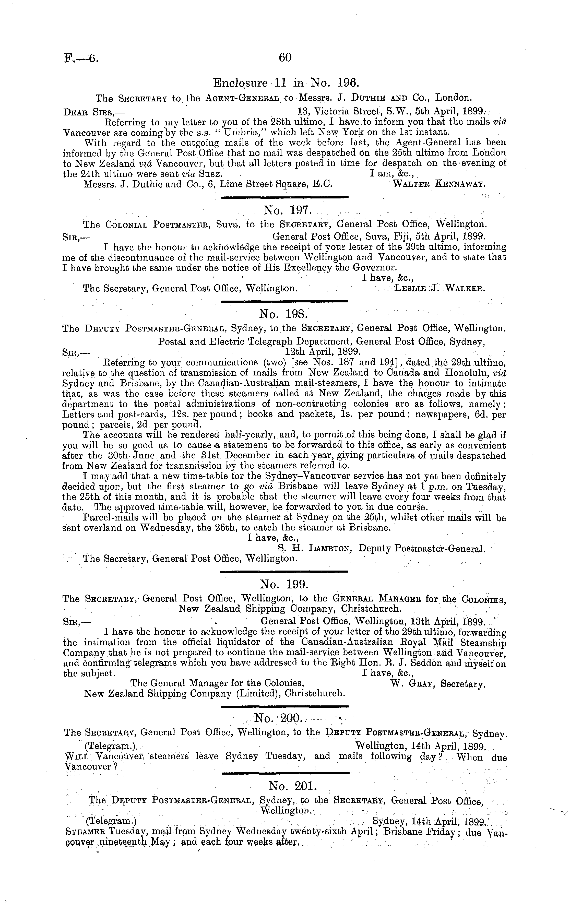 Enclosure 11 in No. 196. The Seceetaey to. the Agent-Geneeal to Messrs. J. Duthie and Co., London. Deae Sibs,— 13, Victoria Street, S.W., sth April, 1899. Beferring to my letter to you of the 28th ultimo, I have to inform you that the mails vid Vancouver are coming by the s.s. " Umbria," which left New York on the Ist instant. With regard to the outgoing mails of the week before last, the Agent-General has been informed by the General Post Office that no mail was despatched on the 25th ultimo from London to New Zealand vid Vancouver, but that all letters posted in time for despatch on the evening of the 24th ultimo were sent vid Suez. . I am, &c,, Messrs. J. Duthie and Co., 6, Lime Street Square, E.C. Waltee Kennaway.