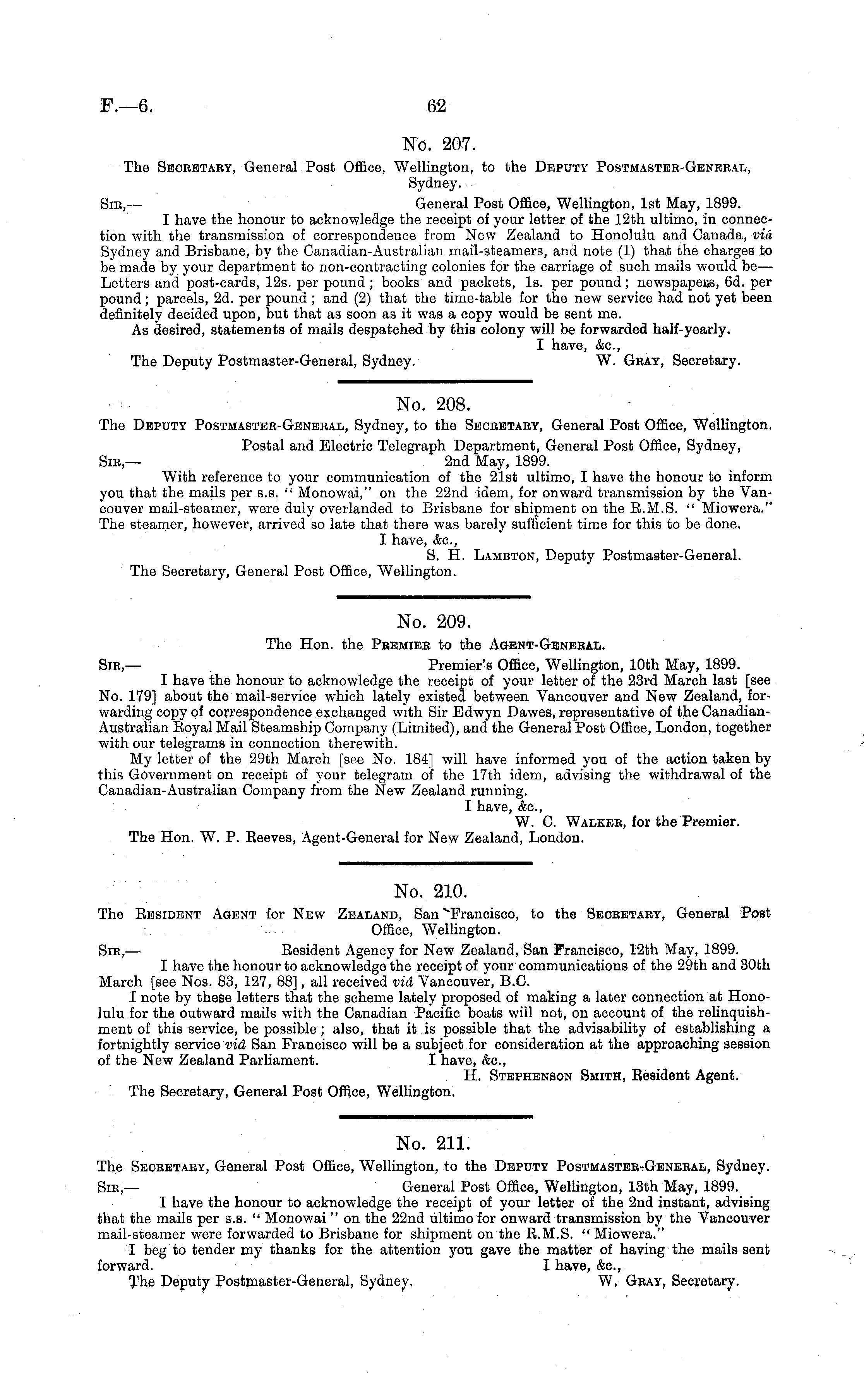 No. 210. The Besident Agent for New Zealand, San ""Francisco, to the Seceetaey, General Post Office, Wellington. Sic, — Besident Agency for New Zealand, San Francisco, 12th May, 1899. I have the honour to acknowledge the receipt of your communications of the 29th and 30th March [see Nos. 83, 127, 88], all received vid Vancouver, B.C. I note by these letters that the scheme lately proposed of making a later connection at Honolulu for the outward mails with the Canadian Pacific boats will not, on account of the relinquishment of this service, be possible; also, that it is possible that the advisability of establishing a fortnightly service vid San Francisco will be a subject for consideration at the approaching session of the New Zealand Parliament. I have, &c, H. Stephenson Smith, Besident Agent. The Secretary, General Post Office, Wellington.