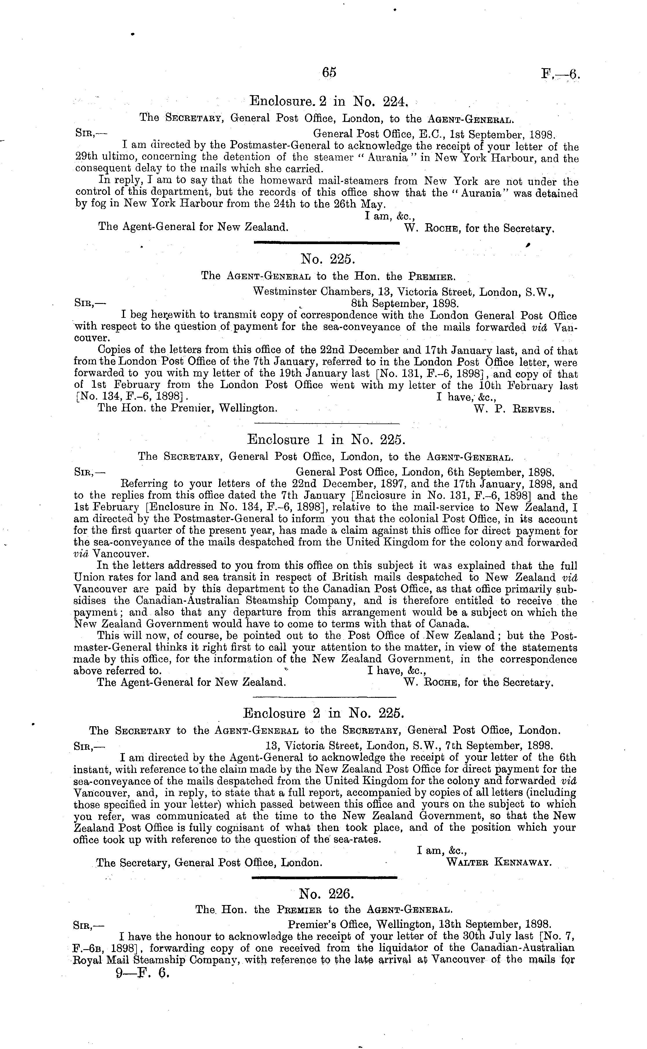 No. 226. The Hon. the Peemiee to the Agent-Geneeal. Sic, — Premier's Office, Wellington, 13th September, 1898. I have the honour to acknowledge the receipt of your letter of the 30th July last [No. 7, F.-6b, 1898], forwarding copy of one received from the liquidator of the Canadian-Australian Boyal Mail Steamship Company, with reference to the late arrival at Vancouver of the mails for