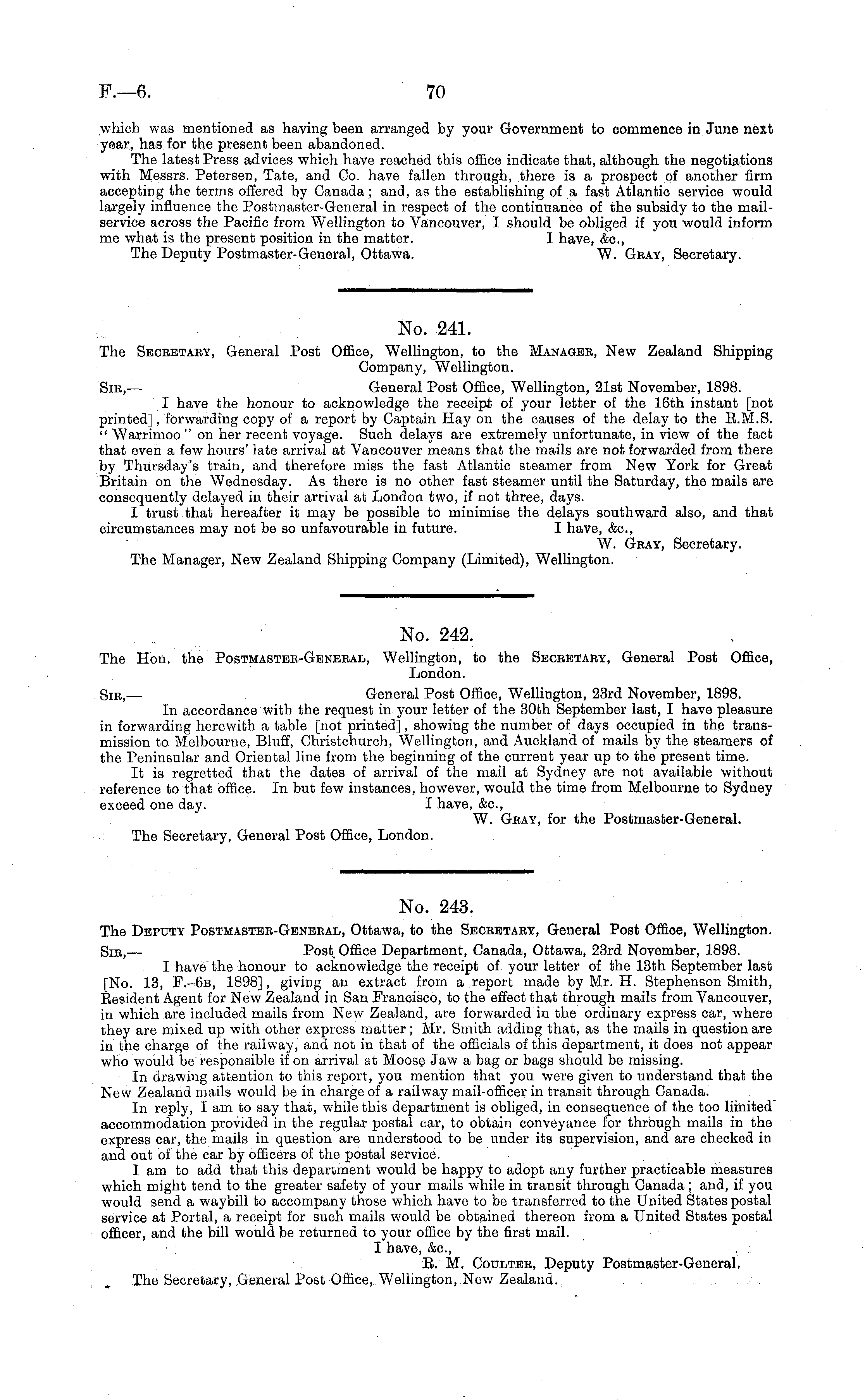 No. 241. The Seceetaey, General Post Office, Wellington, to the Managee, New Zealand Shipping Company, Wellington. Sic, — General Post Office, Wellington, 21st November, 1898. I have the honour to acknowledge the receipt of your letter of the 16th instant [not printed], forwarding copy of a report by Captain Hay on the causes of the delay to the R.M.S. " Warrimoo "on her recent voyage. Such delays are extremely unfortunate, in view of the fact that even a few hours' late arrival at Vancouver means that the mails are not forwarded from there by Thursday's train, and therefore miss the fast Atlantic steamer from New York for Great Britain on the Wednesday. As there is no other fast steamer until the Saturday, the mails are consequently delayed in their arrival at London two, if not three, days. I trust that hereafter it may be possible to minimise the delays southward also, and that circumstances may not be so unfavourable in future. I have, &c, W. Geay, Secretary. The Manager, New Zealand Shipping Company (Limited), Wellington.