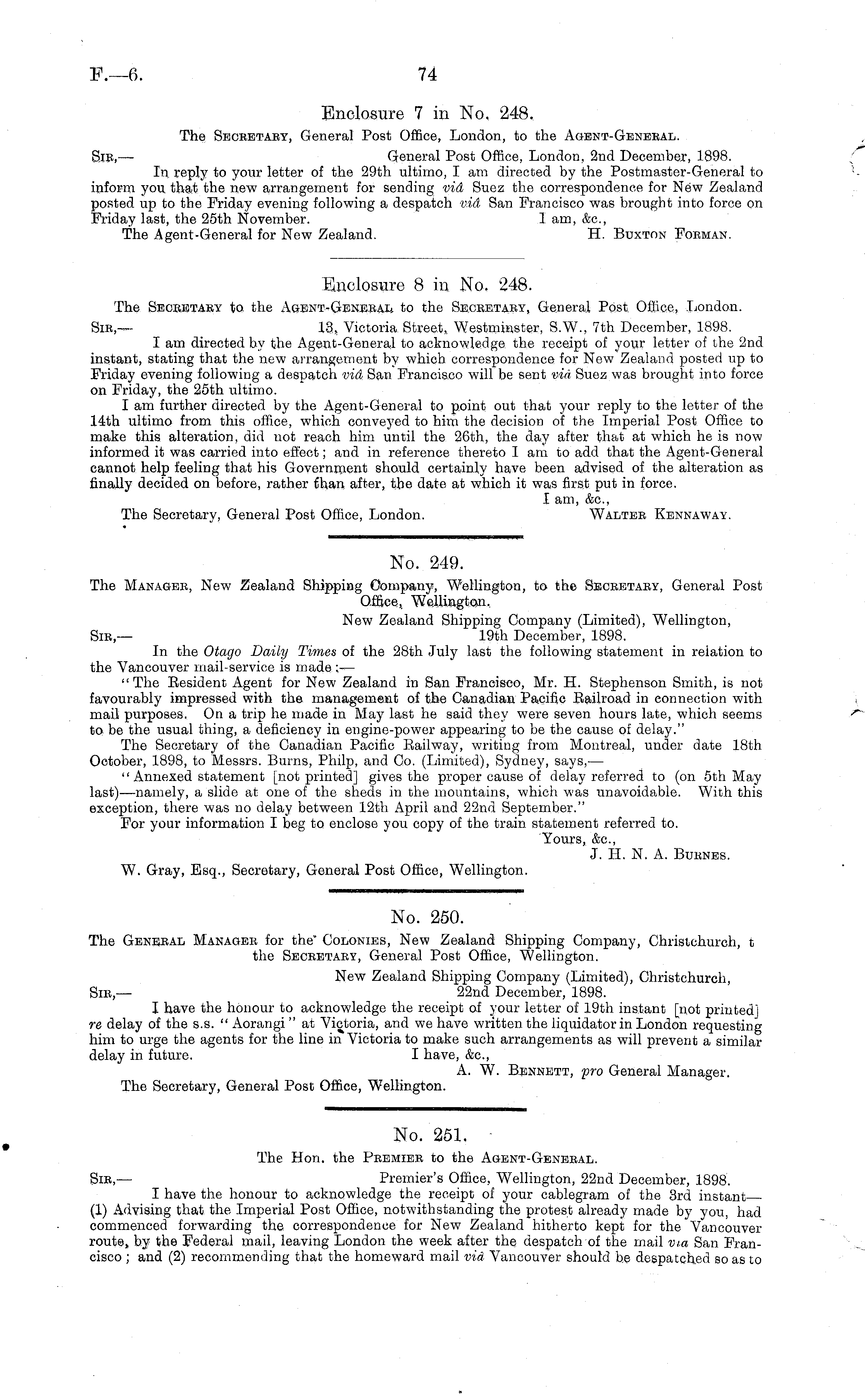 No. 251. The Hon. the Peemiee to the Agent-Geneeal. Sic, — Premier's Office, Wellington, 22nd December, 1898. I have the honour to acknowledge the receipt of your cablegram of the 3rd instant (1) Advising that the Imperial Post Office, notwithstanding the protest already made by you, had commenced forwarding the correspondence for New Zealand hitherto kept for the Vancouver route, by the Federal mail, leaving London the week after the despatch of the mail via San Francisco ; and (2) recommending that the homeward mail via Vancouver should he despatched so as to