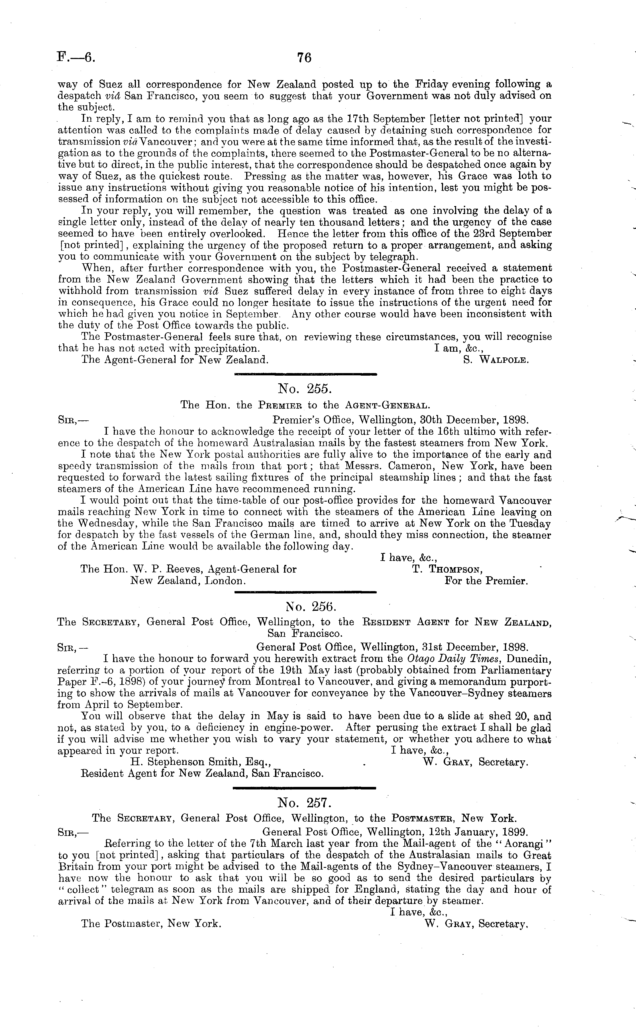 way of Suez all correspondence for New Zealand posted up to the Friday evening following a despatch vid San Francisco, you seem to suggest that your Government was not duly advised on the subject. In reply, I am to remind you that as long ago as the 17th September [letter not printed] your attention was called to the complaints made of delay caused by detaining such correspondence for transmission vid Vancouver; and you were at the same time informed that, as the result of the investigation as to the grounds of the complaints, there seemed to the Postmaster-General to be no alternative but to direct, in the public interest, that the correspondence should be despatched once again by way of Suez, as the quickest route. Pressing as the matter was, however, his Grace was loth to issue any instructions without giving you reasonable notice of his intention, lest you might be possessed of information on the subject not accessible to this office. In your reply, you will remember, the question was treated as one involving the delay of a single letter only, instead of the delay of nearly ten thousand letters; and the urgency of the case seemed to have been entirely overlooked. Hence the letter from this office of the 23rd September [not printed], explaining the urgency of the proposed return to a proper arrangement, and asking you to communicate with your Government on the subject by telegraph. When, after further correspondence with you, the Postmaster-General received a statement from the New Zealand Government showing that the letters which it had been the practice to withhold from transmission vid Suez suffered delay in every instance of from three to eight days in consequence, his Grace could no longer hesitate to issue the instructions of the urgent need for which he had given you notice in September. Any other course would have been inconsistent with the duty of the Post Office towards the public. The Postmaster-General feels sure that, on reviewing these circumstances, you will recognise that he has not acted with precipitation. I am, &c, The Agent-General for New Zealand. S. Walpole.
