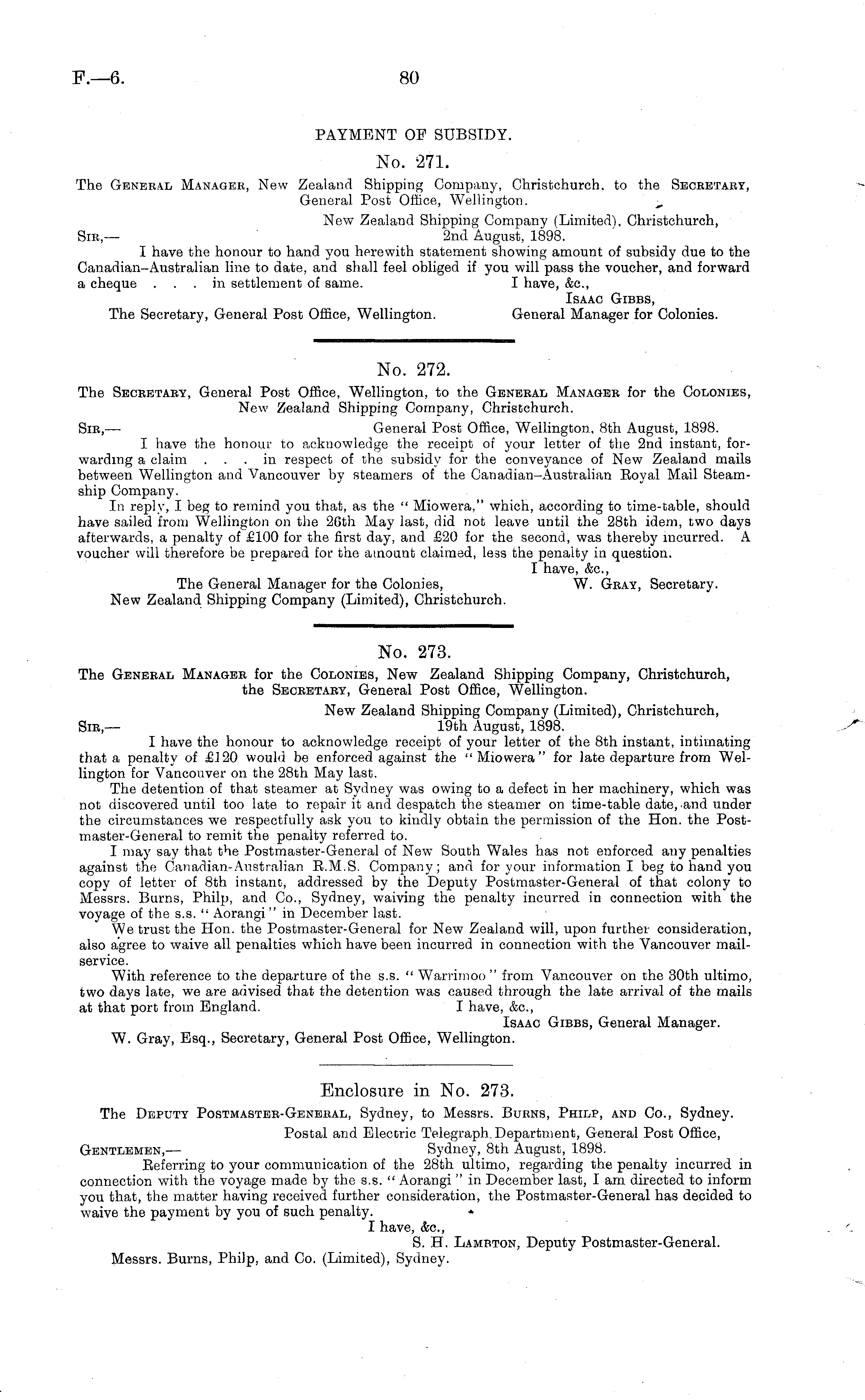 No. 273. The Geneeal Managee for the Colonies, New Zealand Shipping Company, Christchurch, the Seceetaey, General Post Office, Wellington. New Zealand Shipping Company (Limited), Christchurch, Sic,— 19th August, 1898. I have the honour to acknowledge receipt of your letter of the Bth instant, intimating that a penalty of £120 would be enforced against the "Miowera" for late departure from Wellington for Vancouver on the 28th May last. The detention of that steamer at Sydney was owing to a defect in her machinery, which was not discovered until too late to repair it and despatch the steamer on time-table date, and under the circumstances we respectfully ask you to kindly obtain the permission of the Hon. the Post-master-General to remit the penalty referred to. I may say that the Postmaster-General of New South Wales has not enforced any penalties against the Canadian-Australian R.M.S. Company; and for your information I beg to hand you copy of letter of Bth instant, addressed by the Deputy Postmaster-General of that colony to Messrs. Burns, Philp, and Co., Sydney, waiving the penalty incurred in connection with the voyage of the s.s. " Aorangi" in December last. We trust the Hon. the Postmaster-General for New Zealand will, upon further consideration, also agree to waive all penalties which have been incurred in connection with the Vancouver mailservice. With reference to the departure of the s.s. " Warrimoo " from Vancouver on the 30th ultimo, two days late, we are advised that the detention was caused through the late arrival of the mails at that port from England. I have, &c, Isaac Gibbs, General Manager. W. Gray, Esq., Secretary, General Post Office, Wellington.