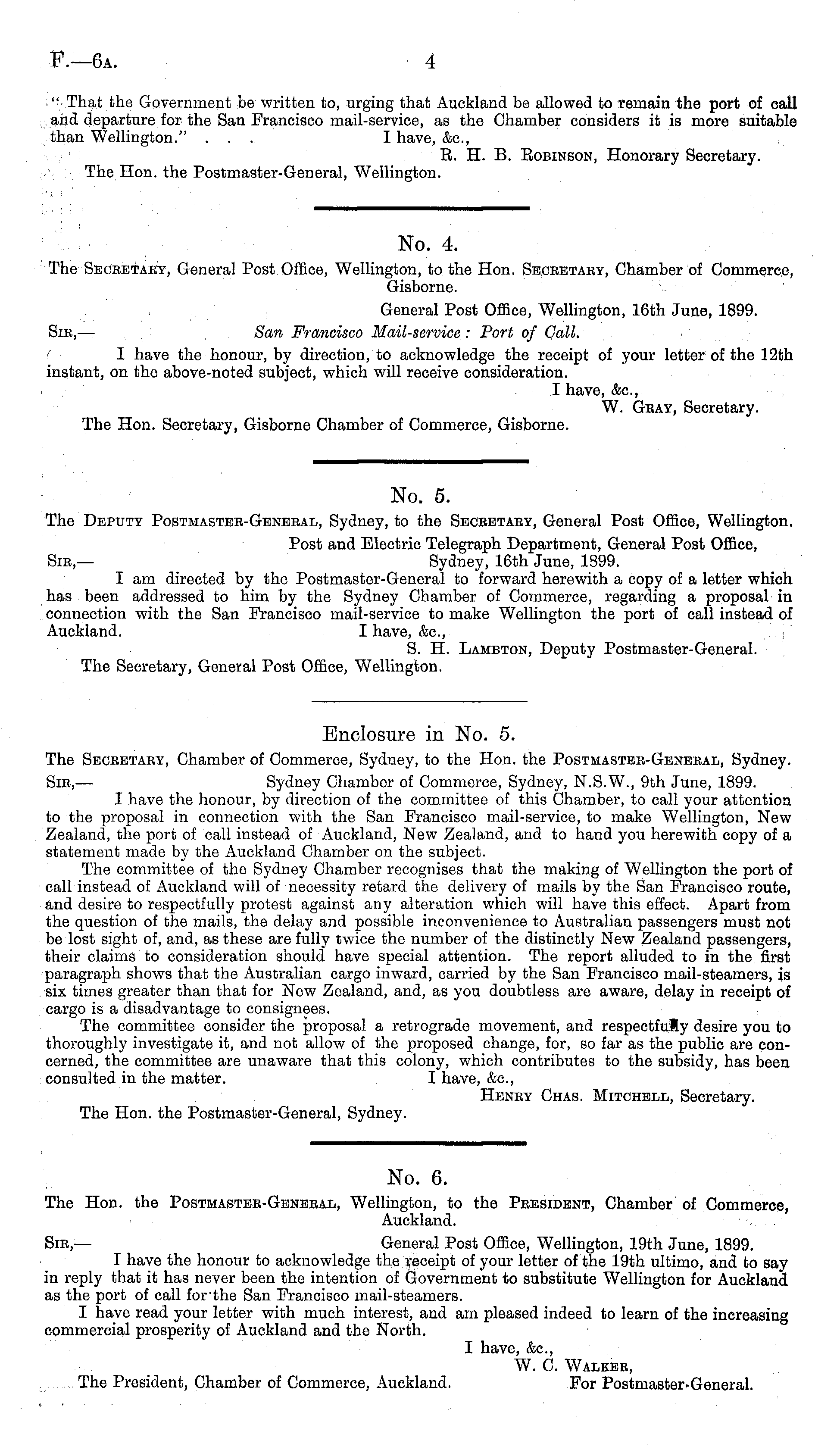 Enclosure in No. 5. The Secretary, Chamber of Commerce, Sydney, to the Hon. the Postmaster-General, Sydney. Sir, — Sydney Chamber of Commerce, Sydney, N.S.W., 9th June, 1899. I have the honour, by direction of the committee of this Chamber, to call your attention to the proposal in connection with the San Francisco mail-service, to make Wellington, New Zealand, the port of call instead of Auckland, New Zealand, and to hand you herewith copy of a statement made by the Auckland Chamber on the subject. The committee of the Sydney Chamber recognises that the making of Wellington the port of call instead of Auckland will of necessity retard the delivery of mails by the San Francisco route, and desire to respectfully protest against any alteration which will have this effect. Apart from the question of the mails, the delay and possible inconvenience to Australian passengers must not be lost sight of, and, as these are fully twice the number of the distinctly New Zealand passengers, their claims to consideration should have special attention. The report alluded to in the first paragraph shows that the Australian cargo inward, carried by the San Francisco mail-steamers, is six times greater than that for New Zealand, and, as you doubtless are aware, delay in receipt of cargo is a disadvantage to consignees. The committee consider the proposal a retrograde movement, and respectfuly desire you to thoroughly investigate it, and not allow of the proposed change, for, so far as the public are concerned, the committee are unaware that this colony, which contributes to the subsidy, has been consulted in the matter. I have, &c, Henry Chas. Mitchell, Secretary. The Hon. the Postmaster-General, Sydney.
