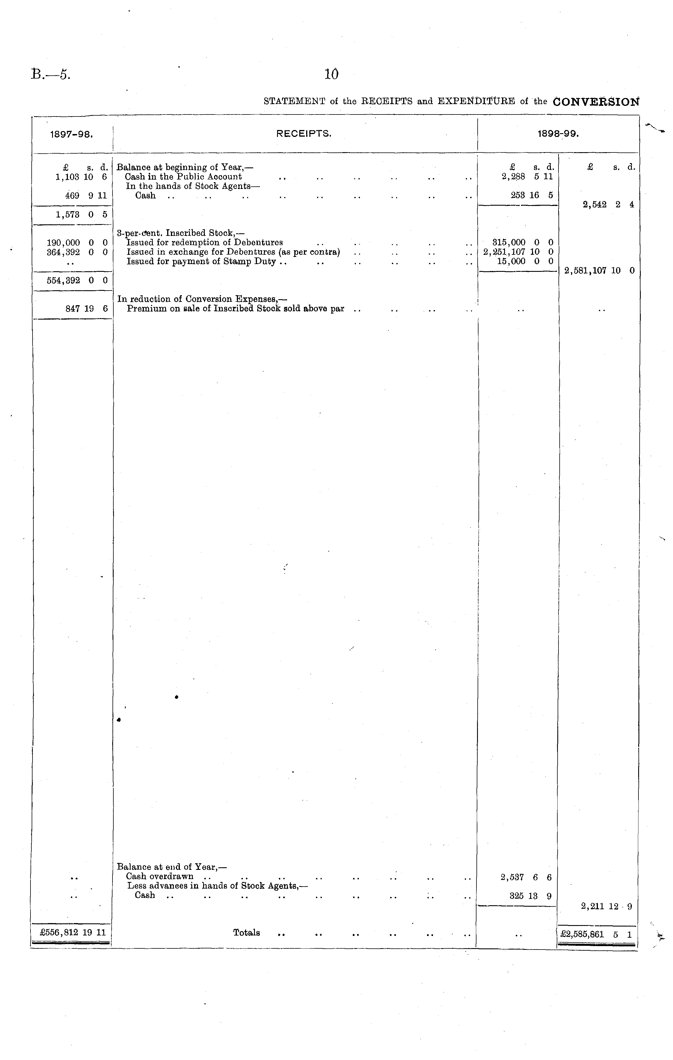 1897-98. RECEIPTS. 189 5-99. £ s. d. 1,103 10 6 469 9 11 Balance at beginning of Year, — Gash in the Public Aocount In the hands of Stock Agents— Cash £ s. d. 2,288 5 11 253 16 5 £ s. d. 2,542 2 4 1,573 0 5 3-per-tfent. Inscribed Stock, — Issued for redemption of Debentures Issued in exchange for Debentures (as per contra) Issued for payment of Stamp Duty 190,000 0 0 364,392 0 0 315,000 0 0 2,251,107 10 0 15,000 0 0 2,581,107 10 0 554,392 0 0 847 19 6 In reduction of Conversion Expenses,—■ Premium on sale of Inscribed Stock sold above par .. / • 4 Balance at end of Year, — Cash overdrawn Less advances in hands of Stock Agents,— Cash 2,537 6 6 325 13 9 2,211 12 9 S556.812 19 11 Totals £2,585,861 5 1