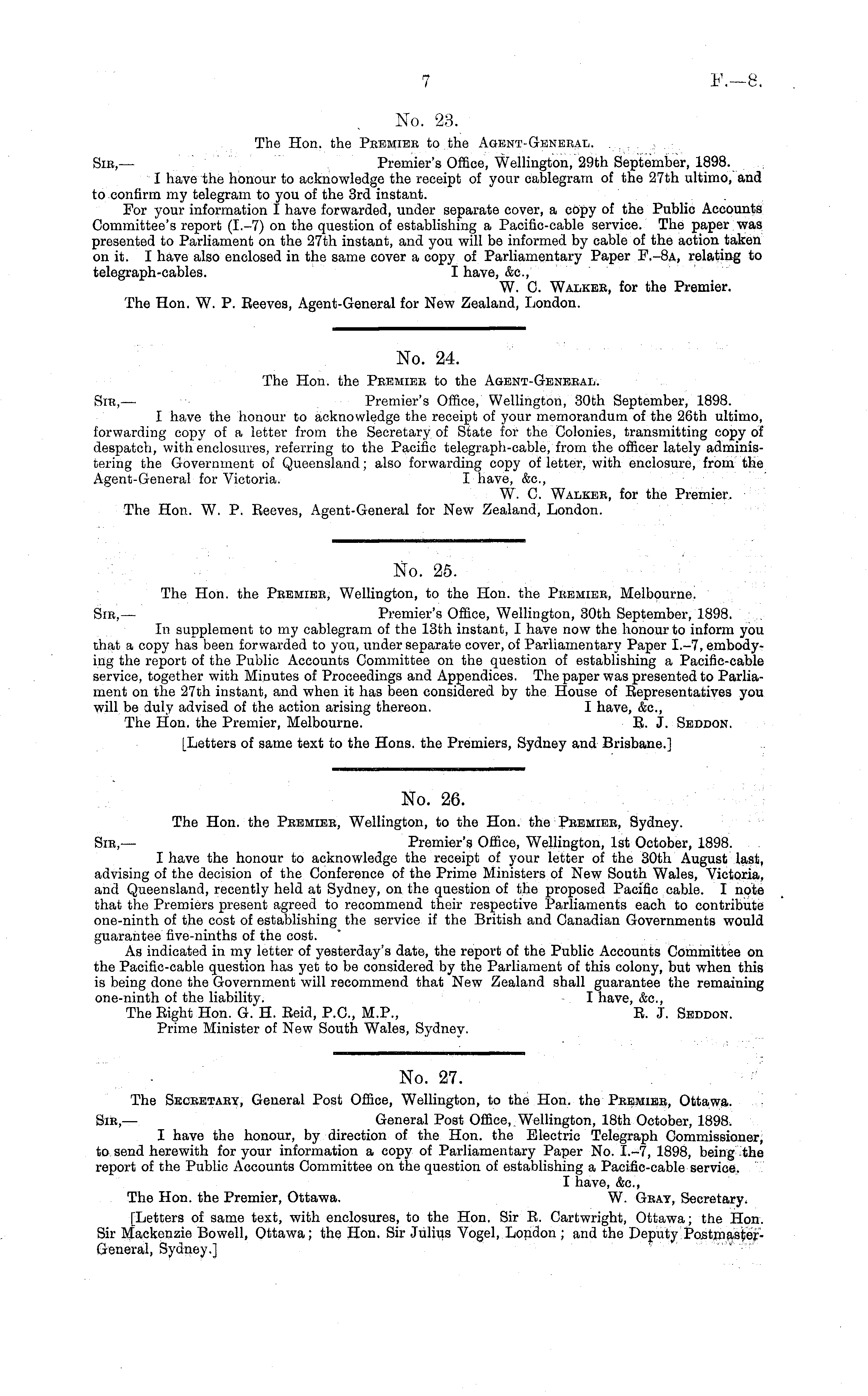 No. 23. The Hon. the Peemieb to the Agent-General. . . . . Sir, — Premier's Office, Wellington, 29th September, 1898. I have the honour to acknowledge the receipt of your cablegram of the 27th ultimo, and to confirm my telegram to you of the 3rd instant. For your information I have forwarded, under separate cover, a copy of the Public Accounts Committee's report (1.-7) on the question of establishing a Pacific-cable service. The paper was presented to Parliament on the 27th instant, and you will be informed by cable of the action taken on it. I have also enclosed in the same cover a copy of Parliamentary Paper F.-Ba, relating to telegraph-cables. I have, &c, W. C. Walker, for the Premier. The Hon. W. P. Eeeves, Agent-General for New Zealand, London.