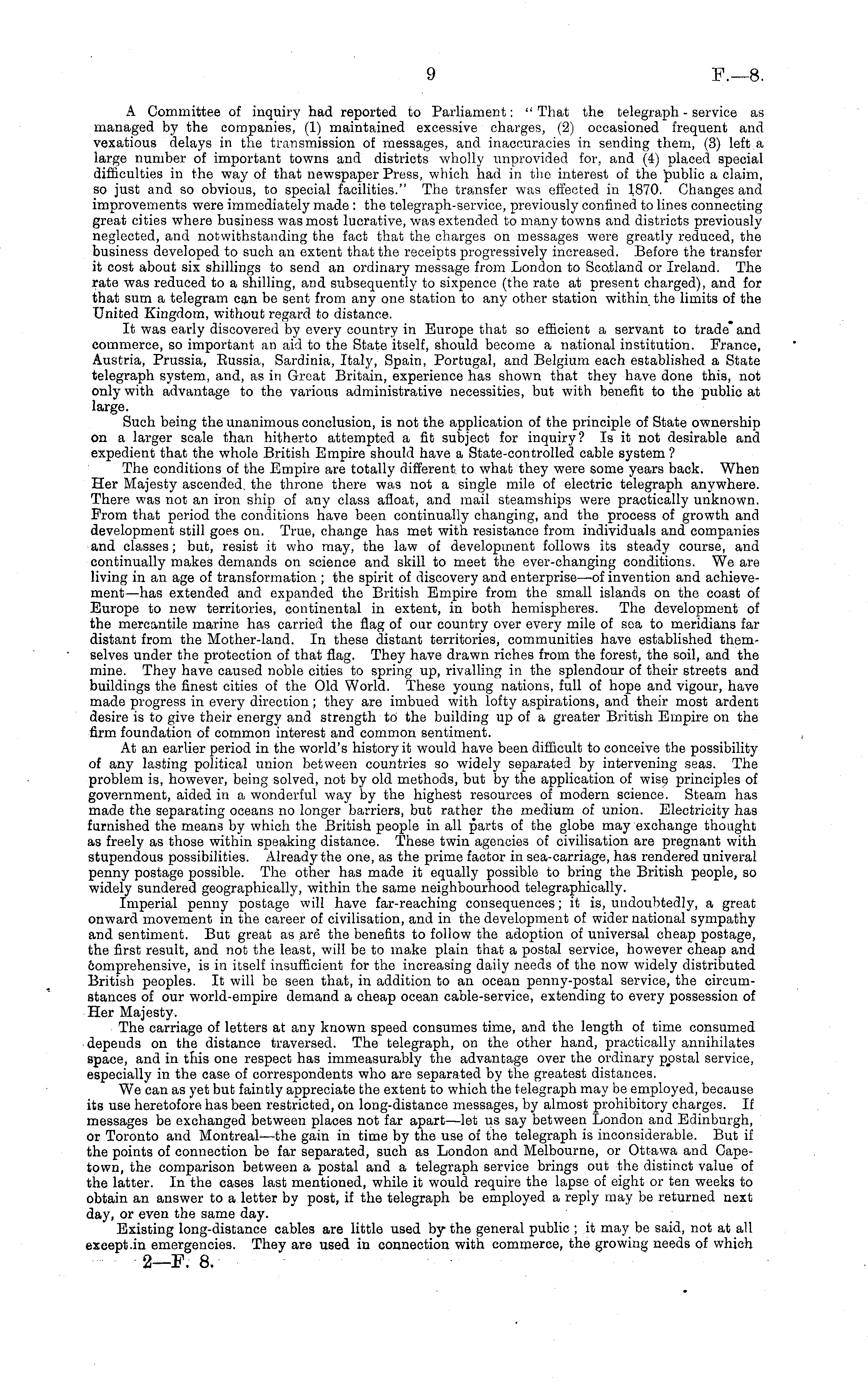 A Committee of inquiry had reported to Parliament: " That the telegraph - service as managed by the companies, (1) maintained excessive charges, (2) occasioned frequent and vexatious delays in the transmission of messages, and inaccuracies in sending them, (3) left a large number of important towns and districts wholly unprovided for, and (4) placed special difficulties in the way of that newspaper Press, which had in the interest of the public a claim, so just and so obvious, to special facilities." The transfer was effected in 1870. Changes and improvements were immediately made : the telegraph-service, previously confined to lines connecting great cities where business was most lucrative, was extended to many towns and districts previously neglected, and notwithstanding the fact that the charges on messages were greatly reduced, the business developed to such an extent that the receipts progressively increased. Before the transfer it cost about six shillings to send an ordinary message from London to Scotland or Ireland. The rate was reduced to a shilling, and subsequently to sixpence (the rate at present charged), and for that sum a telegram can be sent from any one station to any other station within the limits of the United Kingdom, without regard to distance. It was early discovered by every country in Europe that so efficient a servant to trade and commerce, so important an aid to the State itself, should become a national institution. France, Austria, Prussia, Eussia, Sardinia, Italy, Spain, Portugal, and Belgium each established a State telegraph system, and, as in Great Britain, experience has shown that they have done this, not only with advantage to the various administrative necessities, but with benefit to the public at large. Such being the unanimous conclusion, is not the application of the principle of State ownership on a larger scale than hitherto attempted a fit subject for inquiry? Is it not desirable and expedient that the whole British Empire should have a State-controlled cable system ? The conditions of the Empire are totally different, to what they were some years back. When Her Majesty ascended, the throne there was not a single mile of electric telegraph anywhere. There was not an iron ship of any class afloat, and mail steamships were practically unknown. From that period the conditions have been continually changing, and the process of growth and development still goes on. True, change has met with resistance from individuals and companies and classes; but, resist it who may, the law of development follows its steady course, and continually makes demands on science and skill to meet the ever-changing conditions. We are living in an age of transformation ; the spirit of discovery and enterprise—of invention and achievement—has extended and expanded the British Empire from the small islands on the coast of Europe to new territories, continental in extent, in both hemispheres. The development of the mercantile marine has carried the flag of our country over every mile of sea to meridians far distant from the Mother-land. In these distant territories, communities have established themselves under the protection of that flag. They have drawn riches from the forest, the soil, and the mine. They have caused noble cities to spring up, rivalling in the splendour of their streets and buildings the finest cities of the Old World. These young nations, full of hope and vigour, have made progress in every direction; they are imbued with lofty aspirations, and their most ardent desire is to give their energy and strength to the building up of a greater British Empire on the firm foundation of common interest and common sentiment. At an earlier period in the world's history it would have been difficult to conceive the possibility of any lasting political union between countries so widely separated by intervening seas. The problem is, however, being solved, not by old methods, but by the application of wise, principles of government, aided in a wonderful way by the highest resources of modern science. Steam has made the separating oceans no longer barriers, but rather the medium of union. Electricity has furnished the means by which the British people in all parts of the globe may exchange thought as freely as those within speaking distance. These twin agencies of civilisation are pregnant with stupendous possibilities. Already the one, as the prime factor in sea-carriage, has rendered univeral penny postage possible. The other has made it equally possible to bring the British people, so widely sundered geographically, within the same neighbourhood telegraphically. Imperial penny postage will have far-reaching consequences; it is, undoubtedly, a great onward movement in the career of civilisation, and in the development of wider national sympathy and sentiment. But great as are the benefits to follow the adoption of universal cheap postage, the first result, and not the least, will be to make plain that a postal service, however cheap and 6omprehensive, is in itself insufficient for the increasing daily needs of the now widely distributed British peoples. It will be seen that, in addition to an ocean penny-postal service, the circumstances of our world-empire demand a cheap ocean cable-service, extending to every possession of Her Majesty. The carriage of letters at any known speed consumes time, and the length of time consumed depends on the distance traversed. The telegraph, on the other hand, practically annihilates space, and in this one respect has immeasurably the advantage over the ordinary postal service, especially in the case of correspondents who are separated by the greatest distances. We can as yet but faintly appreciate the extent to which the telegraph may be employed, because its use heretofore has been restricted, on long-distance messages, by almost prohibitory charges. If messages be exchanged between places not far apart —let us say between London 