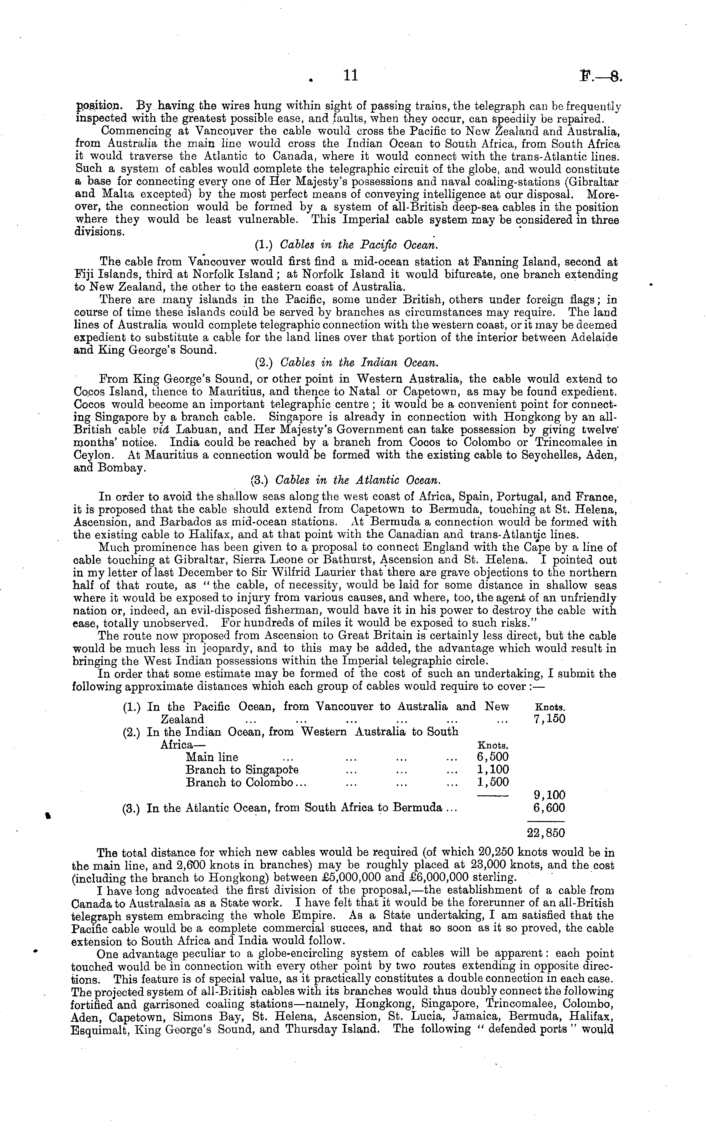 position. By having the wires hung within sight of passing trains, the telegraph can be frequently inspected with the greatest possible ease, and faults, when they occur, can speedily be repaired. Commencing at Vancouver the cable would cross the Pacific to New Zealand and Australia, from Australia the main line would cross the Indian Ocean to South Africa, from South Africa it would traverse the Atlantic to Canada, where it would connect with the trans-Atlantic lines. Such a system of cables would complete the telegraphic circuit of the globe, and would constitute a base for connecting every one of Her Majesty's possessions and naval coaling-stations (Gibraltar and Malta excepted) by the most perfect means of conveying intelligence at our disposal. Moreover, the connection would be formed by a system of all-British deep-sea cables in the position where they would be least vulnerable. This Imperial cable system may be considered in three divisions. (1.) Cables in the Pacific Ocean. The cable from Vancouver would first find a mid-ocean station at Fanning Island, second at Fiji Islands, third at Norfolk Island; at Norfolk Island it would bifurcate, one branch extending to New Zealand, the other to the eastern coast of Australia. There are many islands in the Pacific, some under British, others under foreign flags; in course of time these islands could be served by branches as circumstances may require. The land lines of Australia would complete telegraphic connection with the western coast, or it may be deemed expedient to substitute a cable for the land lines over that portion of the interior between Adelaide and King George's Sound. (2.) Cables in the Indian Ocean. From King George's Sound, or other point in Western Australia, the cable would extend to Cocos Island, thence to Mauritius, and thence to Natal or Capetown, as may be found expedient. Cocos would become an important telegraphic centre ; it would be a convenient point for connecting Singapore by a branch cable. Singapore is already in connection with Hongkong by an allBritish cable vid Labuan, and Her Majesty's Government can take possession by giving twelve' months' notice. India could be reached by a branch from Cocos to Colombo or Trincomalee in Ceylon. At Mauritius a connection would be formed with the existing cable to Seychelles, Aden, and Bombay. (3.) Cables in the Atlantic Ocean. In order to avoid the shallow seas along the west coast of Africa, Spain, Portugal, and France, it is proposed that the cable should extend from Capetown to Bermuda, touching at St. Helena, Ascension, and Barbados as mid-ocean stations. At Bermuda a connection would be formed with the existing cable to Halifax, and at that point with the Canadian and trans-Atlantic lines. Much prominence has been given to a proposal to connect England with the Cape by a line of cable touching at Gibraltar, Sierra Leone or Bathurst, Ascension and St. Helena. I pointed out in my letter of last December to Sir Wilfrid Laurier that there are grave objections to the northern half of that route, as " the cable, of necessity, would be laid for some distance in shallow seas where it would be exposed to injury from various causes, and where, too, the agent of an unfriendly nation or, indeed, an evil-disposed fisherman, would have it in his power to destroy the cable with ease, totally unobserved. For hundreds of miles it would be exposed to such risks." The route now proposed from Ascension to Great Britain is certainly less direct, but the cable would be much less in jeopardy, and to this may be added, the advantage which would result in bringing the West Indian possessions within the Imperial telegraphic circle. In order that some estimate may be formed of the cost of such an undertaking, I submit the following approximate distances which each group of cables would require to cover : — (1.) In the Pacific Ocean, from Vancouver to Australia and New Knots. Zealand ... ... ... ... ... ... 7,150 (2.) In the Indian Ocean, from Western Australia to South Africa— Knots. Mainline ... ... ... ... 6,500 Branch to Singapore ... ... ... 1,100 Branch to Colombo... ... ... ... 1,500 9,100 (3.) In the Atlantic Ocean, from South Africa to Bermuda ... 6,600 22,850 The total distance for which new cables would be required (of which 20,250 knots would be in the main line, and 2,600 knots in branches) may be roughly placed at 23,000 knots, and the cost (including the branch to Hongkong) between £5,000,000 and £6,000,000 sterling. I have long advocated the first division of the proposal,—the establishment of a cable from Canada to Australasia as a State work. I have felt that it would be the forerunner of an all-British telegraph system embracing the whole Empire. As a State undertaking, I am satisfied that the Pacific cable would be a complete commercial succes, and that so soon as it so proved, the cable extension to South Africa and India would follow. One advantage peculiar to a globe-encircling system of cables will be apparent: each point touched would be in connection with every other point by two routes extending in opposite directions. This feature is of special value, as it practically constitutes a double connection in each ease. The projected system of all-British cables with its branches would thus doubly connect the following fortified and garrisoned coaling stations —namely, Hongkong, Singapore, Trincomalee, Colombo, Aden, Capetown, Simons Bay, St. Helena, Ascension, St. Lucia, Jamaica, Bermuda, Halifax, Esquimalt, King George's Sound, and Thursday Island. The following " defended ports " would