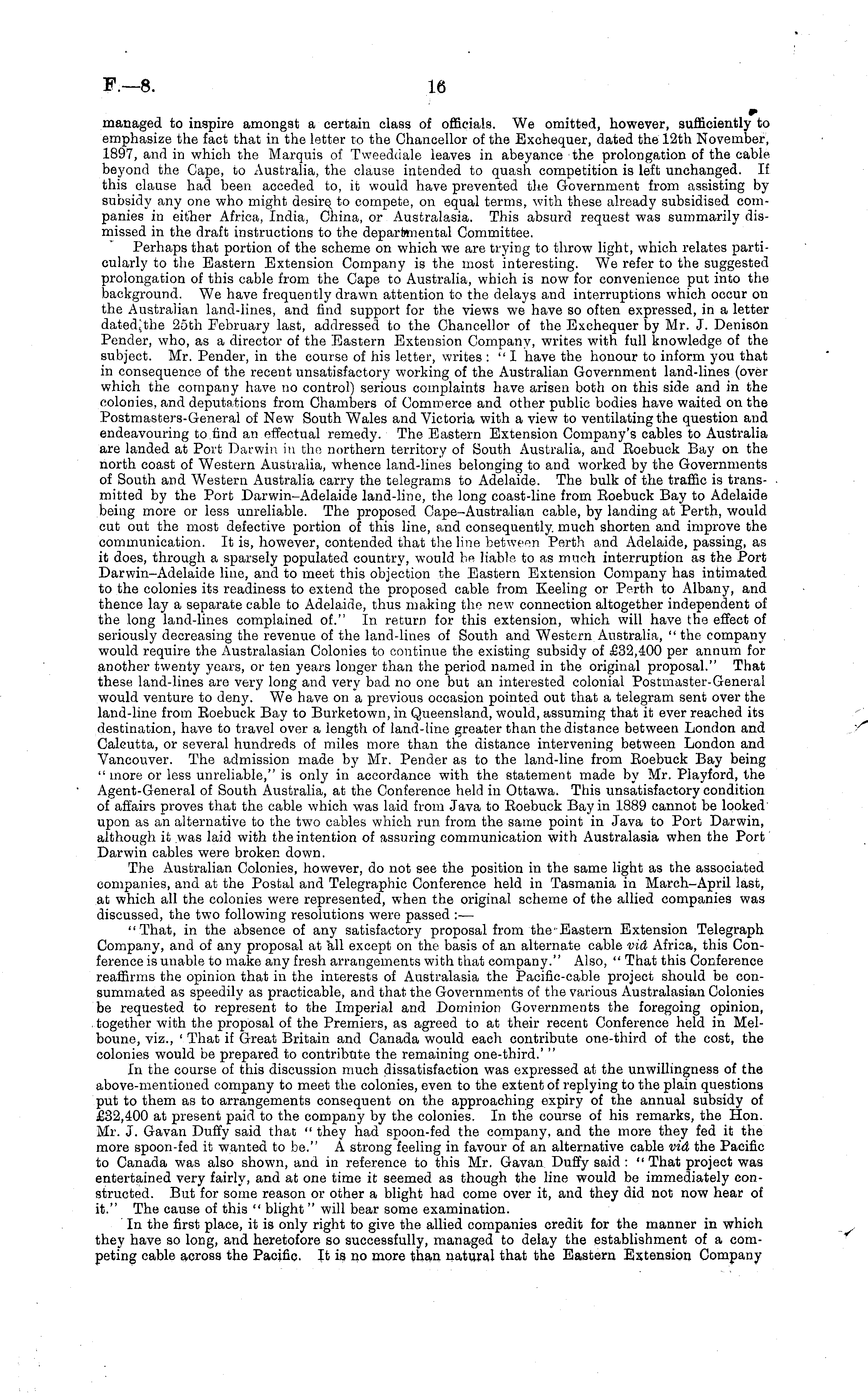 r managed to inspire amongst a certain class of officials. We omitted, however, sufficiently to emphasize the fact that in the letter to the Chancellor of the Exchequer, dated the 12th November, 1897, and in which the Marquis of Tweeddale leaves in abeyance the prolongation of the cable beyond the Cape, to Australia, the clause intended to quash competition is left unchanged. If this clause had been acceded to, it would have prevented the Government from assisting by subsidy any one who might desirq to compete, on equal terms, with these already subsidised companies in either Africa, India, China, or Australasia. This absurd request was summarily dismissed in the draft instructions to the departmental Committee. Perhaps that portion of the scheme on which we are trying to throw light, which relates particularly to the Eastern Extension Company is the most interesting. We refer to the suggested prolongation of this cable from the Cape to Australia, which is now for convenience put into the background. We have frequently drawn attention to the delays and interruptions which occur on the Australian land-lines, and find support for the views we have so often expressed, in a letter datedjthe 25th February last, addressed to the Chancellor of the Exchequer by Mr. J. DenisOn Pender, who, as a director of the Eastern Extension Company, writes with full knowledge of the subject. Mr. Pender, in the course of his letter, writes :" I have the honour to inform you that in consequence of the recent unsatisfactory working of the Australian Government land-lines (over which the company have no control) serious complaints have arisen both on this side and in the colonies, and deputations from Chambers of Commerce and other public bodies have waited on the Postmasters-General of New South Wales and Victoria with a view to ventilating the question and endeavouring to find an effectual remedy. The Eastern Extension Company's cables to Australia are landed at Port Darwin in the northern territory of South Australia, and Eoebuek Bay on the north coast of Western Australia, whence land-lines belonging to and worked by the Governments of South and Western Australia carry the telegrams to Adelaide. The bulk of the traffic is trans- ■ mitted by the Port Darwin-Adelaide land-line, the long coast-line from Eoebuek Bay to Adelaide being more or less unreliable. The proposed Cape-Australian cable, by landing at Perth, would cut out the most defective portion of this line, and consequently, much shorten and improve the communication. It is, however, contended that the line between Perth and Adelaide, passing, as it does, through a sparsely populated country, would be liable to as much interruption as the Port Darwin-Adelaide line, and to meet this objection the Eastern Extension Company has intimated to the colonies its readiness to extend the proposed cable from Keeling or Perth to Albany, and thence lay a separate cable to Adelaide, thus making the new connection altogether independent of the long land-lines complained of." In return for this extension, which will have the effect of seriously decreasing the revenue of the land-lines of South and Western Australia, " the company would require the Australasian Colonies to continue the existing subsidy of £32,400 per annum for another twenty years, or ten years longer than the period named in the original proposal." That these land-lines are very long and very bad no one but an interested colonial Postmaster-General would venture to deny. We have on a previous occasion pointed out that a telegram sent over the land-line from Eoebuek Bay to Burketown, in Queensland, would, assuming that it ever reached its destination, have to travel over a length of land-line greater than the distance between London and Calcutta, or several hundreds of miles more than the distance intervening between London and Vancouver. The admission made by Mr. Pender as to the land-line from Eoebuek Bay being " more or less unreliable," is only in accordance with the statement made by Mr. Playford, the Agent-General of South Australia, at the Conference held in Ottawa. This unsatisfactory condition of affairs proves that the cable which was laid from Java to Eoebuek Bay in 1889 cannot be looked' upon as an alternative to the two cables which run from the same point in Java to Port Darwin, although it was laid with the intention of assuring communication with Australasia when the Port Darwin cables were broken down. The Australian Colonies, however, do not see the position in the same light as the associated companies, and at the Postal and Telegraphic Conference held in Tasmania in March-April last, at which all the colonies were represented, when the original scheme of the allied companies was discussed, the two following resolutions were passed : — "That, in the absence of any satisfactory proposal from the Eastern Extension Telegraph Company, and of any proposal at all except on the basis of an alternate cable via Africa, this Conference is unable to make any fresh arrangements with that company." Also, " That this Conference reaffirms the opinion that in the interests of Australasia the Pacific-cable project should be consummated as speedily as practicable, and that the Governments of the various Australasian Colonies be requested to represent to the Imperial and Dominion Governments the foregoing opinion, together with the proposal of the Premiers, as agreed to at their recent Conference held in Melboune, viz., ' That if Great Britain and Canada would each contribute one-third of the cost, the colonies would be prepared to contribute the remaining one-third.' " In the course of this discussion much dissatisfaction was expressed at the unwillingness of the above-mentioned company to meet the colonies, even to the extent of replying to the plain questions put to them as to arrangements consequent on the approaching expiry of the annual subsidy of £32,400 at present paid to the company by t