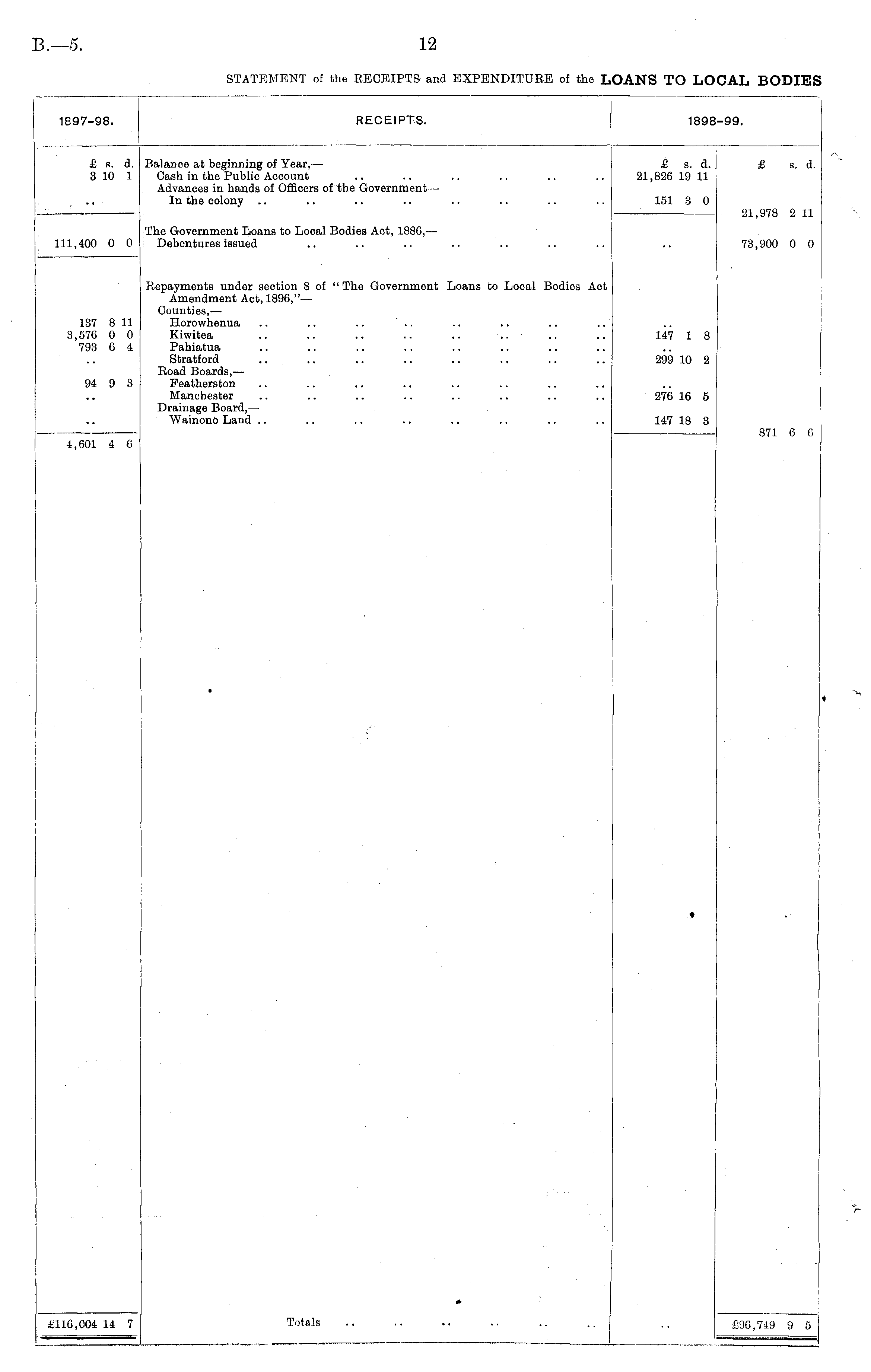 1897-98. 189 i-99. £ s. d. 3 10 1 Balance at beginning of Year, — Cash in the Public Account Advances in hands of Officers of the Government— In the colony £ s. d. 21,826 19 11 £ s. d. 151 3 0 21,978 2 11 111,400 0 0 The Government Loans to Local Bodies Act, 1886, — Debentures issued 73,900 0 0 137 8 11 3,576 0 0 793 6 4 94 9 3 Repayments under section 8 of " The Government Loans to Local Bodies Act Amendment Act, 1896," — Counties, — Horowhenua .. .. .. Kiwitea Pahiatua Stratford Eoad Boards, — Featherston Manchester Drainage Board, — Wainono Land .. 147 1 8 299 10 2 276 16 5 147 18 3 871 6 6 4,601 4 6 • « • « Totals 1:116,004 14 7 £90,749 9 5