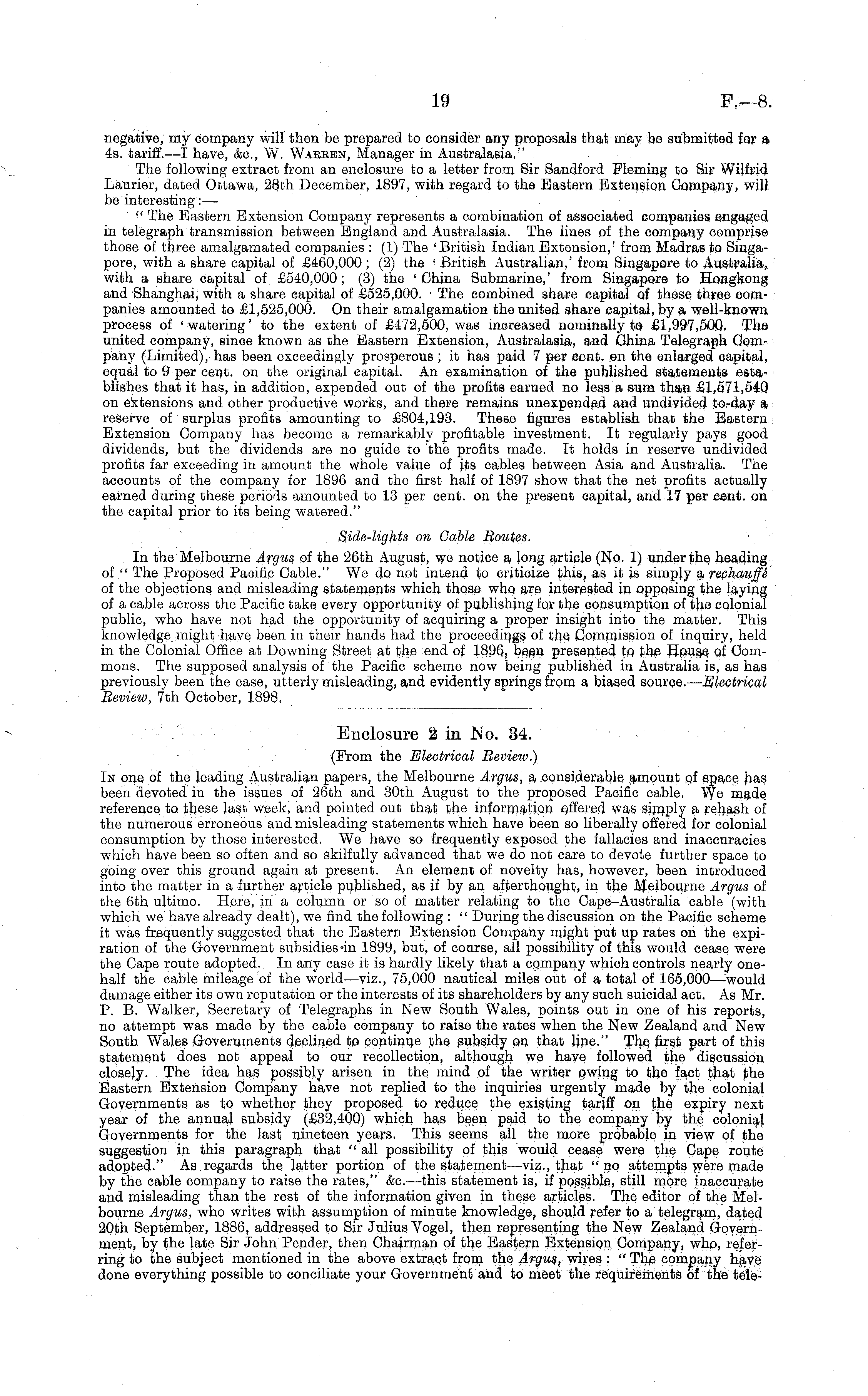 Enclosure 2 in No. 34. (From the Electrical Review.) In one of the leading Australian papers, the Melbourne Argus, a considerable amount qf space has been devoted in the issues of 26th and 30th August to the proposed Pacific cable. We made reference to these last week, and pointed out that the information offered was simply a rehash of the numerous erroneous and misleading statements which have been so liberally offered for colonial consumption by those interested. We have so frequently exposed the fallacies and inaccuracies which have been so often and so skilfully advanced that we do not care to devote further space to going over this ground again at present. An element of novelty has, however, been introduced into the matter in a further article published, as if by an afterthought, in the Melbourne Argus of the 6th ultimo. Here, in a column or so of matter relating to the Cape-Australia cable (with which we have already dealt), we find the following : " During the discussion on the Pacific scheme it was frequently suggested that the Eastern Extension Company might put up rates on the expiration of the Government subsidies-in 1899, but, of course, all possibility of this would cease were the Cape route adopted. In any case it is hardly likely that a company which controls nearly onehalf the cable mileage of the world—viz., 75,000 nautical miles out of a total of 165,000 —would damage either its own reputation or the interests of its shareholders by any such suicidal act. As Mr. P. B. Walker, Secretary of Telegraphs in New South Wales, points out in one of his reports, no attempt was made by the cable company to raise the rates when the New Zealand and New South Wales Governments declined to continue the subsidy on that line." The first part of this statement does not appeal to our recollection, although we have followed the' discussion closely. The idea has possibly arisen in the mind of the writer owing to the fact that the Eastern Extension Company have not replied to the inquiries urgently made by the colonial Governments as to whether they proposed to reduce the existing tariff on the expiry next year of the annual subsidy (£32,400) which has been paid to the company by the colonial Governments for the last nineteen years. This seems all the more probable in view of the suggestion in this paragraph that " all possibility of this would cease were the Cape route adopted." As regards the latter portion of the statement—viz., that "no attempts were made by the cable company to raise the rates," &c. —this statement is, if possible, still more inaccurate and misleading than the rest of the information given in these articles. The editor of the Melbourne Argus, who writes with assumption of minute knowledge, should refer to a telegram, dated 20th September, 1886, addressed to Sir Julius Vogel, then representing the New Zealand Government, by the late Sir John Pender, then Chairman of the Eastern Extension Company, who, referring to the subject mentioned in the above extract from the Argus, wires : " The company have done everything possible to conciliate your Government and to meet the requirements of the tele-