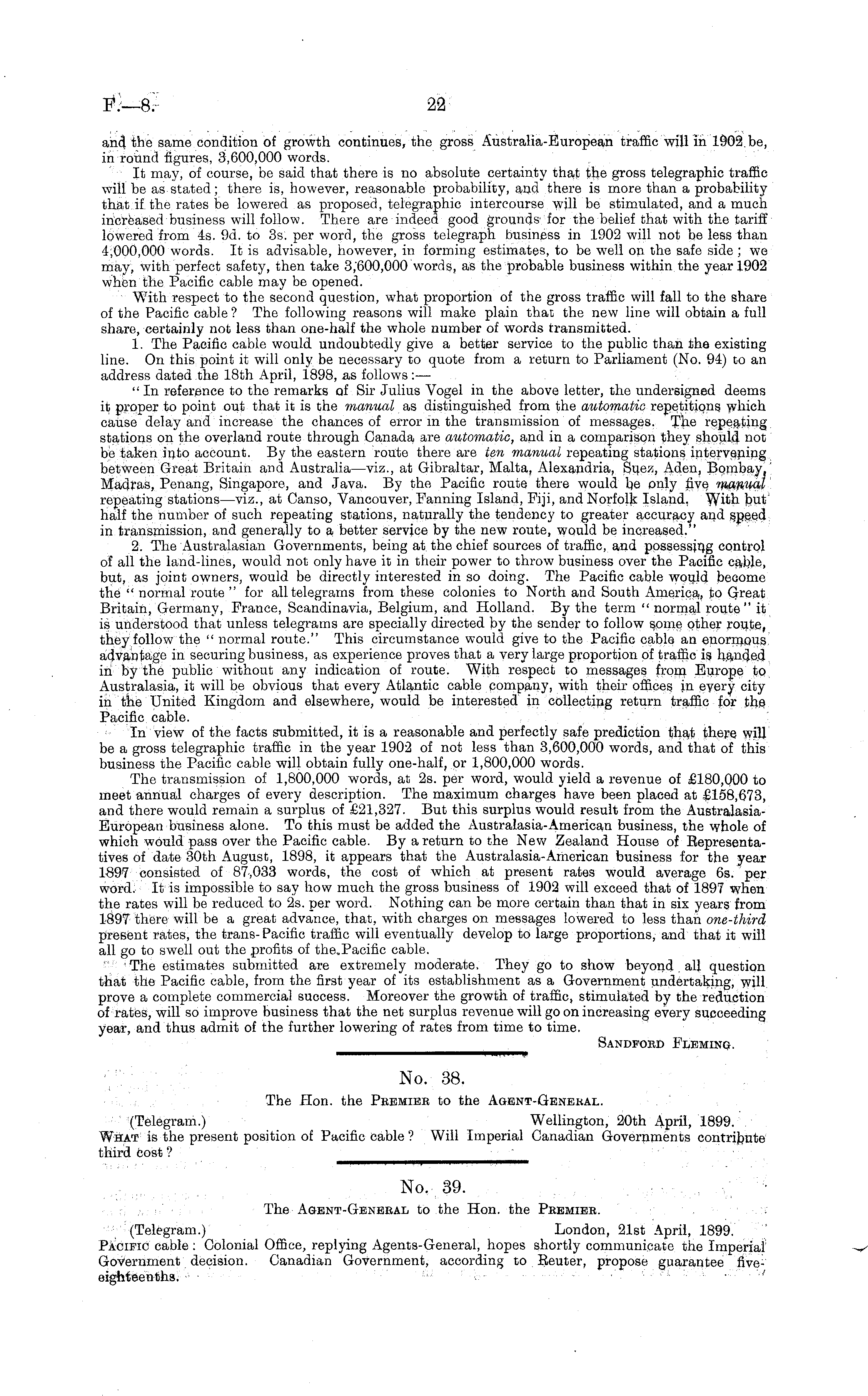 anc} the same condition of growth continues, the gross Australia-European traffic will in 1902 in round figures, 3,600,000 words. It may, of course, be said that there is no absolute certainty that the gross telegraphic tr will he as stated; there is, however, reasonable probability, and there is more than a probab that if the rates be lowered as proposed, telegraphic intercourse will be stimulated, and a m increased business will follow. There are indeed good grounds 1 for the belief that with the t: lowered from 4s. 9d. to 3s. per word, the gross telegraph business in 1902 will not be less t 4,000,000 words. It is advisable, however, in forming estimates, to be well on the safe side ; may, with perfect safety, then take 3,600,000 words, as the probable business within the year 1 when the Pacific cable may be opened. With respect to the second question, what proportion of the gross traffic will fall to the si of the Pacific cable ? The following reasons will make plain that the new line will obtain a share, certainly not less than one-half the whole number of words transmitted. 1. The Pacific cable would undoubtedly give a better service to the public than the exis line. On this point it will only be necessary to quote from a return to Parliament (No. 94) t< address dated the 18th April, 1898, as follows: — "In reference to the remarks of Sir Julius Vogel in the above letter, the undersigned dei it proper to point out that it is the manual as distinguished from the automatic repetitions wl cause delay and increase the chances of error in the transmission of messages. The repea stations on the overland route through Canada are automatic, and in a comparison they should be taken into account. By the eastern route there are ten manual repeating stations intervei between Great Britain and Australia—viz., at Gibraltar, Malta, Alexandria, Suez, Aden, Boml Madras, Penang, Singapore, and Java. By the Pacific route there would be only five mat, repeating stations —viz., at Canso, Vancouver, Fanning Island, Fiji, and Norfolk Island. With half the number of such repeating stations, naturally the tendency to greater accuracy and sr. in transmission, and generally to a better service by the new route, would be increased." 2. The Australasian Governments, being at the chief sources of traffic, and possessing con of all the land-lines, would not only have it in their power to throw business over the Pacific ca but, as joint owners, would be directly interested in so doing. The Pacific cable would bec< the " normal route " for all telegrams from these colonies to North and South America, to Gi Britain, Germany, France, Scandinavia, Belgium, and Holland. By the term " normal route is understood that unless telegrams are specially directed by the sender to follow some other ro they follow the " normal route." This circumstance would give to the Pacific cable an enorrr advantage in securing business, as experience proves that a very large proportion of traffic is han in by the public without any indication of route. With respect to messages from. Europe Australasia, it will be obvious that every Atlantic cable company, with their offices in every in the United Kingdom and elsewhere, would be interested in collecting return traffic for Pacific cable. In view of the facts submitted, it is a reasonable and perfectly safe prediction that there be a gross telegraphic traffic in the year 1902 of not less than 3,600,000 words, and that of business the Pacific cable will obtain fully one-half, or 1,800,000 words. The transmission of 1,800,000 words, at 2s. per word, would yield a revenue of £180,00' meet annual charges of every description. The maximum charges have been placed at £158,( and there would remain a surplus of £21,327. But this surplus would result from the Australa European business alone. To this must be added the Australasia-American business, the whol which would pass over the Pacific cable. By a return to the New Zealand House of Eepresei tiveS of date 30th August, 1898, it appears that the Australasia-American business for the 3 1897 consisted of 87,033 words, the cost of which at present rates would average 6s. word. It is impossible to say how much the gross business of 1902 will exceed that of 1897 w the rates will be reduced to 2s. per word. Nothing can be more certain than that in six years f: 1897 there will be a great advance, that, with charges on messages lowered to less than one-ii present rates, the trans-Pacific traffic will eventually develop to large proportions, and that it all go to swell out the profits of the.Pacific cable. The estimates submitted are extremely moderate. They go to show beyond all quesi that the Pacific cable, from the first year of its establishment as a Government undertaking, prove a complete commercial success. Moreover the growth of traffic, stimulated by the redud of rates, will so improve business that the net surplus revenue will go on increasing every succeec year, and thus admit of the further lowering of rates from time to time. Sandford Flemincj.