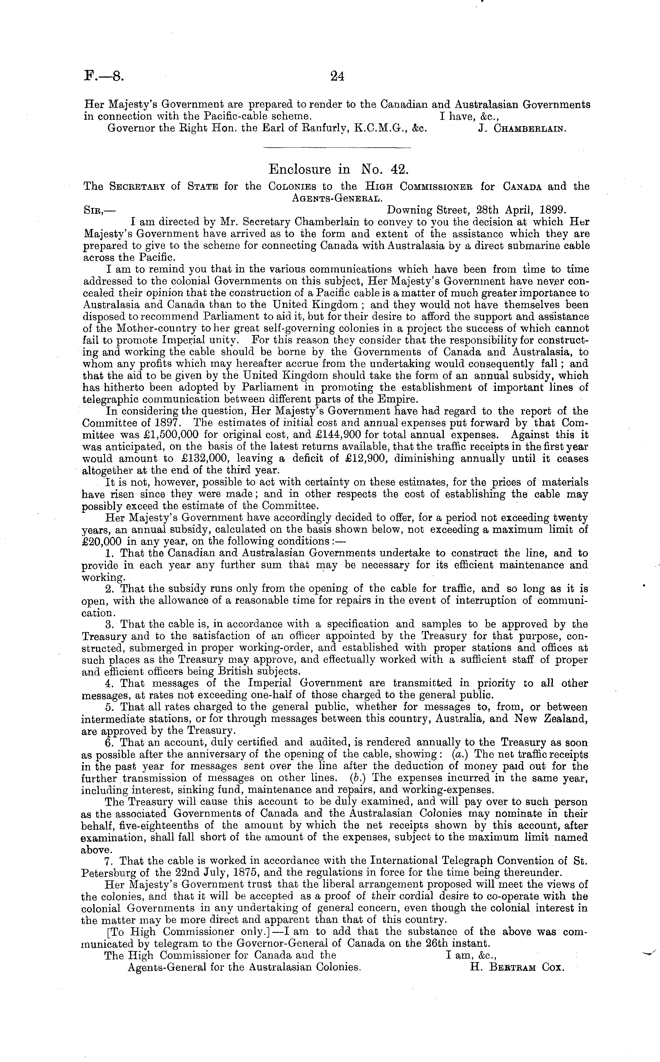 Enclosure in No. 42. The Seceetaby of State for the Colonies to the High Commissioneb for Canada and the AGENTS-GeNEEAL. Sir,— Downing Street, 28th April, 1899. I am directed by Mr. Secretary Chamberlain to convey to you the decision at which Her Majesty's Government have arrived as to the form and extent of the assistance which they are prepared to give to the scheme for connecting Canada with Australasia by a direct submarine cable across the Pacific. I am to remind you that in the various communications which have been from time to time addressed to the colonial Governments on this subject, Her Majesty's Government have never concealed their opinion that the construction of a Pacific cable is a matter of much greater importance to Australasia and Canada than to the United Kingdom ; and they would not have themselves been disposed to recommend Parliament to aid it, but for their desire to afford the support and assistance of the Mother-country to her great self-governing colonies in a project the success of which cannot fail to promote Imperial unity. For this reason they consider that the responsibility for constructing and working the cable should be borne by the Governments of Canada and Australasia, to whom any profits which may hereafter accrue from the undertaking would consequently fall; and that the aid to be given by the United Kingdom should take the form of an annual subsidy, which has hitherto been adopted by Parliament in promoting the establishment of important lines of telegraphic communication between different parts of the Empire. In considering the question, Her Majesty's Government have had regard to the report of the Committee of 1897. The estimates of initial cost and annual expenses put forward by that Committee was £1,500,000 for original cost, and £144,900 for total annual expenses. Against this it was anticipated, on the basis of the latest returns available, that the traffic receipts in the first year would amount to £132,000, leaving a deficit of £12,900, diminishing annually until it ceases altogether at the end of the third year. It is not, however, possible to act with certainty on these estimates, for the prices of materials have risen since they were made; and in other respects the cost of establishing the cable may possibly exceed the estimate of the Committee. Her Majesty's Government have accordingly decided to offer, for a period not exceeding twenty years, an annual subsidy, calculated on the basis shown below, not exceeding a maximum limit of £20,000 in any year, on the following conditions : — 1. That the Canadian and Australasian Governments undertake to construct the line, and to provide in each year any further sum that may be necessary for its efficient maintenance and working. 2. That the subsidy runs only from the opening of the cable for traffic, and so long as it is open, with the allowance of a reasonable time for repairs in the event of interruption of communication. 3. That the cable is, in accordance with a specification and samples to be approved by the Treasury and to the satisfaction of an officer appointed by the Treasury for that purpose, constructed, submerged in proper working-order, and established with proper stations and offices at such places as the Treasury may approve, and effectually worked with a sufficient staff of proper and efficient officers being British subjects. 4. That messages of the Imperial Government are transmitted in priority to all other messages, at rates not exceeding one-half of those charged to the general public. 5. That all rates charged to the general public, whether for messages to, from, or between intermediate stations, or for through messages between this country, Australia, and New Zealand, are approved by the Treasury. 6. That an account, duly certified and audited, is rendered annually to the Treasury as soon as possible after the anniversary of the opening of the cable, showing : (a.) The net traffic receipts in the past year for messages sent over the line after the deduction of money paid out for the further transmission of messages on other lines, (b.) The expenses incurred in the same year, including interest, sinking fund, maintenance and repairs, and working-expenses. The Treasury will cause this account to be duly examined, and will pay over to such person as the associated Governments of Canada and the Australasian Colonies may nominate in their behalf, five-eighteenths of the amount by which the net receipts shown by this account, after examination, shall fall short of the amount of the expenses, subject to the maximum limit named above. 7. That the cable is worked in accordance with the International Telegraph Convention of St. Petersburg of the 22nd July, 1875, and the regulations in force for the time being thereunder. Her Majesty's Government trust that the liberal arrangement proposed will meet the views of the colonies, and that it will be accepted as a proof of their cordial desire to co-operate with the colonial Governments in any undertaking of general concern, even though the colonial interest in the matter may be more direct and apparent than that of this country. [To High Commissioner only.] —I am to add that the substance of the above was communicated by telegram to the Governor-General of Canada on the 26th instant. The High Commissioner for Canada and the I am, &c, Agents-General for the Australasian Colonies. H. Bertram Cox.