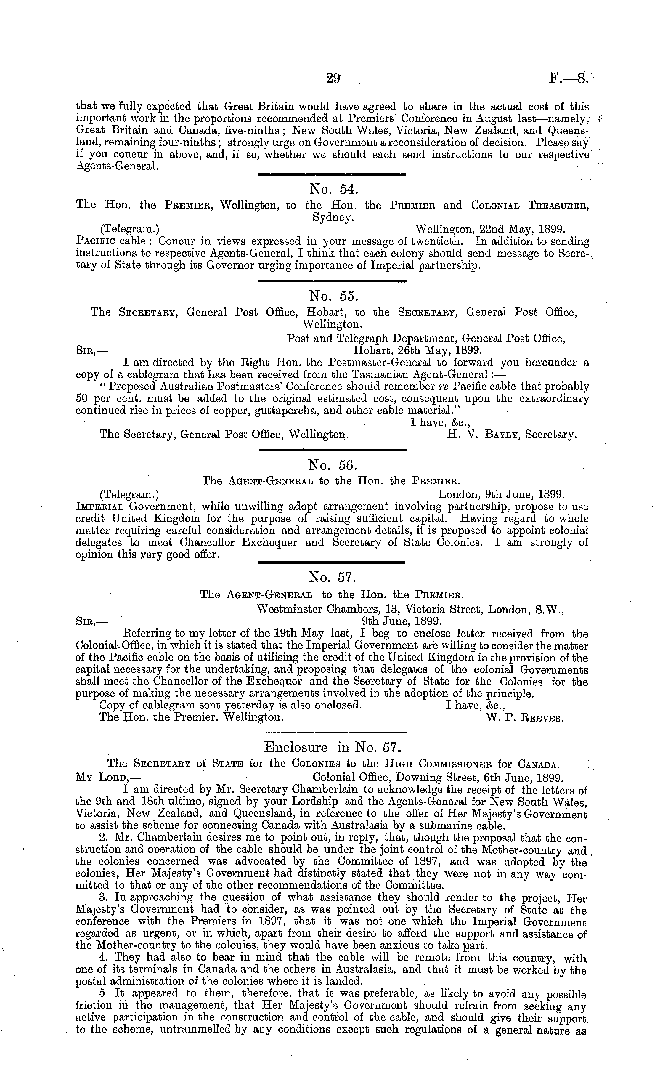 No. 57. The Agent-General to the Hon. the Premier. Westminster Chambers, 13, Victoria Street, London, S.W., Sir,— 9th June, 1899. Eeferring to my letter of the 19th May last, I beg to enclose letter received from the Colonial Office, in which it is stated that the Imperial Government are willing to consider the matter of the Pacific cable on the basis of utilising the credit of the United Kingdom in the provision of the capital necessary for the undertaking, and proposing that delegates of the colonial Governments shall meet the Chancellor of the Exchequer and the Secretary of State for the Colonies for the purpose of making the necessary arrangements involved in the adoption of the principle. Copy of cablegram sent yesterday is also enclosed. I have, &c, The Hon. the Premier, Wellington. W. P. Eeeves.
