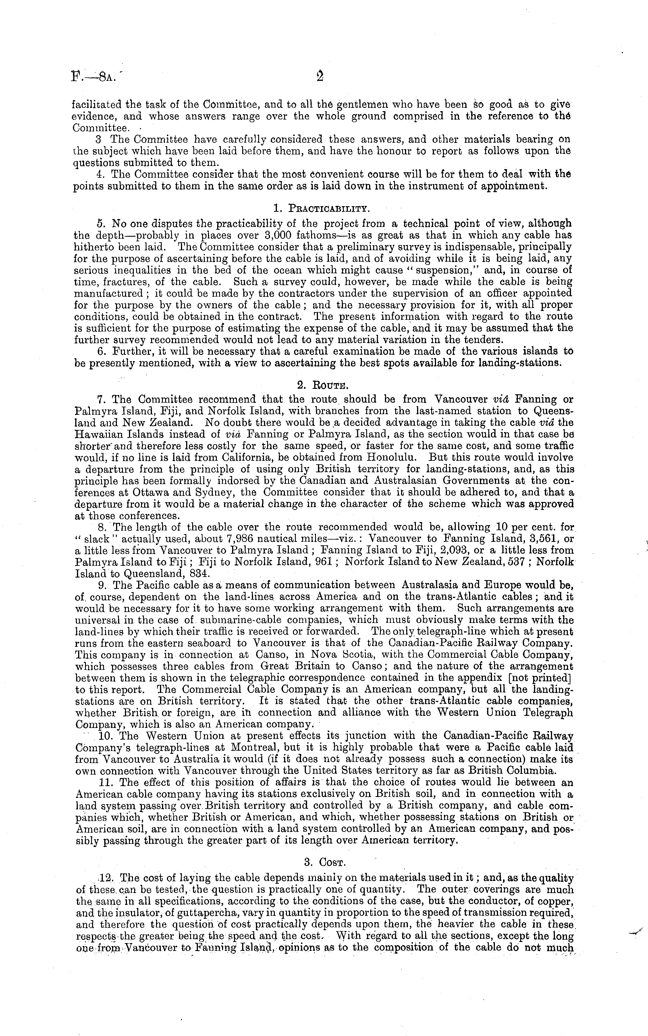 facilitated the task of the Committee, and to all the gentlemen who have been SO good as to give evidence, and whose answers range over the whole ground comprised in the reference to the Committee. • 3 The Committee have carefully considered these answers, and other materials bearing on the subject which have been laid before them, and have the honour to report as follows upon the questions submitted to them. 4. The Committee consider that the most convenient course will be for them to deal with the points submitted to them in the same order as is laid down in the instrument of appointment. l> Peacticability. 5. No one disputes the practicability of the project from a technical point of view, although the depth—probably in places over 3,000 fathoms—is as great as that in which any cable has hitherto been laid. The Committee consider that a preliminary survey is indispensable, principally for the purpose of ascertaining before the cable is laid, and of avoiding while it is being laid, any serious inequalities in the bed of the ocean which might cause " suspension," and, in course of time, fractures, of the cable. Such a survey could, however, be made while the cable is being manufactured ; it could be made by the contractors under the supervision of an officer appointed for the purpose by the owners of the cable ; and the necessary provision for it, with all proper conditions, could be obtained in the contract. The present information with regard to the route is sufficient for the purpose of estimating the expense of the cable, and it may be assumed that the further survey recommended would not lead to any material variation in the tenders. 6. Further, it will be necessary that a careful examination be made of the various islands to be presently mentioned, with a view to ascertaining the best spots available for landing-stations. 2. Eoute. 7. The Committee recommend that the route should be from Vancouver vid Fanning or Palmyra Island, Fiji, and Norfolk Island, with branches from the last-named station to Queensland and New Zealand. No doubt there would be a decided advantage in taking the cable vid the Hawaiian Islands instead of vid Fanning or Palmyra Island, as the section would in that case be shorter and therefore less costly for the same speed, or faster for the same cost, and some traffic would, if no line is laid from California, be obtained from Honolulu. But this route would involve a departure from the principle of using only British territory for landing-stations, and, as this principle has been formally indorsed by the Canadian and Australasian Governments at the conferences at Ottawa and Sydney, the Committee consider that it should be adhered to, and that a departure from it would be a material change in the character of the scheme which was approved at those conferences. 8. The length of the cable over the route recommended would be, allowing 10 per cent, for " slack" actually used, about 7,986 nautical miles —viz. : Vancouver to Fanning Island, 3,561, or a little less from Vancouver to Palmyra Island ; Fanning Island to Fiji, 2,093, or a little less from Palmyra Island to Fiji; Fiji to Norfolk Island, 961; Norfork Island to New Zealand, 537 ; Norfolk Island to Queensland, 834. 9. The Pacific cable as a means of communication between Australasia and Europe would be, of. course, dependent on the land-lines across America and on the trans-Atlantic cables; and it would be necessary for it to have some working arrangement with them. Such arrangements are universal in the case of submarine-cable companies, which must obviously make terms with the land-lines by which their traffic is received or forwarded. The only telegraph-line which at present runs from the eastern seaboard to Vancouver is that of the Canadian-Pacific Bailway Company. This company is in connection at Canso, in Nova Scotia, with the Commercial Cable Company, which possesses three cables from Great Britain to Canso; and the nature of the arrangement between them is shown in the telegraphic correspondence contained in the appendix [not printed] to this report. The Commercial Cable Company is an American company, but all the landingstations are on British territory. It is stated that the other trans-Atlantic cable companies, whether British or foreign, are in connection and alliance with the Western Union Telegraph Company, which is also an American company. 10. The Western Union at present effects its junction with the Canadian-Pacific Eailway Company's telegraph-lines at Montreal, but it is highly probable that were a Pacific cable laid from Vancouver to Australia it would (if it does not already possess such a connection) make its own connection with Vancouver through the United States territory as far as British Columbia. 11. The effect of this position of affairs is that the choice of routes would lie between an American cable company having its stations exclusively on British soil, and in connection with a land system passing over British territory and controlled by a British company, and cable companies which, whether British or American, and which, whether possessing stations on British or American soil, are in connection with a land system controlled by an American company, and possibly passing through the greater part of its length over American territory. 3. Cost. 12. The cost of laying the cable depends mainly on the materials used in it; and, as the quality of these, can be tested, the question is practically one of quantity. The outer coverings are much the same in all specifications, according to the conditions of the case, but the conductor, of copper, and the insulator, of guttapercha, vary in quantity in proportion to the speed of transmission required, and therefore the question of cost practically depends upon them, the heavier the cable in these respects the greater being the speed and the cost. With regard to all the sections, except the long one from Vancouver to Fanning Island, opi