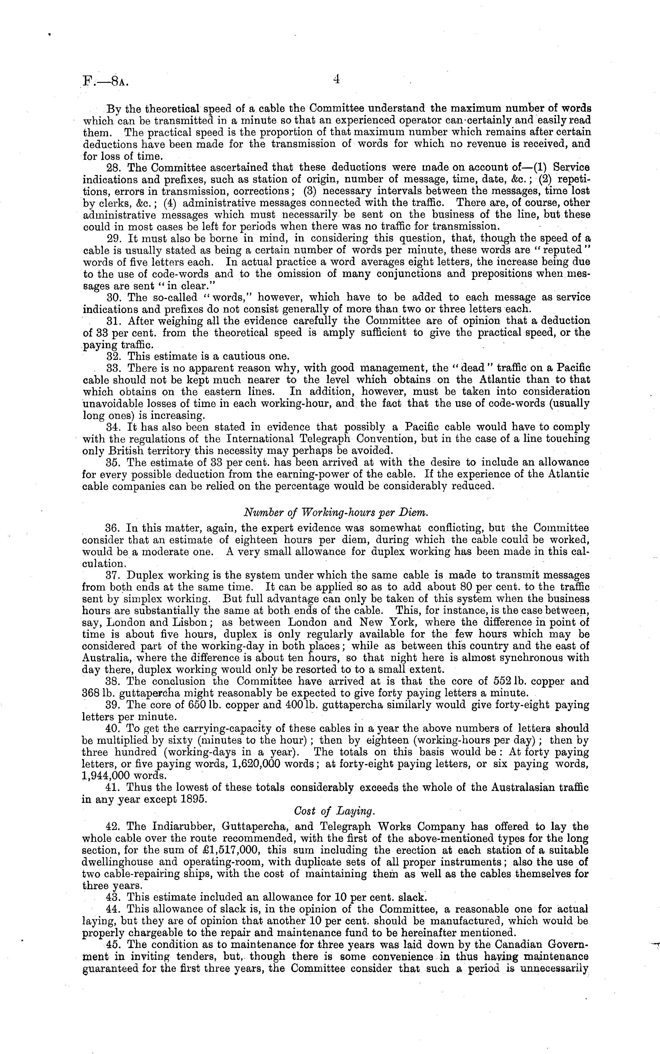 By the theoretical speed of a cable the Committee understand the maximum number of words which can be transmitted in a minute so that an experienced operator can certainly and easily read them. The practical speed is the proportion of that maximum number which remains after certain deductions have been made for the transmission of words for which no revenue is received, and for loss of time. 28. The Committee ascertained that these deductions were made on account of—(1) Service indications and prefixes, such as station of origin, number of message, time, date, &c.; (2) repetitions, errors in transmission, corrections; (3) necessary intervals between the messages, time lost by clerks, &c.; (4) administrative messages connected with the traffic. There are, of course, other administrative messages which must necessarily be sent on the business of the line, but these could in most cases be left for periods when there was no traffic for transmission. 29. It must also be borne in mind, in considering this question, that, though the speed of a cable is usually stated as being a certain number of words per minute, these words are " reputed " words of five letters each. In actual practice a word averages eight letters, the increase being due to the use of code-words and to the omission of many conjunctions and prepositions when messages are sent " in clear." 30. The so-called " words," however, which have to be added to each message as service indications and prefixes do not consist generally of more than two or three letters each. 31. After weighing all the evidence carefully the Committee are of opinion that a deduction of 33 per cent, from the theoretical speed is amply sufficient to give the practical speed, or the paying traffic. 32. This estimate is a cautious one. 33. There is no apparent reason why, with good management, the " dead " traffic on a Pacific cable should not be kept much nearer to the level which obtains on the Atlantic than to that which obtains on the eastern lines. In addition, however, must be taken into consideration unavoidable losses of time in each working-hour, and the fact that the use of code-words (usually long ones) is increasing. 34. It has also been stated in evidence that possibly a Pacific cable would have to comply with the regulations of the International Telegraph Convention, but in the case of a line touching only British territory this necessity may perhaps be avoided. 35. The estimate of 33 per cent, has been arrived at with the desire to include an allowance for every possible deduction from the earning-power of the cable. If the experience of the Atlantic cable companies can be relied on the percentage would be considerably reduced. Number of Working-hours per Diem. 36. In this matter, again, the expert evidence was somewhat conflicting, but the Committee consider that an estimate of eighteen hours per diem, during which the cable could be worked, would be a moderate one. A very small allowance for duplex working has been made in this calculation. 37. Duplex working is the system under which the same cable is made to transmit messages from both ends at the same time. It can be applied so as to add about 80 per cent, to the traffic sent by simplex working. But full advantage can only be taken of this system when the business hours are substantially the same at both ends of the cable. This, for instance, is the case between, say, London and Lisbon; as between London and New York, where the difference in point of time is about five hours, duplex is only regularly available for the few hours which may be considered part of the working-day in both places; whiJe as between this country and the east of Australia, where the difference is about ten hours, so that night here is almost synchronous with day there, duplex working would only be resorted to to a small extent. 38. The conclusion the Committee have arrived at is that the core of 552 lb. copper and 368 lb. guttapercha might reasonably be expected to give forty paying letters a minute. 39. The core of 650 lb. copper and 400 lb. guttapercha similarly would give forty-eight paying letters per minute. 40. To get the carrying-capacity of these cables in a year the above numbers of letters should be multiplied by sixty (minutes to the hour) ; then by eighteen (working-hours per day); then by three hundred (working-days in a year). The totals on this basis would be :At forty paying letters, or five paying words, 1,620,000 words; at forty-eight paying letters, or six paying words, 1,944,000 words. 41. Thus the lowest of these totals considerably exceeds the whole of the Australasian traffic in any year except 1895. Cost of Laying. 42. The Indiarubber, Guttapercha, and Telegraph Works Company has offered to lay the whole cable over the route recommended, with the first of the above-mentioned types for the long section, for the sum of £1,517,000, this sum including the erection at each station of a suitable dwellinghouse and operating-room, with duplicate sets of all proper instruments; also the use of two cable-repairing ships, with the cost of maintaining them as well as the cables themselves for three years. 43. This estimate included an allowance for 10 per cent, slack. 44. This allowance of slack is, in the opinion of the Committee, a reasonable one for actual laying, but they are of opinion that another 10 per cent, should be manufactured, which would be properly chargeable to the repair and maintenance fund to be hereinafter mentioned. 45. The condition as to maintenance for three years was laid down by the Canadian Government in inviting tenders, but, though there is some convenience in thus having maintenance guaranteed for the first three years, the Committee consider that such a period is unnecessarily