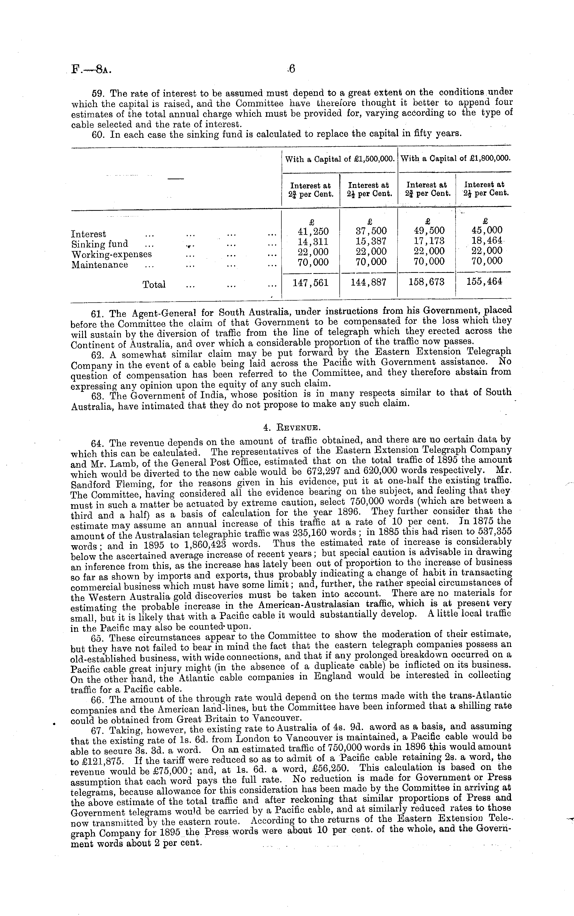 61 The Agent-General for South Australia, under instructions from his Government, placed before the Committee the claim of that Government to be compensated for the loss which they will sustain by the diversion of traffic from the line of telegraph which they erected across the Continent of Australia, and over which a considerable proportion of the traffic now passes. 62. A somewhat similar claim may be put forward by the Eastern Extension Telegraph Company in the event of a cable being laid across the Pacific with Government assistance. No question of compensation has been referred to the Committee, and they therefore abstain from expressing any opinion upon the equity of any such claim. 63. The Government of India, whose position is in many respects similar to that of boutn Australia, have intimated that they do not propose to make any such claim. 4. Be venue. 64 The revenue depends on the amount of traffic obtained, and there are no certain data by which this can be calculated. The representatives of the Eastern Extension Telegraph Company and Mr Lamb of the General Post Office, estimated that on the total traffic of 1895 the amount which would be diverted to the new cable would be 672,297 and 620,000 words respectively. Mr. Sandford Fleming, for the reasons given in his evidence, put it at one-half the existing traffic. The Committee having considered all the evidence bearing on the subject, and feeling that they must in such a matter be actuated by extreme caution, select 750,000 words (which are between a third and a half) as a basis of calculation for the year 1896. They further consider that the estimate may assume an annual increase of this traffic at a rate of 10 per cent. In 1870 the amount of the Australasian telegraphic traffic was 235,160 words ; in 1885 this had risen to 537,355 words • and in 1895 to 1,860,423 words. Thus the estimated rate of increase is considerably below the ascertained average increase of recent years ; but special caution is advisable in drawing an inference from this, as the increase has lately been out of proportion to the increase of business so far as shown by imports and exports, thus probably indicating a change of habit in transacting commercial business which must have some limit; and, further, the rather special circumstances of the Western Australia gold discoveries must be taken into account. There are no materials tor estimating the probable increase in the American-Australasian traffic, which is at present very small, but it is likely that with a Pacific cable it would substantially develop. A little local traffic in the Pacific may also be counted-upon. . 65 These circumstances appear to the Committee to show the moderation of their estimate, but they have not failed to bear in mind the fact that the eastern telegraph companies possess an old-established business, with wide connections, and that if any prolonged breakdown occurred on a Pacific cable great injury might (in the absence of a duplicate cable) be inflicted on its business. On the other hand, the Atlantic cable companies in England would be interested in collecting traffic for a Pacific cable. . 66 The amount of the through rate would depend on the terms made with the trans-Atlantic companies and the American land-lines, but the Committee have been informed that a shilling rate could be obtained from Great Britain to Vancouver. _ 67 Taking however, the existing rate to Australia of 4s. 9d. aword as a basis, and assuming that the existing rate of Is. 6d. from London to Vancouver is maintained, a Pacific cable would be able to secure 3s. 3d. a word. On an estimated traffic of 750,000 words in 1896 this would amount to £121 875 If the tariff were reduced so as to admit of a Pacific cable retaining 2s. a word, the revenue' would be £75,000; and, at Is. 6d. a word, £56,250. This calculation is based on the assumption that each word pays the full rate. No reduction is made for Government or Press telegrams because allowance for this consideration has been made by the Committee in arriving at the above'estimate of the total traffic and after reckoning that similar proportions of Press and Government telegrams would be carried by a Pacific cable, and at similarly reduced rates to those now transmitted by the eastern route. According to the returns of the Eastern Extension Telegraph Company for 1895 the Press words were about 10 per cent, of the whole, and the Government words about 2 per cent. ... . ......