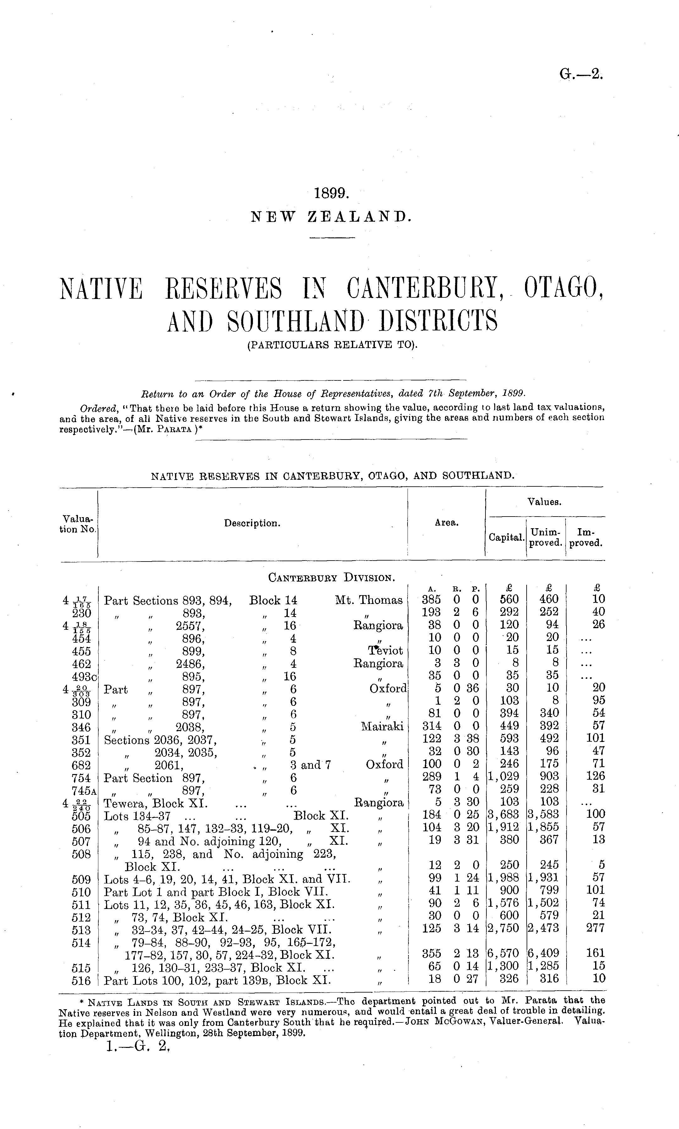 Return to an Order of the House of Representatives, dated 7th September, 1899. Ordered, "That there be laid before this House a return showing the value, according 10 last land tax valuations, and the area, of all Native reserves in the South and Stewart lelands, giving the areas and numbers of each section respectively."—(Mr. Pabata )*
