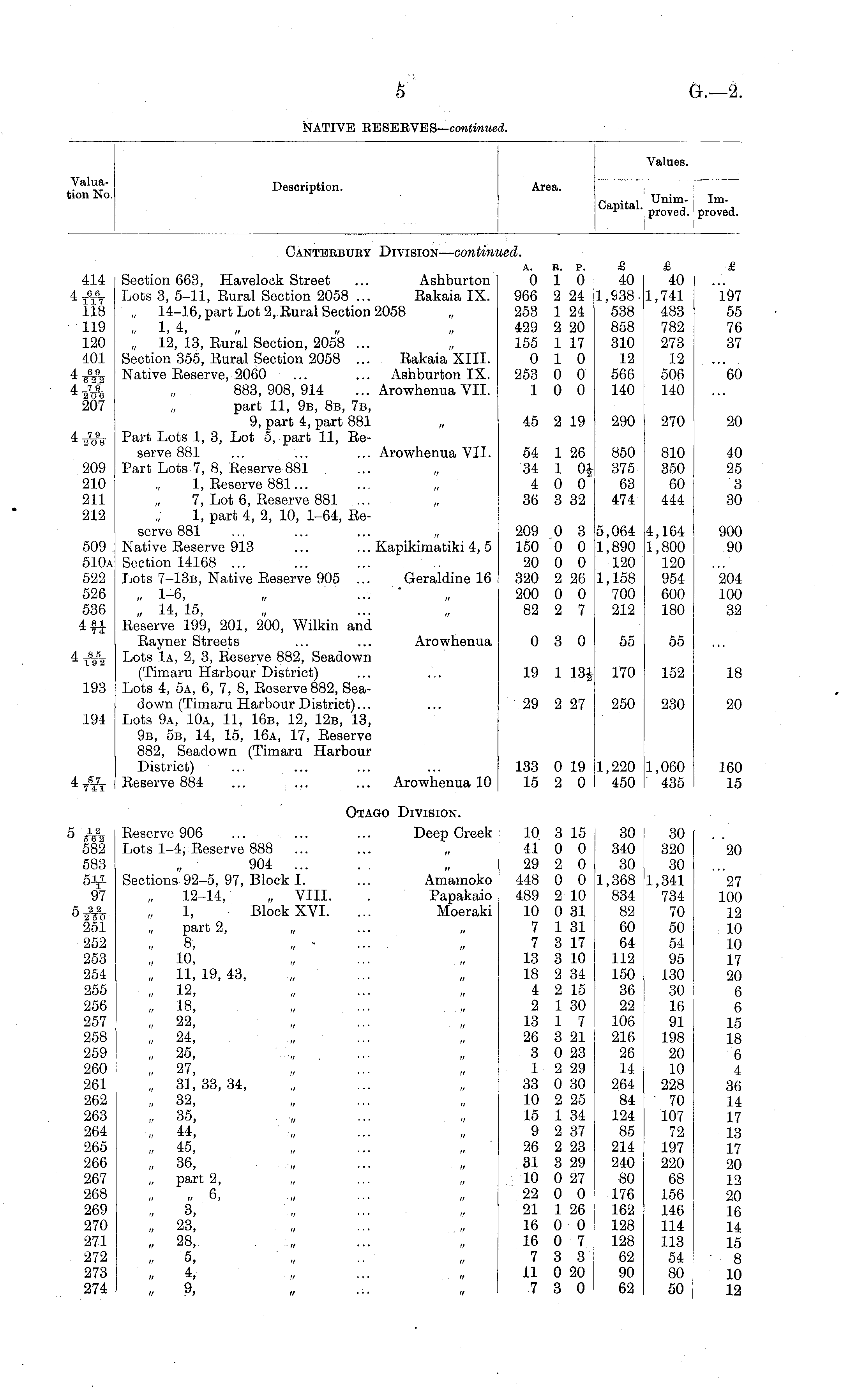 Valuation No. Description. Area. Values. Capital. Unin V ; Im " * proved, proved. I Oantebbuey Division — contim wd. 414 A 68 4 TTT 118 119 120 401 A 69 * Iβ F2 4 TS^β 207 Section 663, Havelook Street ... Ashburton Lots 3, 5-11, Eural Section 2058 ... Eakaia IX. „ 14-16, part Lot 2, Eural Section 2058 "„ 12, 13, Eural Section, 2058 ... "„ Section 355, Eural Section 2058 ... Eakaia XIII. Native Eeserve, 2060 ... ... Ashburton IX. 883,908,914 ... Arowhenua VII. part 11, 9b, 8b, 7b, 9, part 4, part 881 Part Lots 1, 3, Lot 5, part 11, Eeserve 881 ... ... ... Arowhenua VII. Part Lots 7, 8, Eeserve 881 „ 1, Eeserve 881... ... „ 7, Lot 6, Eeserve 881 ... 1, part 4, 2, 10, 1-64, Eeserve 881 ... ... ... „ Native Eeserve 913 ... ... Kapikimatiki 4, 5 Section 14168 ... Lots 7-13b, Native Eeserve 905 ... Geraldine 16 „ 1-6, „ 14,15, Eeserve 199, 201, 200, Wilkin and Eayner Streets ... ... Arowhenua Lots Iα, 2, 3, Eeserve 882, Seadown (Timaru Harbour District) Lots 4, 5a, 6, 7, 8, Eeserve 882, Seadown (Timaru Harbour District)... Lots 9a, 10a, 11, 16b, 12, 12b, 13, 9b, 5b, 14, 15, 16a, 17, Eeserve 882, Seadown (Timaru Harbour District) ... ... Eeserve 884 ... ... ... Arowhenua 10 A. R. P. 0 10 966 2 24 253 1 24 429 2 20 155 1 17 0 10 253 0 0 10 0 £ 40 1,938538 858 310 12 566 140 £ 40 [1,741 483 782 273 12 506 140 £ 197 55 76 37 60 45 2 19 290 270 20 ±m 54 1 26 34 1 0i 4 0 0 36 3 32 850 375 63 474 810 350 60 444 40 25 3 30 209 210 211 212 509 . 510a 522 526 536 4 8.1 * 14, 209 0 3 150 0 0 20 0 0 320 2 26 200 0 0 82 2 7 5,064 1,890 120 1,158 700 212 4,164 1,800 120 954 600 180 900 90 204 100 32 0 3 0 55 55 4 T 8 A 19 1 131 170 152 18 193 250 230 20 194 29 2 27 133 0 19 15 2 0 1,220 450 1,060 435 160 15 4//t Otago Division. 10 3 15 i 41 0 0 29 2 0 448 0 0 489 2 10 10 0 31 7 1 31 7 3 17 13 3 10 18 2 34 4 2 15 2 1 30 13 1 7 26 3 21 3 0 23 1 2 29 33 0 30 10 2 25 15 1 34 9 2 37 26 2 23 31 3 29 10 0 27 22 0 0 I 21 1 26 16 0 0 16 0 7 7 3 3 11 0 20 7 3 0 j 30 340 30 1,368 834 82 60 64 112 150 36 22 106 216 26 14 264 84 124 85 214 240 80 176 162 128 128 62 90 62 30 320 30 1,341 734 70 50 54 95 130 30 16 91 198 20 10 228 70 107 72 197 220 68 156 146 114 113 54 80 50 5 k\ 582 583 5¥ 97 K 2 2 251 252 253 254 255 256 257 258 259 260 261 262 263 264 265 266 267 268 269 270 271 . 272 273 274 Eeserve 906 ... ... ... Deep Creek Lots 1-4, Eeserve 888 ... ... „ 904 ... Sections 92-5, 97, Block I. ... Amamoko 12-14, „ VIII. . Papakaio 1, ■ Block XVI. ... Moeraki part 2, „ ... „ 8, „ • „ 10, „ 11,19,43, „ 12, „ 18, „ 22, „ 24, „ ■ „ 25, .„ . „ 27, „ 3], 33, 34, „ 32, „ 35, „ 44, „ 45, „ 36, part 2, „ ... „ i, n 6, „ ... „ II "! II ••• II „ 23, „ 28, .„ ... „ „ 5, ■ tt * • • rr it Pt tf • • • tr 20 27 100 12 10 10 17 20 6 6 15 18 6 4 36 14 17 13 17 20 12 20 16 14 15 8 10