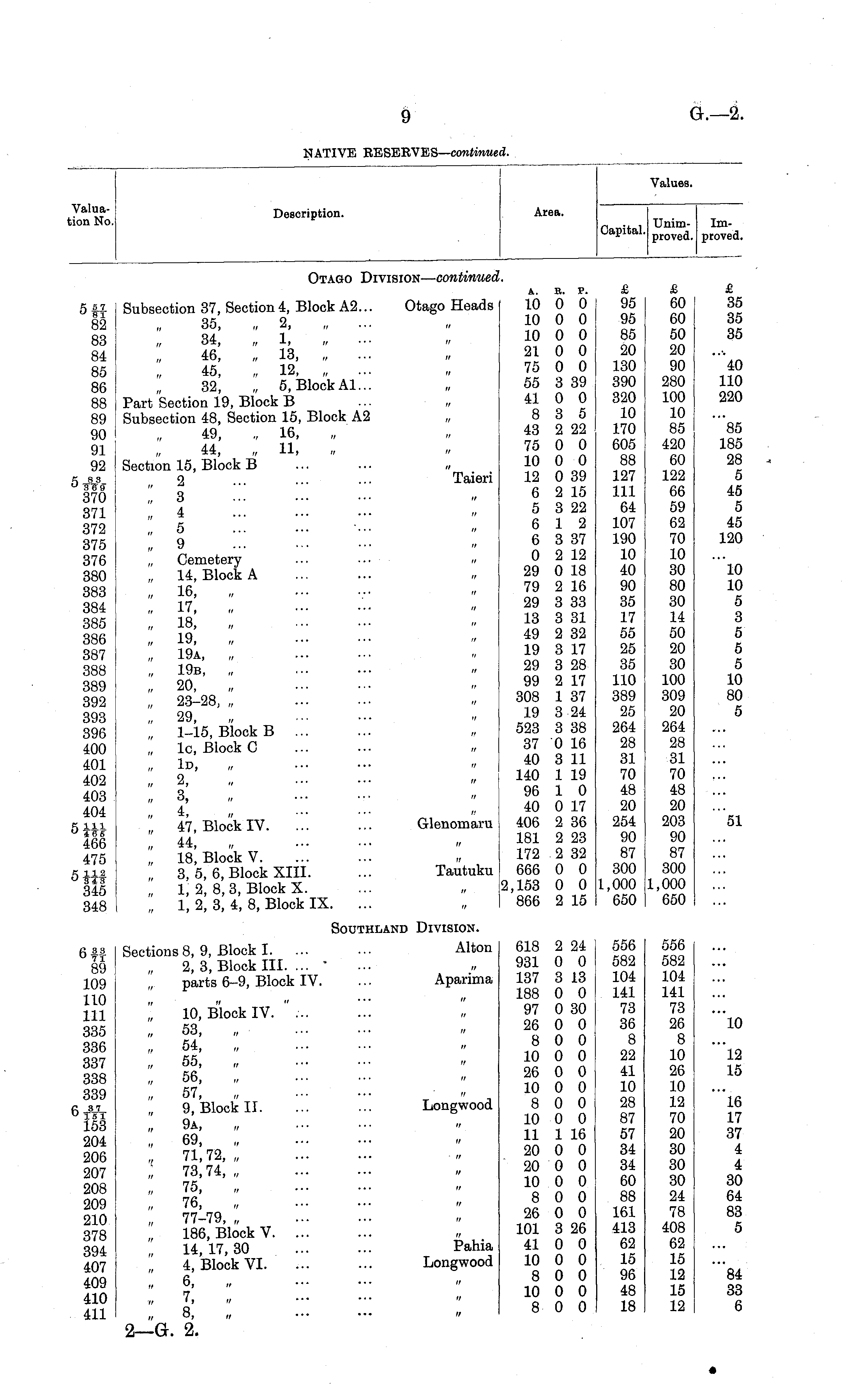 Valuation No. Description. I Area. Values. n ., , Unim- ImOapital. proyed proved> Values. Otago Division — continuec 5 If 82 83 84 85 86 88 89 90 91 92 X, 83 370 371 372 375 376 380 383 384 385 386 387 388 389 392 393 396 400 401 402 403 404 s m 466 475 K 112 0 3"T3345 348 Subsection 37, Section 4, Block A2... Otago Heads 35, „ 2, 34, „ 1, 46, „ 13, 45, „ 12, „ ... 32, „ 5, Block Al... Part Section 19, Block B Subsection 48, Section 15, Block A2 „ 49, , 16, 44, „ 11, Section 15, Block B 2 ... ■•• •■■ Taieri "„ 3 „ 4 „ 5 „ 9 „ Cemetery ... ... „ „ 14, Block A „ 16, „ „ 17, „ „ 18, „ „ 19, „ „ 19a, „ „ 19b, „ „ 20, „ „ 23-28, „ „ 29, „ 1-15, Block B ... lc, Block C „ Id, „ ••• ••• " „ 2, „ „ 3, „ „ 4, 47, Block IV. ... ... Glenomaru „ 44, „ „ 18, Block V. 3, 5, 6, Block XIII. ... Tautuku „ 1, 2, 8, 3, Block X. „ 1, 2, 3, 4, 8, Block IX. ... A. B. P. 10 0 0 10 0 0 10 0 0 21 0 0 75 0 0 55 3 39 41 0 0 8 3 5 43 2 22 75 0 0 10 0 0 12 0 39 6 2 15 5 3 22 6 12 6 3 37 0 2 12 29 0 18 79 2 16 29 3 33 13 3 31 49 2 32 19 3 17 29 3 28 99 2 17 308 1 37 19 3 24 523 3 38 37 0 16 40 3 11 140 1 19 96 1 0 40 0 17 406 2 36 181 2 23 172 2 32 666 0 0 2,153 0 0 866 2 15 £ 95 95 85 20 130 390 320 10 170 605 88 127 111 64 107 190 10 40 90 35 17 55 25 35 110 389 25 264 28 31 70 48 20 254 90 87 300 1,000 650 £ 60 60 50 20 90 280 100 10 85 420 60 122 66 59 62 70 10 30 80 30 14 50 20 30 100 309 20 264 28 31 70 48 20 203 90 87 300 1,000 650 £ 35 35 35 40 110 220 85 185 28 5 45 5 45 120 10 10 5 3 5 5 5 10 80 5 51 Southland Division. 618 2 24 931 0 0 137 3 13 188 0 0 97 0 30 26 0 0 8 0 0 10 0 0 26 0 0 10 0 0 8 0 0 10 0 0 11 1 16 20 0 0 20 0 0 10 0 0 8 0 0 26 0 0 101 3 26 41 0 0 10 0 0 8 0 0 10 0 0 8 0 0 556 582 104 141 73 36 8 22 41 10 28 87 57 34 34 60 88 161 413 62 15 96 48 18 556 582 104 141 73 26 8 10 26 10 12 70 20 30 30 30 24 78 408 62 15 12 15 12 6 3.3. ° 71 89 109 110 111 335 336 337 338 339 6t¥t 153 204 206 207 208 209 210 378 394 407 409 410 411 Sections 8,9, Block I Alton 2, 3, Block III. ... " parts 6-9, Block IV. ... Aparima "„ 10, Block IV. "... „ 53, •■• ••• » „ 54, „ „ OO, ,t •" • ■ • " 56, 57, 9, Block II. ... ■■• Longwood „ 69, „ , 71,72, ,; 73,74, „ „ 75, 76, „ 77-79, „ 186, Block V. ... 14, 17,30 Pahia 4, Block VI. ... ••• Longwood „ 6, „ ••• ••• t, „ 7, » ■•• •■• " „ 8, „ -•• ••• » 10 '"l2 15 16 17 37 4 4 30 64 83 5 84 33 6